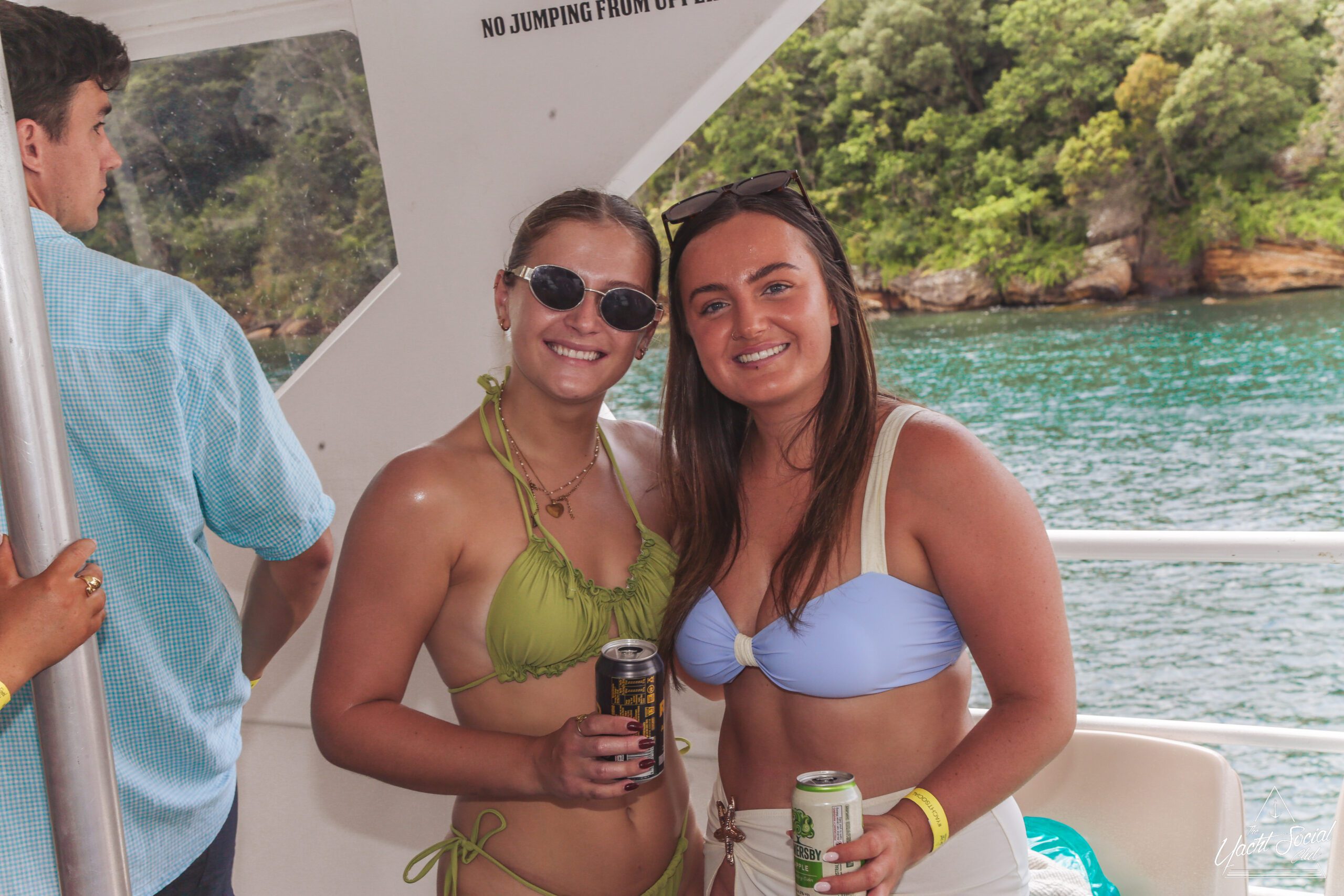 Two women in swimsuits, sunglasses, and wristbands smile and hold drinks on a boat. There is water and greenery visible through the window, and other people around them.