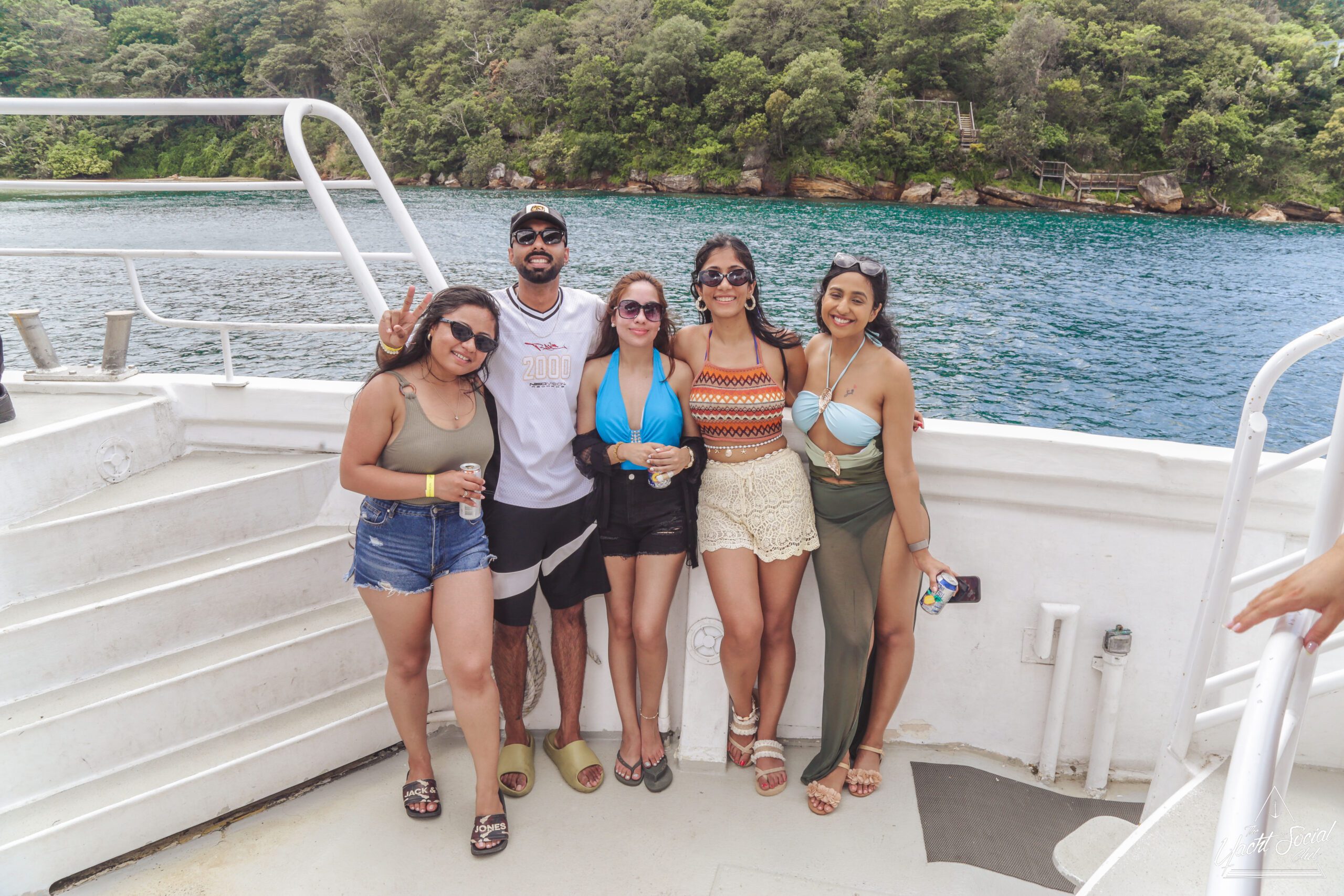 Five people stand together smiling on a boat deck, dressed in summer clothing and swimwear, with lush green trees and blue water visible in the background.