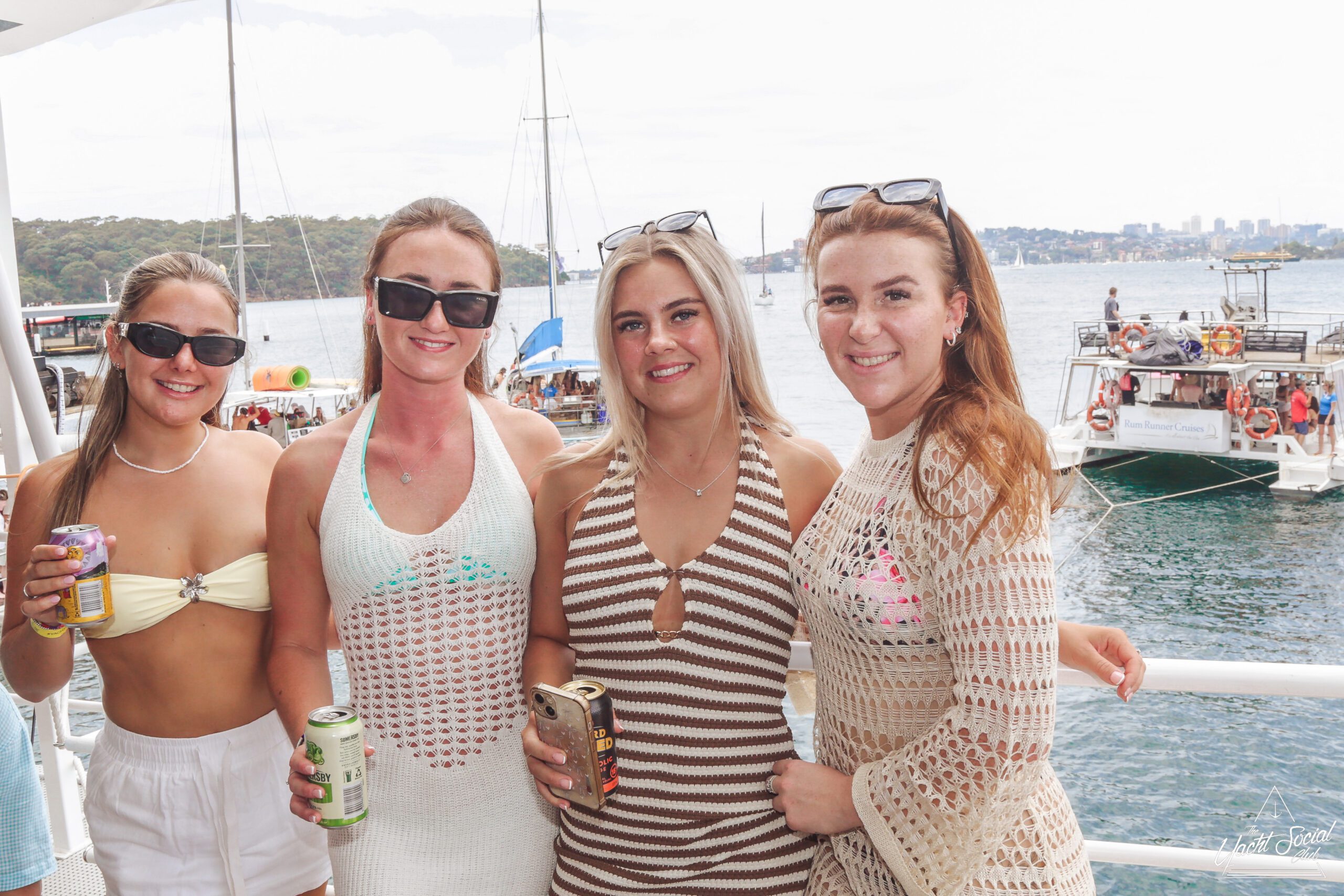 Four young women in summery knit outfits stand on a boat, smiling at the camera and holding drinks. Behind them, there are other boats and people on the water, suggesting a festive atmosphere.