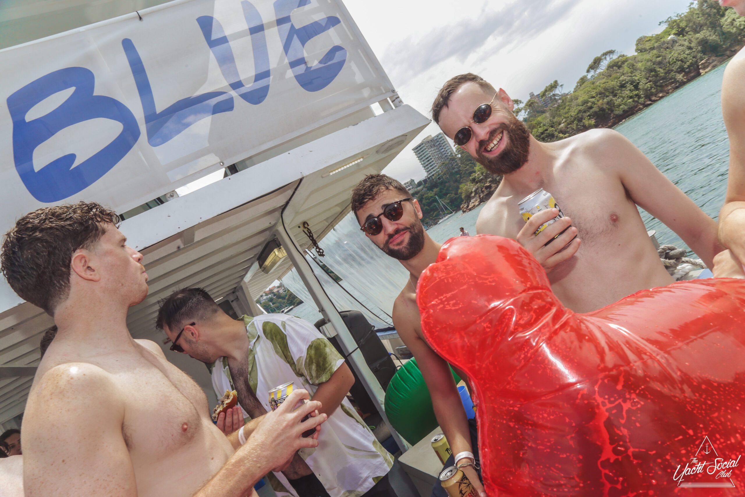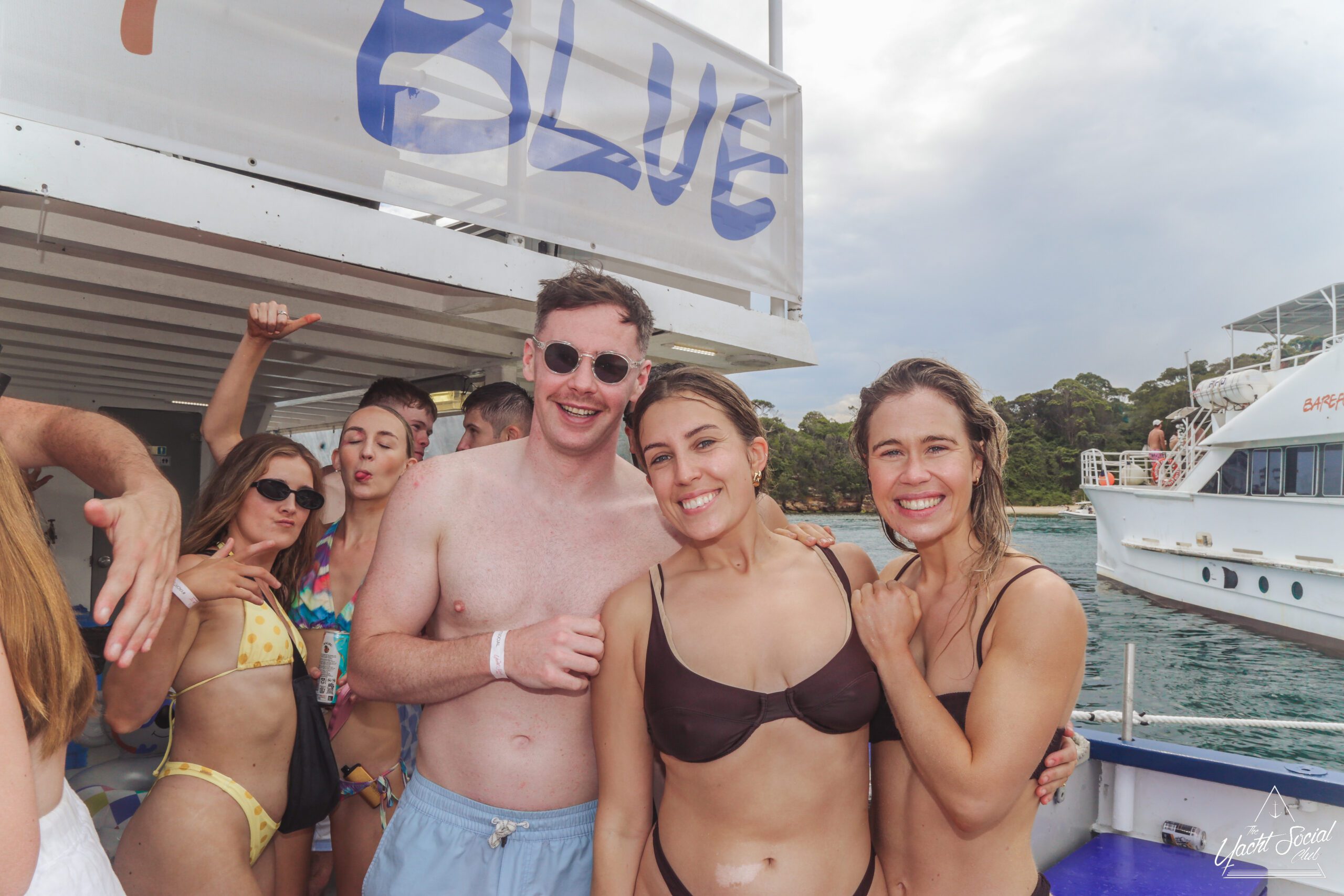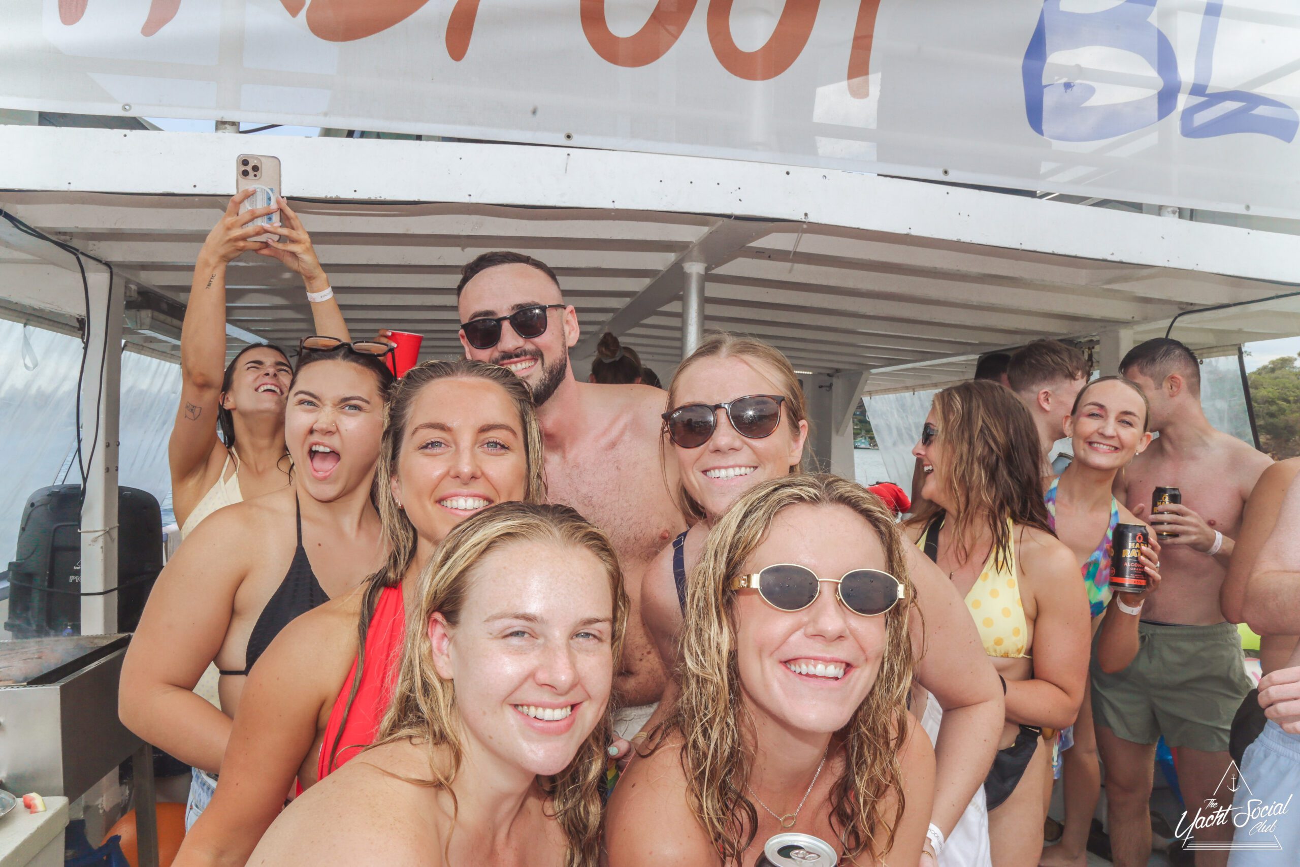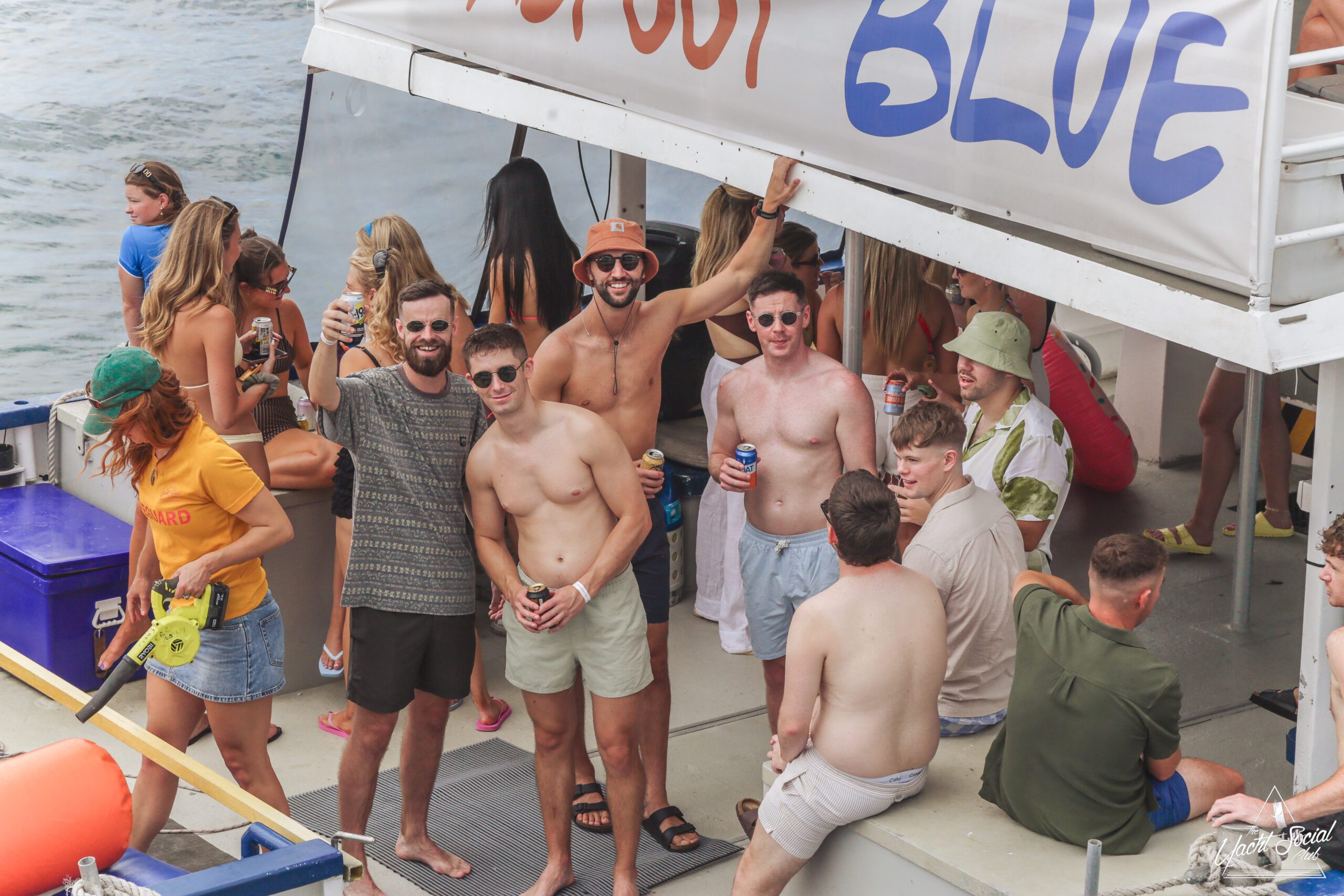 A group of young adults are partying on a boat, smiling and holding drinks. Some are wearing swimsuits and sunglasses. The atmosphere is lively, with people chatting and posing under a canopy labeled “BLUE” near the water.