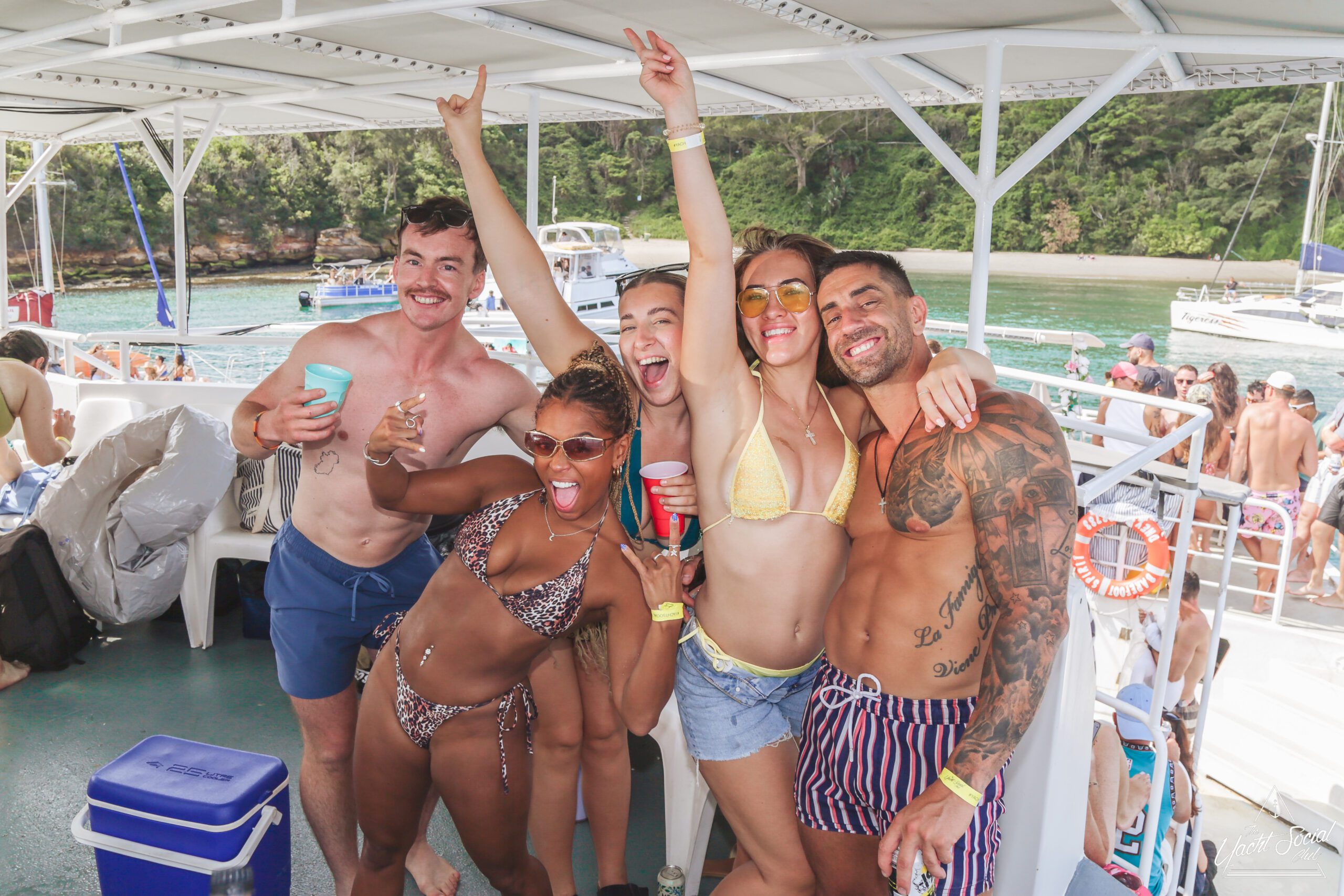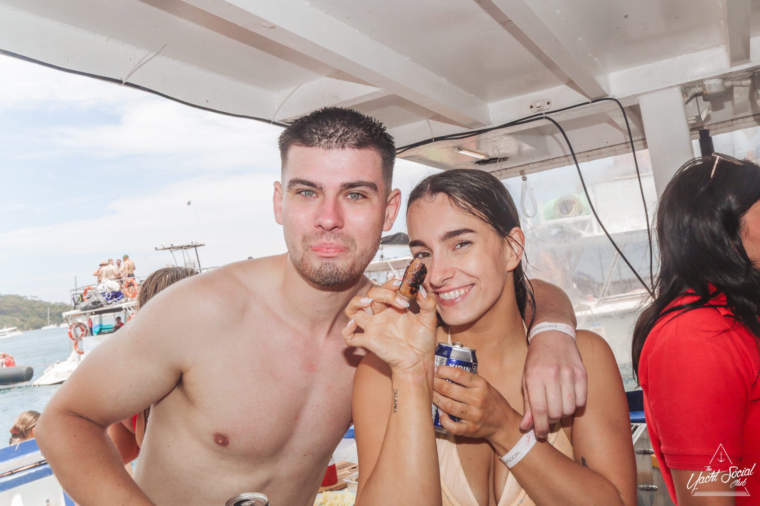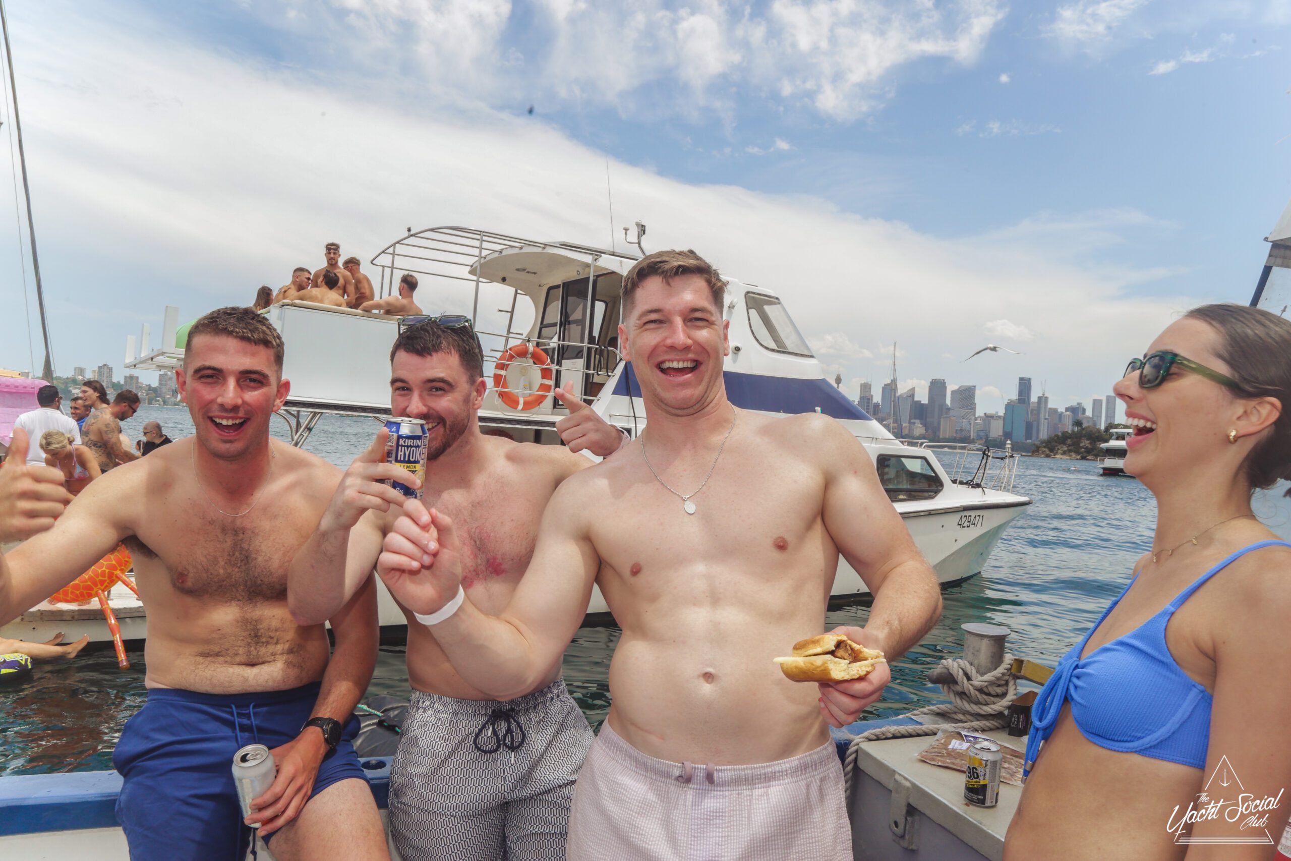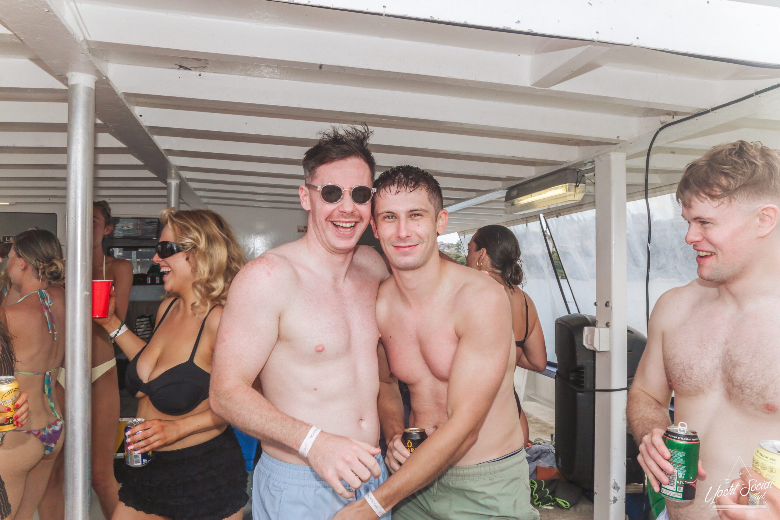 Young adults enjoy a lively boat party on a sunny day, with one shirtless man in the foreground holding drinks and people dancing behind him. Other boats and swimmers are visible on the blue water.