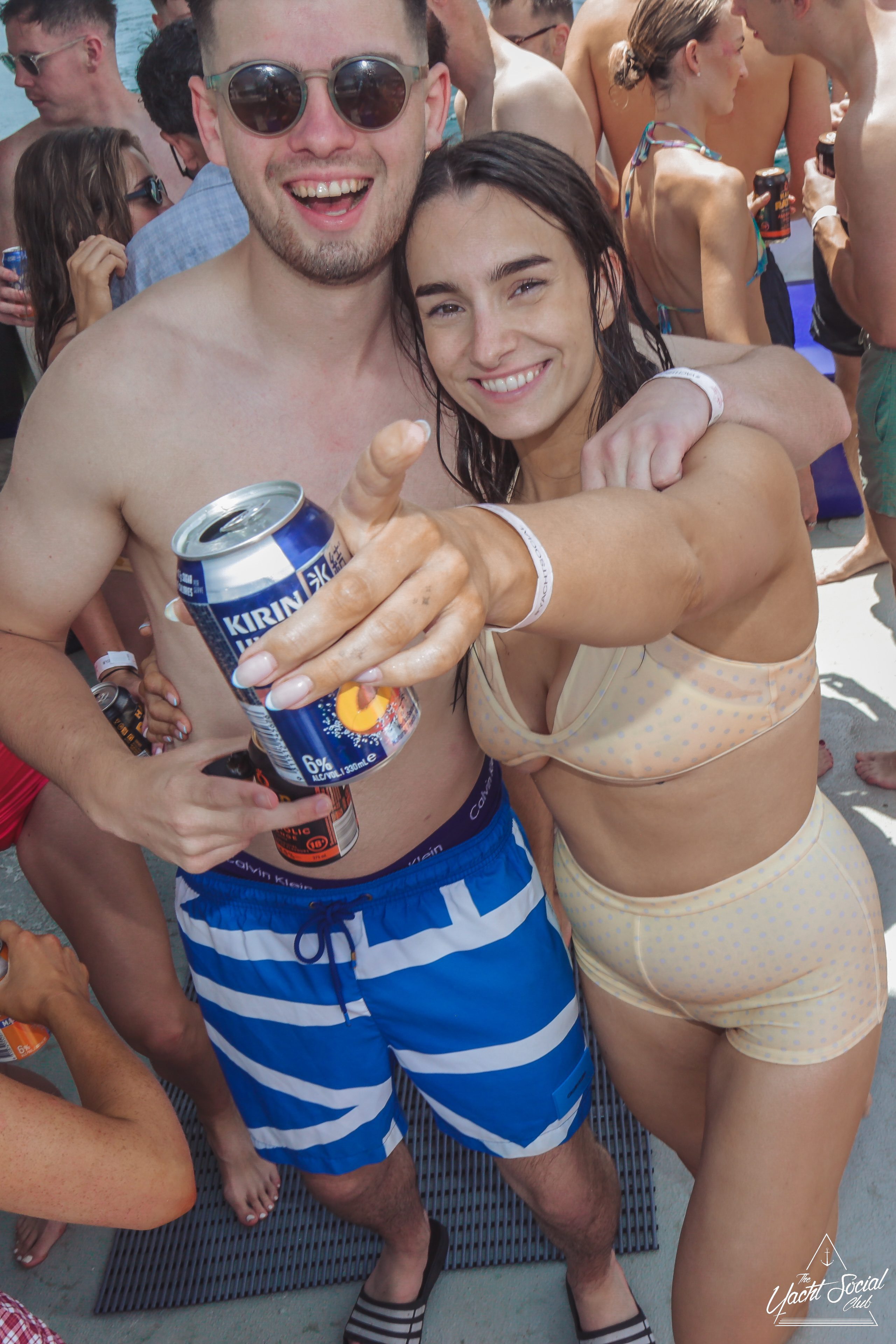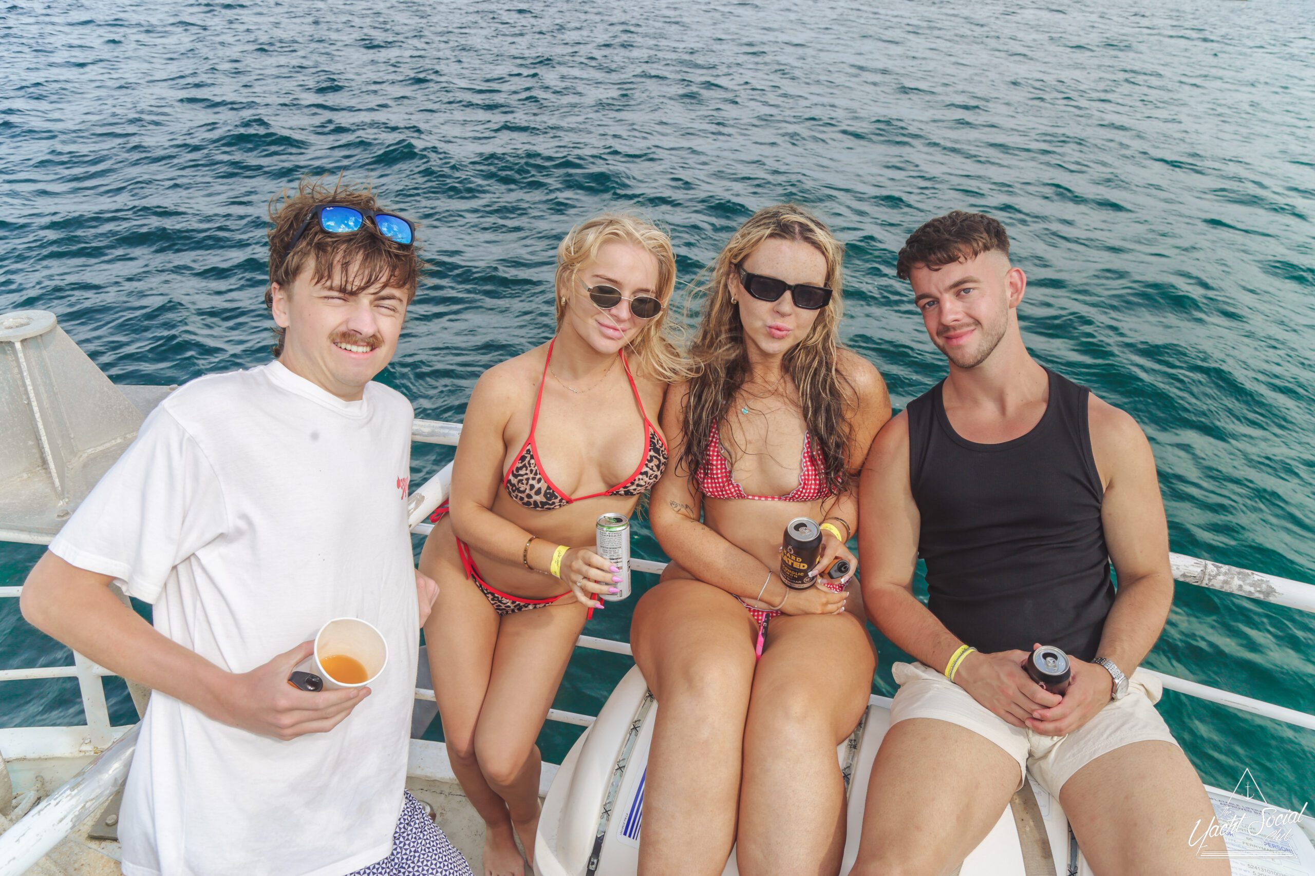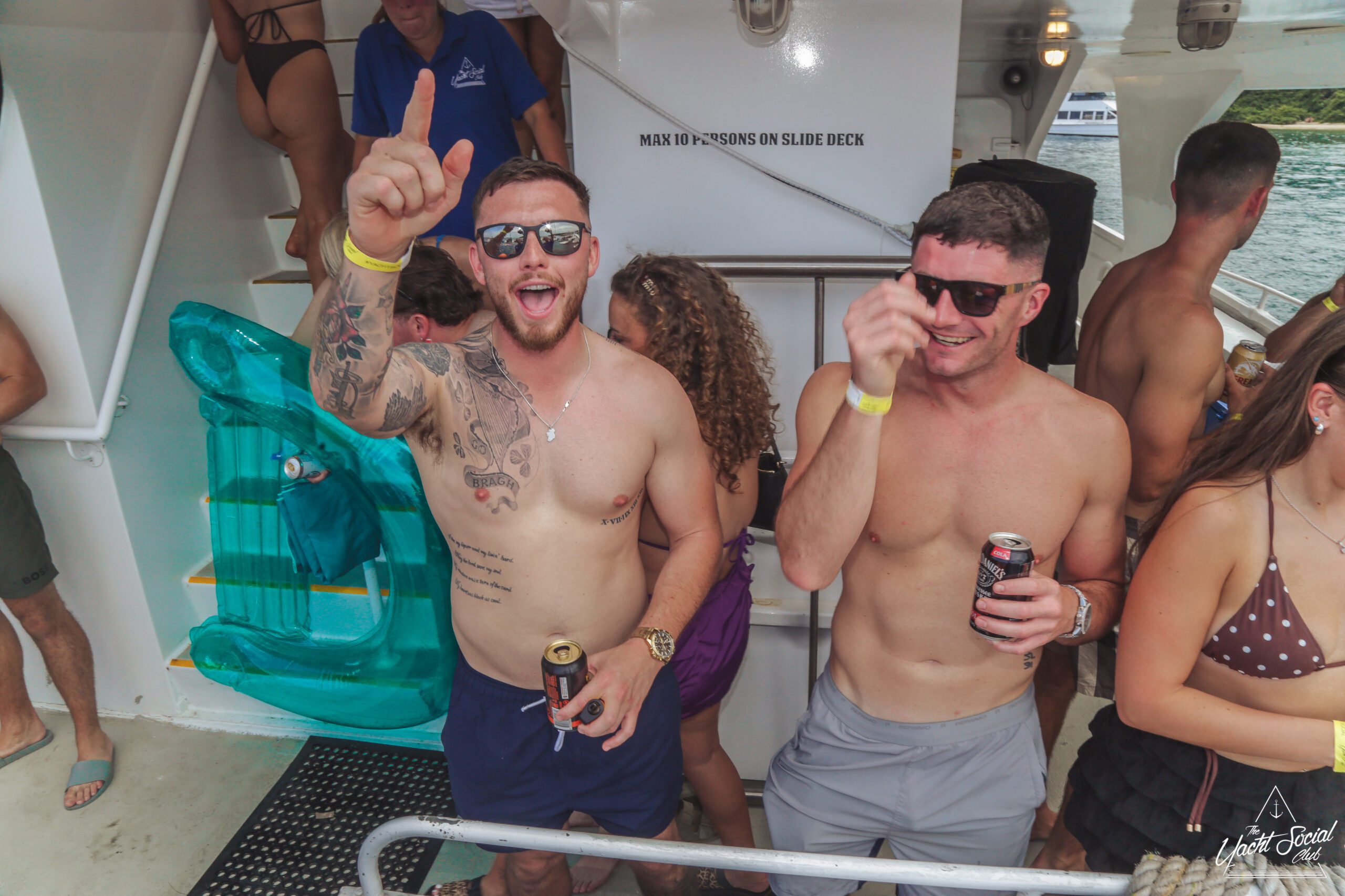 Young adults enjoy a lively boat party on a sunny day, with one shirtless man in the foreground holding drinks and people dancing behind him. Other boats and swimmers are visible on the blue water.