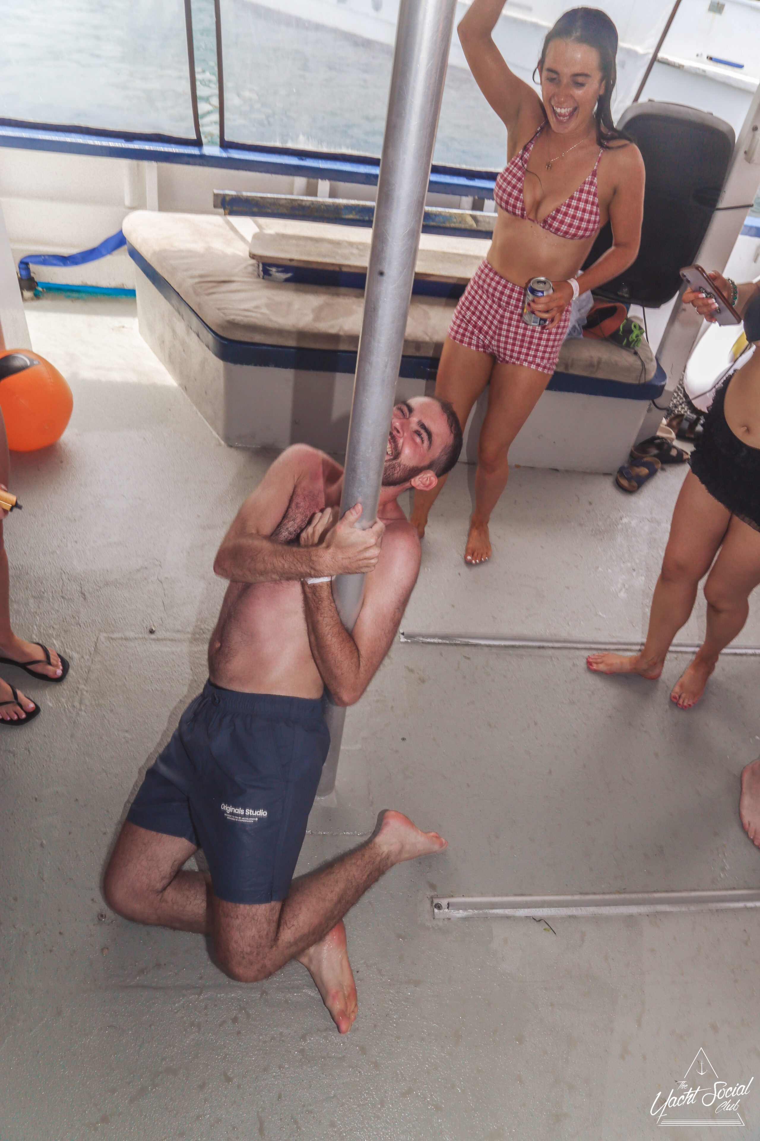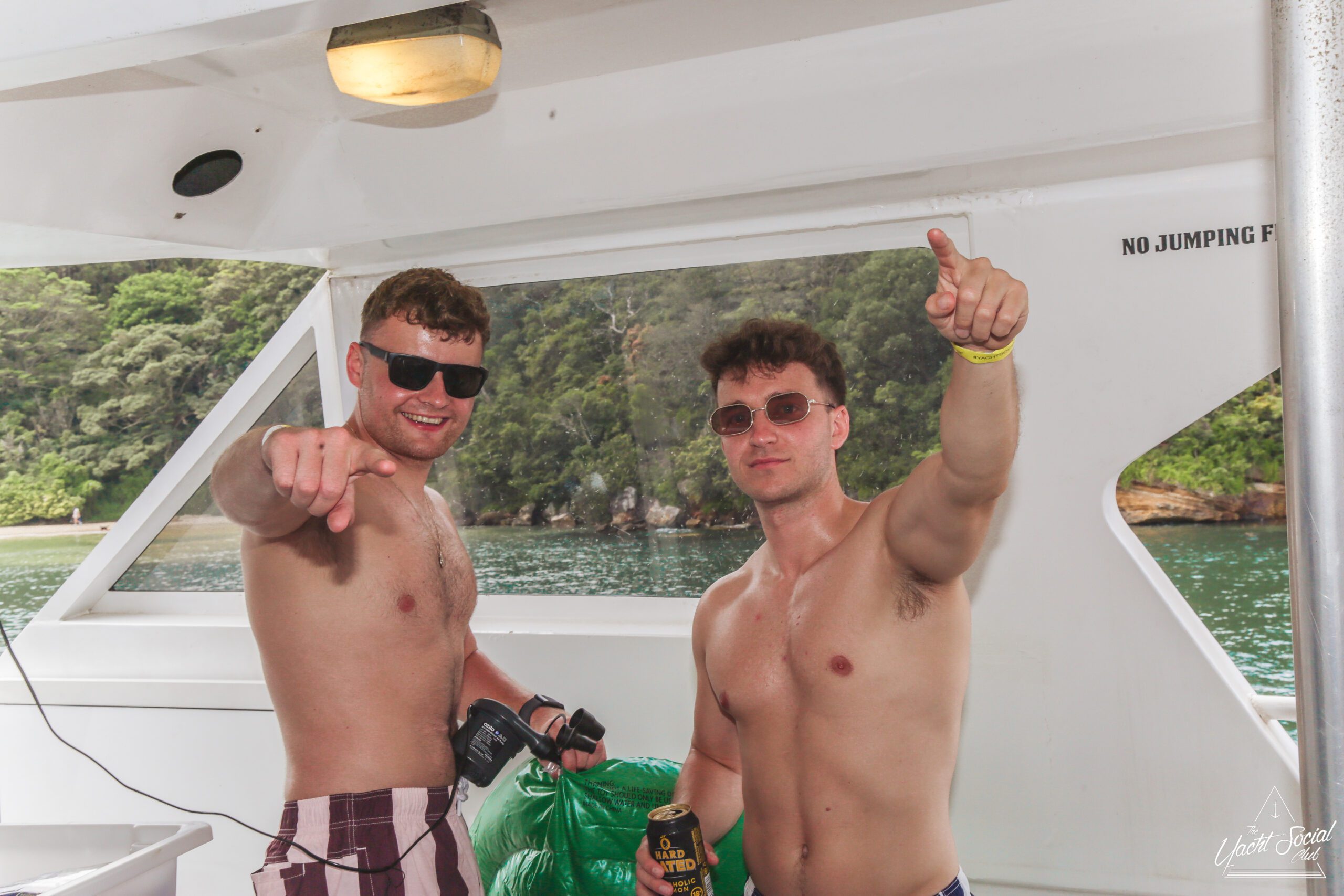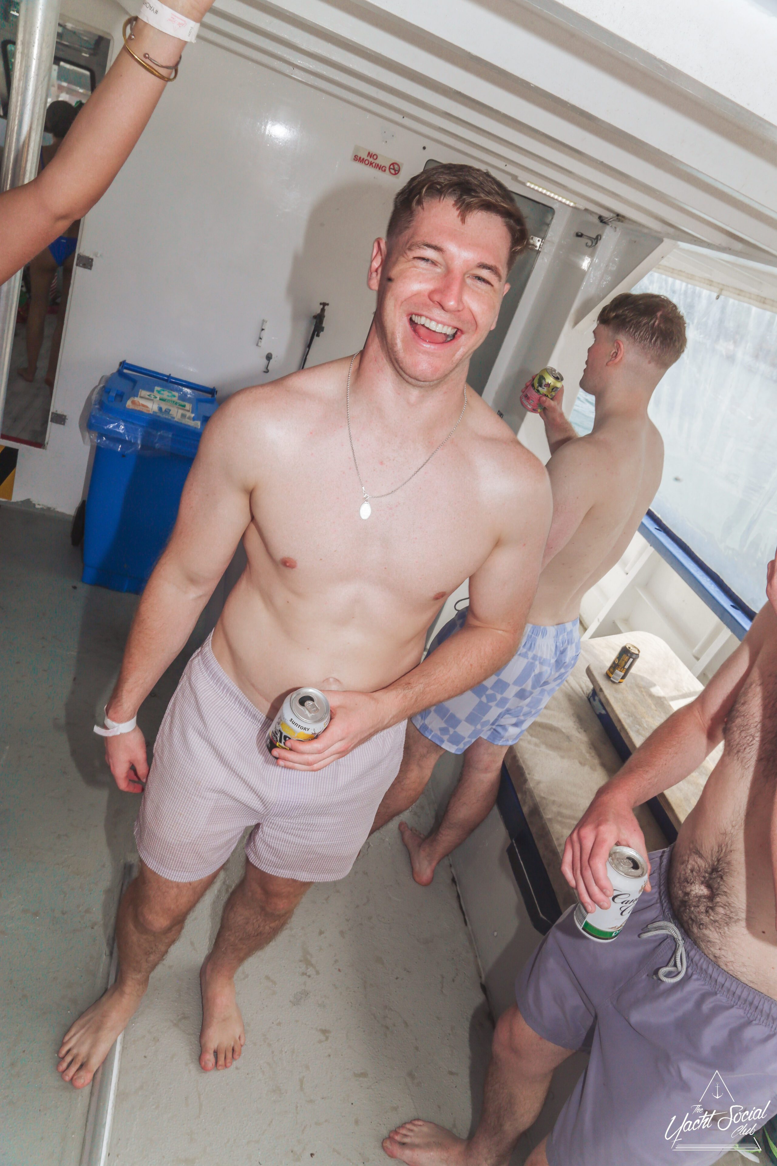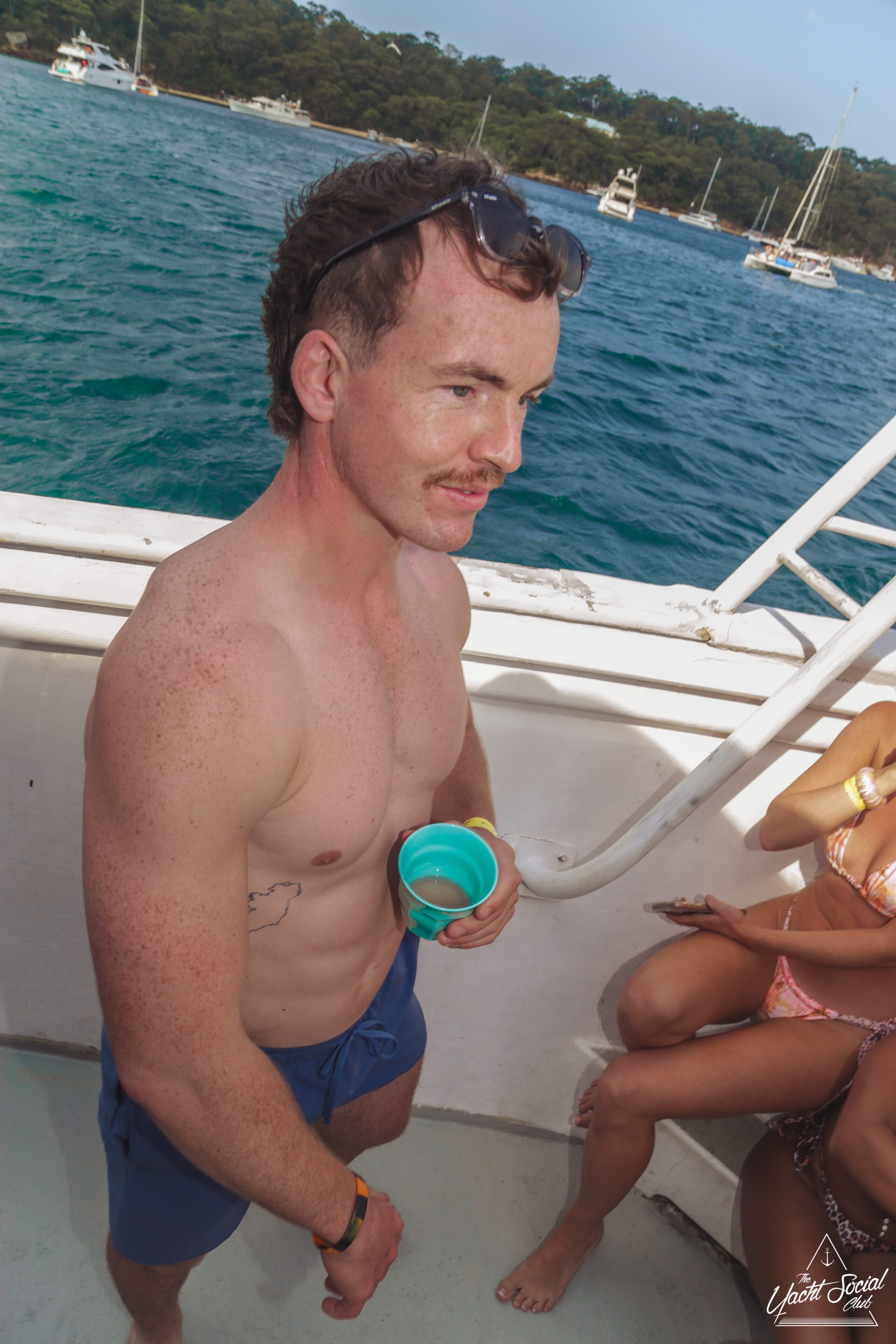 Young adults enjoy a lively boat party on a sunny day, with one shirtless man in the foreground holding drinks and people dancing behind him. Other boats and swimmers are visible on the blue water.