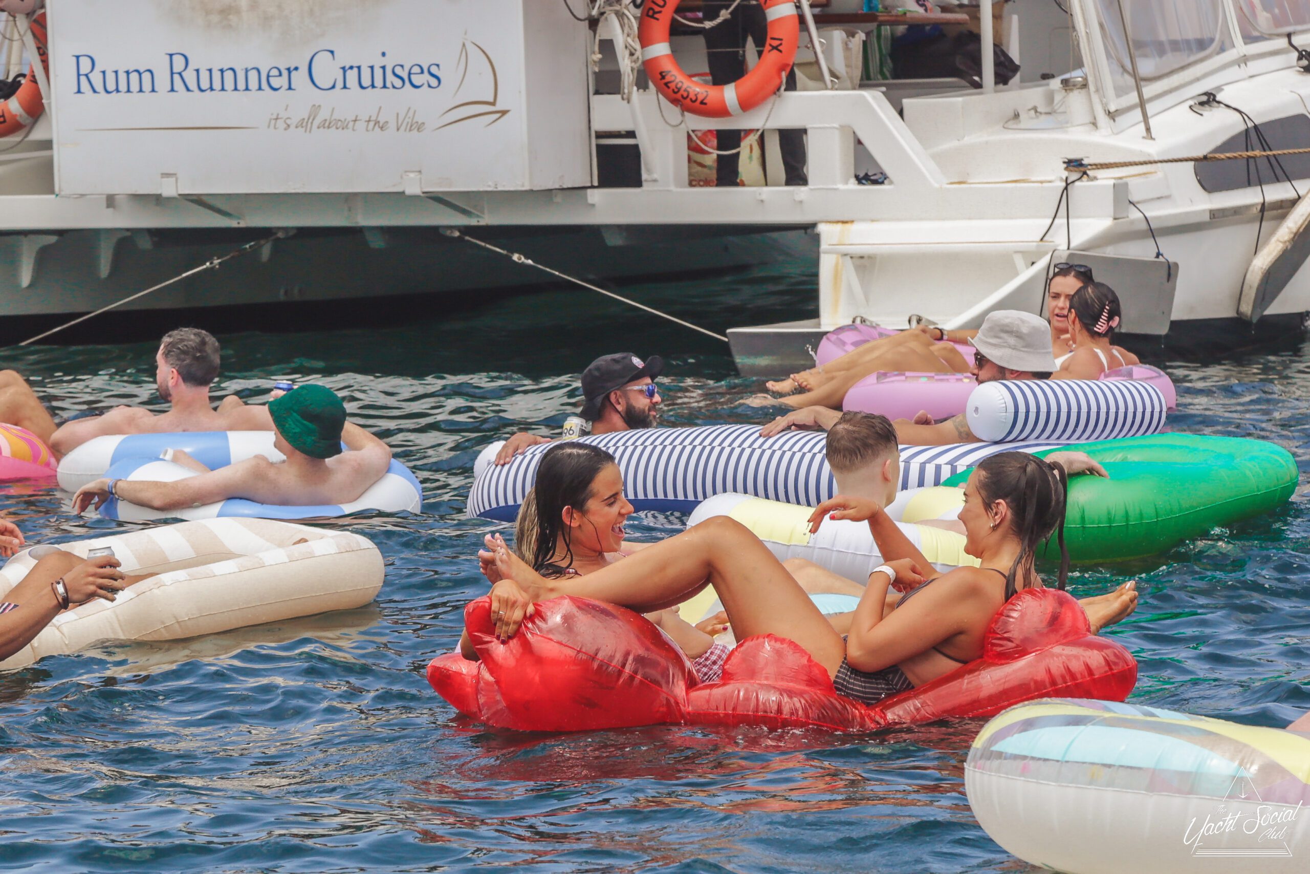 Two people smile while floating on inflatable tubes in the water, holding drinks. Behind them, others relax on tubes and a large boat under a clear, sunny sky. The atmosphere is lively and festive.