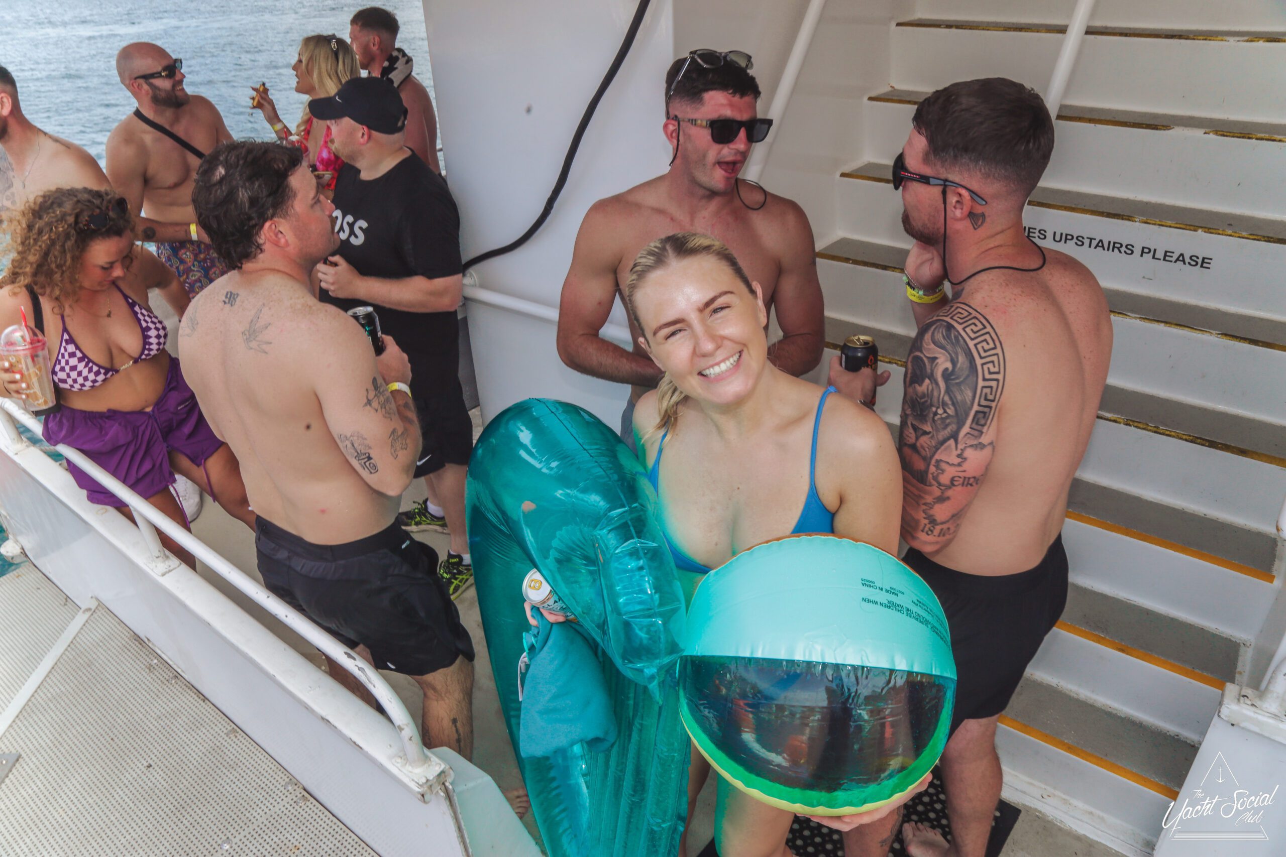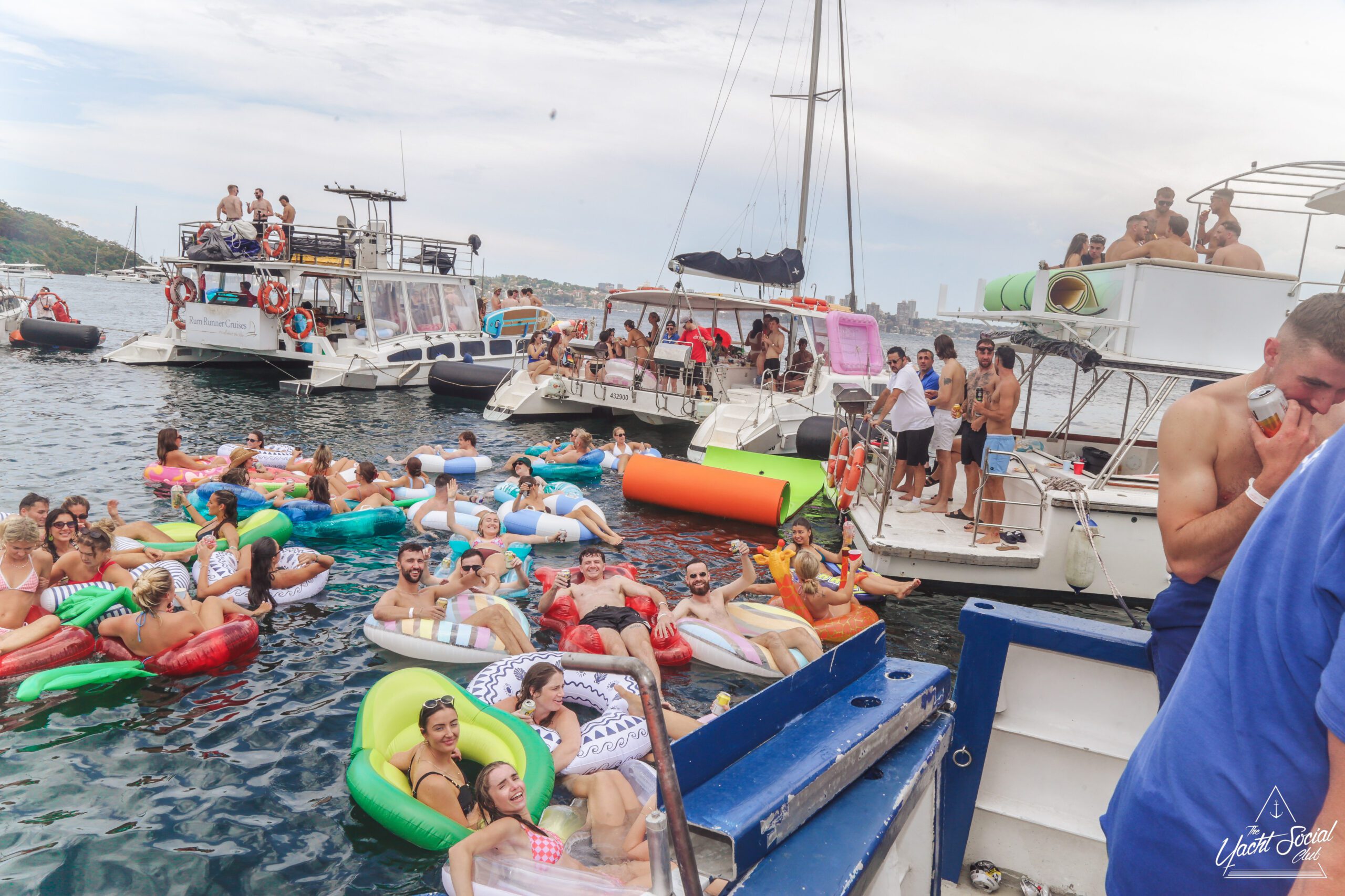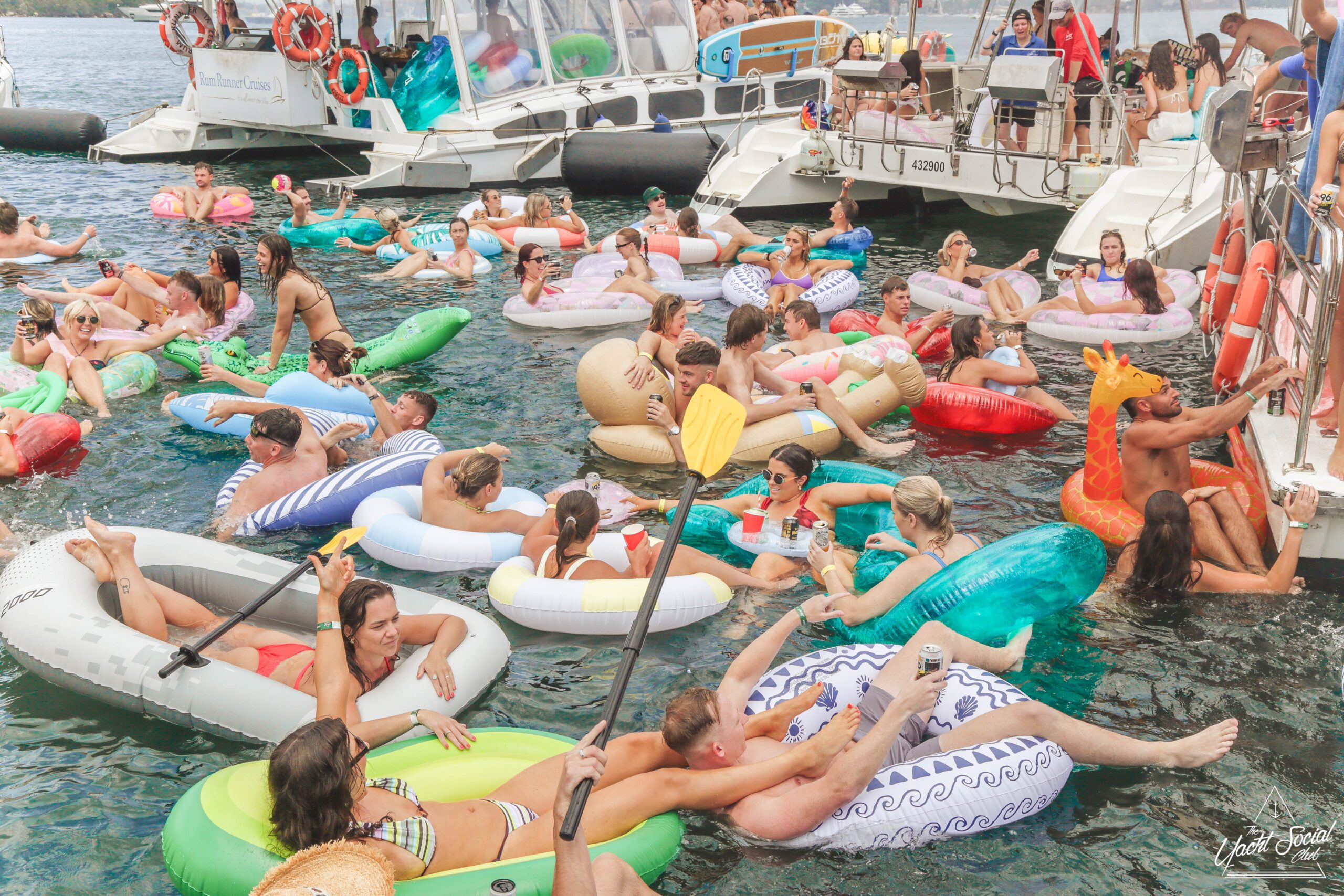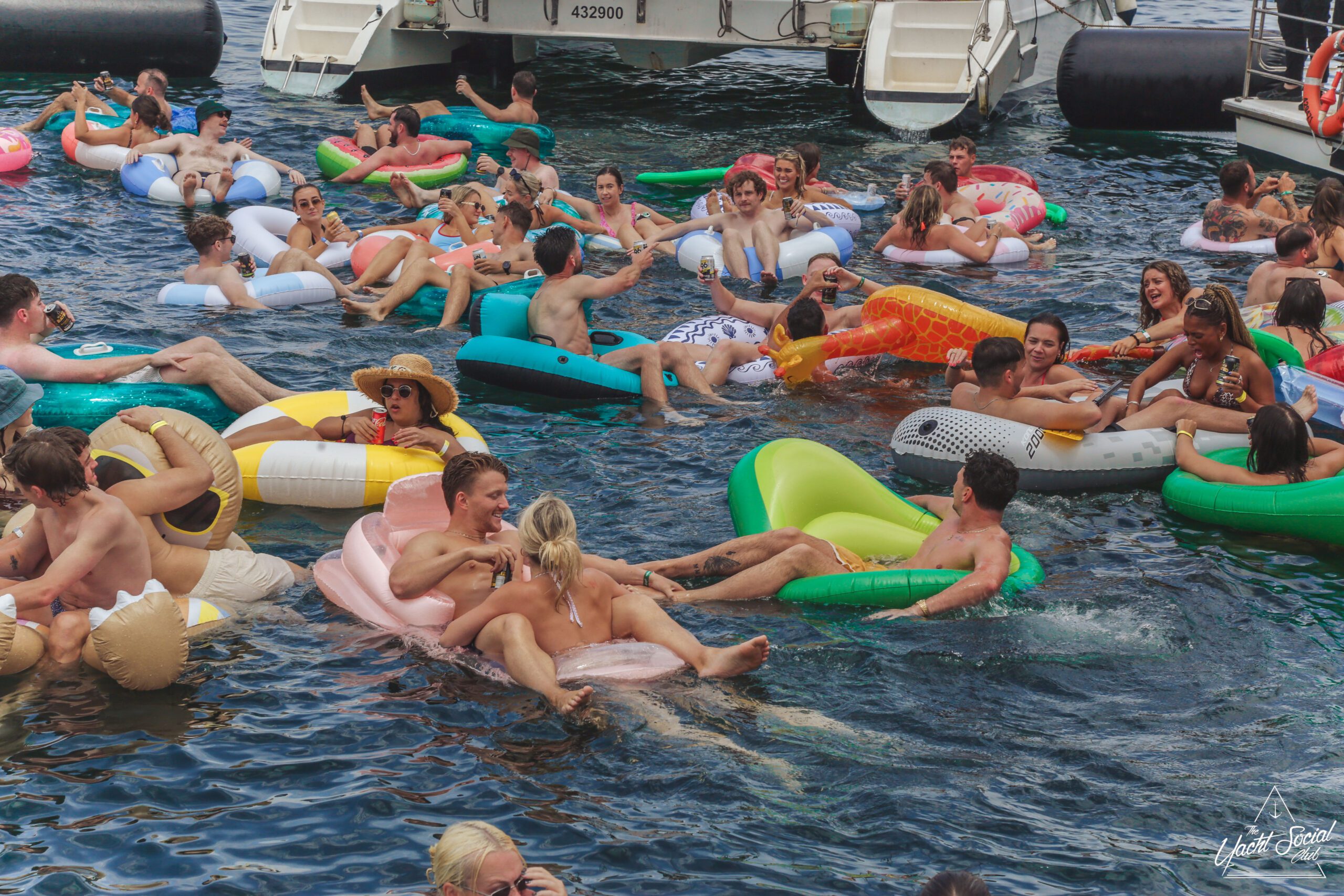 People relax on colorful inflatable pool floats in the water near boats during a sunny day. Many are wearing swimsuits, smiling, and enjoying the lively atmosphere of a boat party.