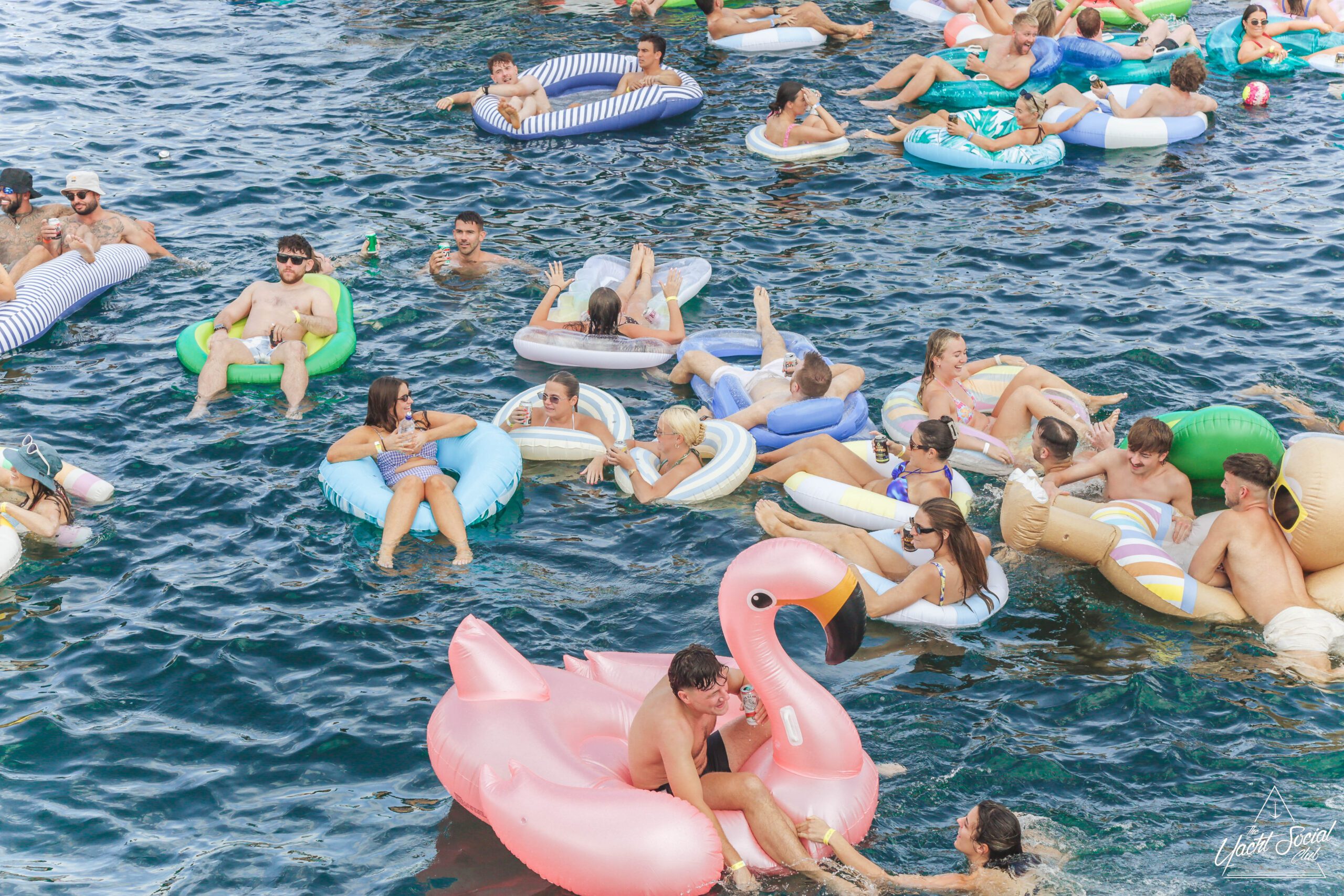 People relaxing on colorful inflatable floats in a blue, sunny bay surrounded by boats. Some are smiling and holding drinks, while others lounge on pool floats shaped like flamingos. The scene is lively and festive.