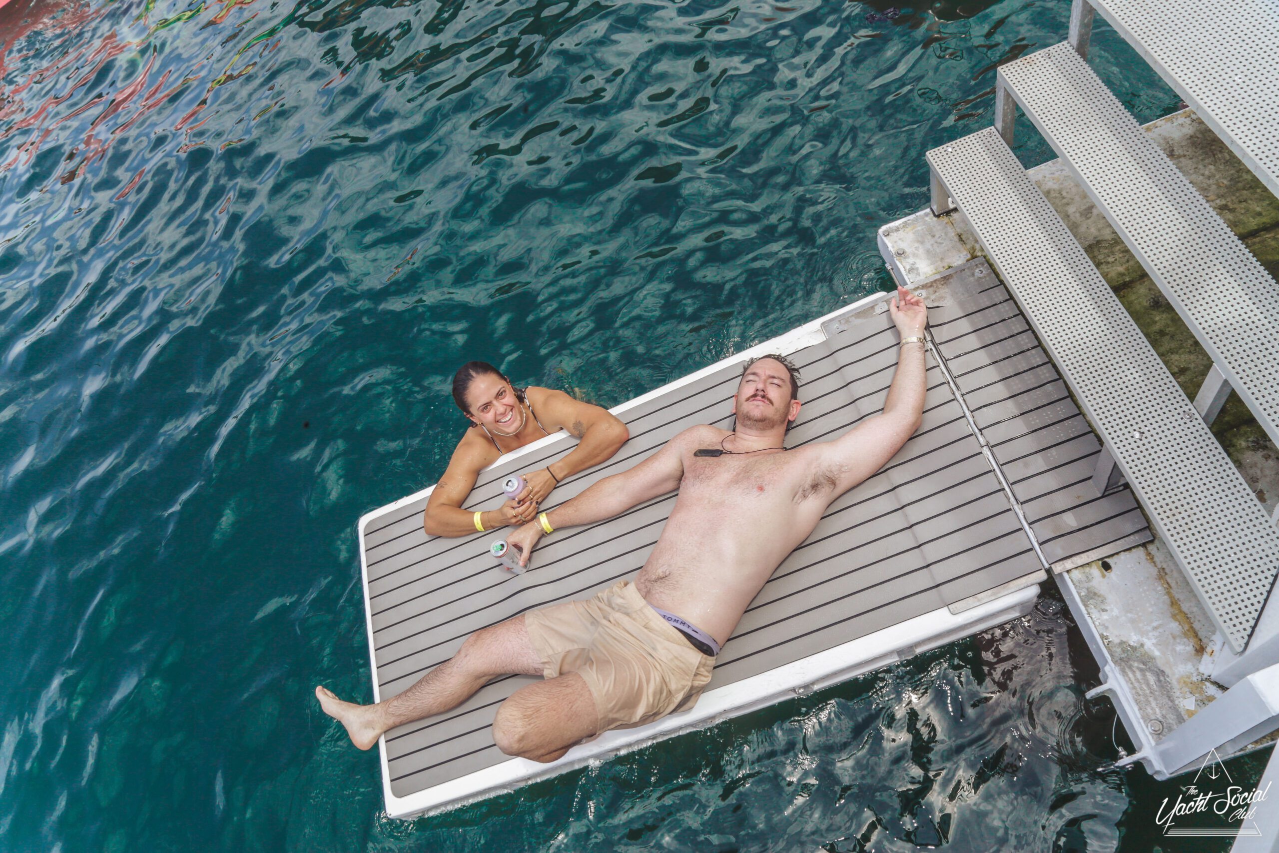 A man and woman relax and laugh on a floating platform in the water, surrounded by many people on colorful inflatables, with boats and a lively crowd in the background under a sunny sky.