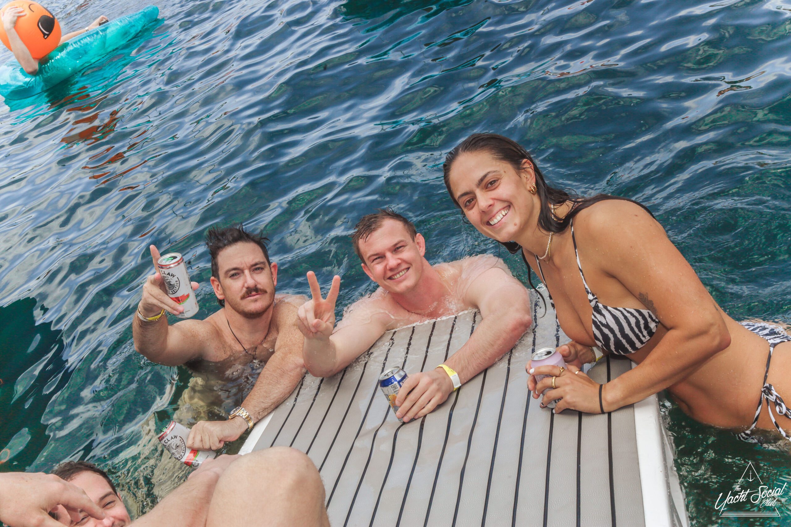Four people in swimsuits relax and smile on a striped inflatable raft in the water, holding drinks and posing for the camera. A boat and others are visible in the background on a sunny day.
