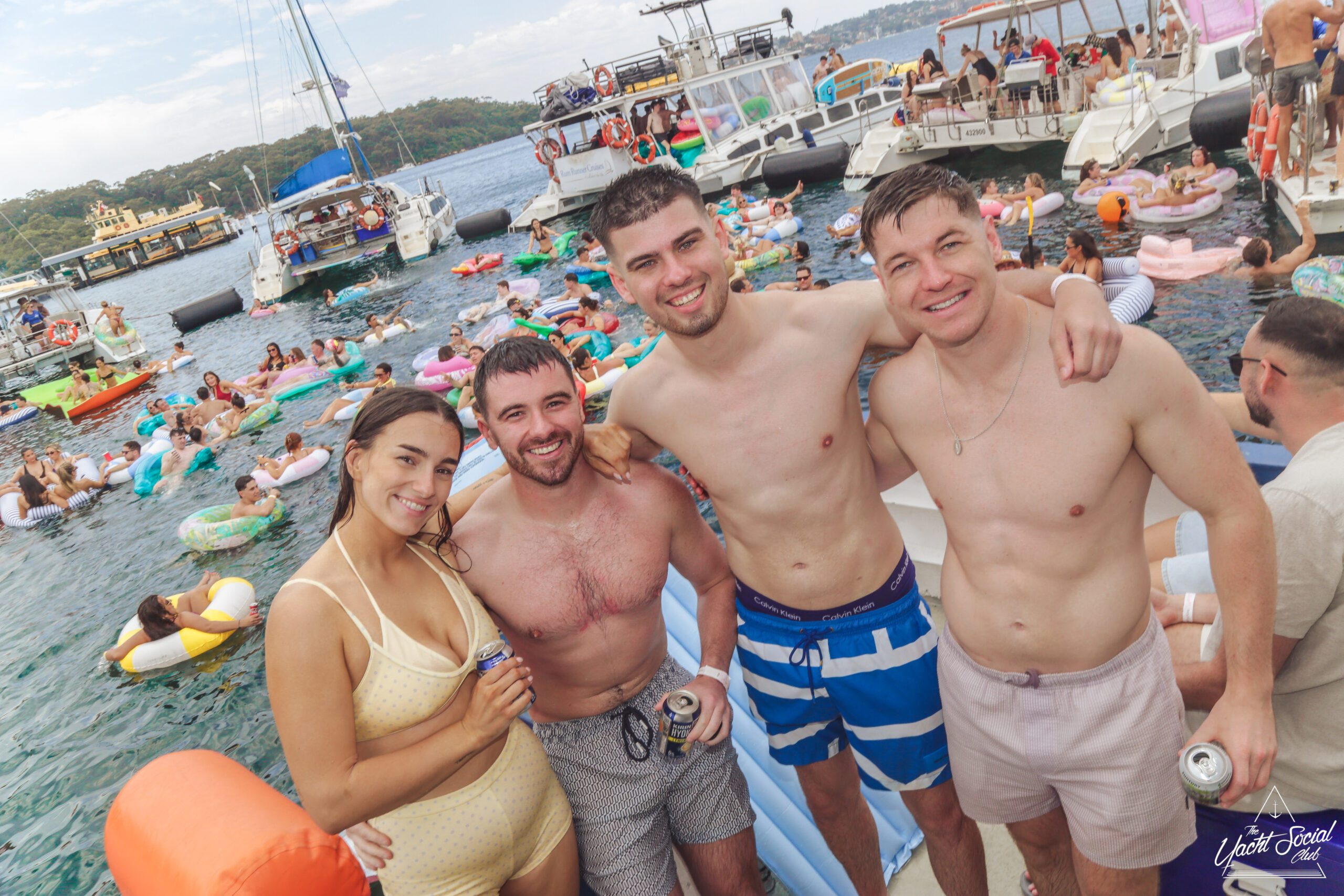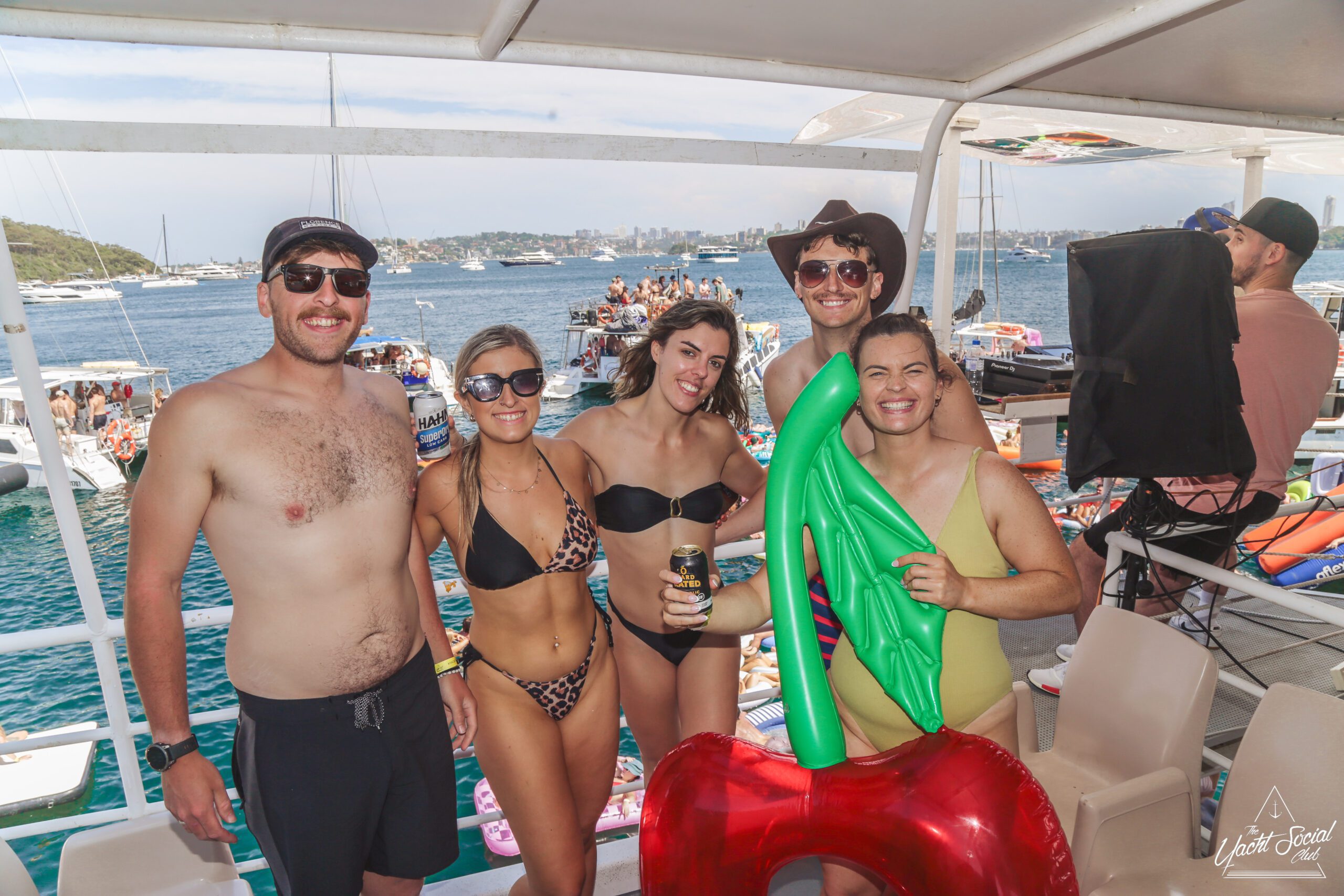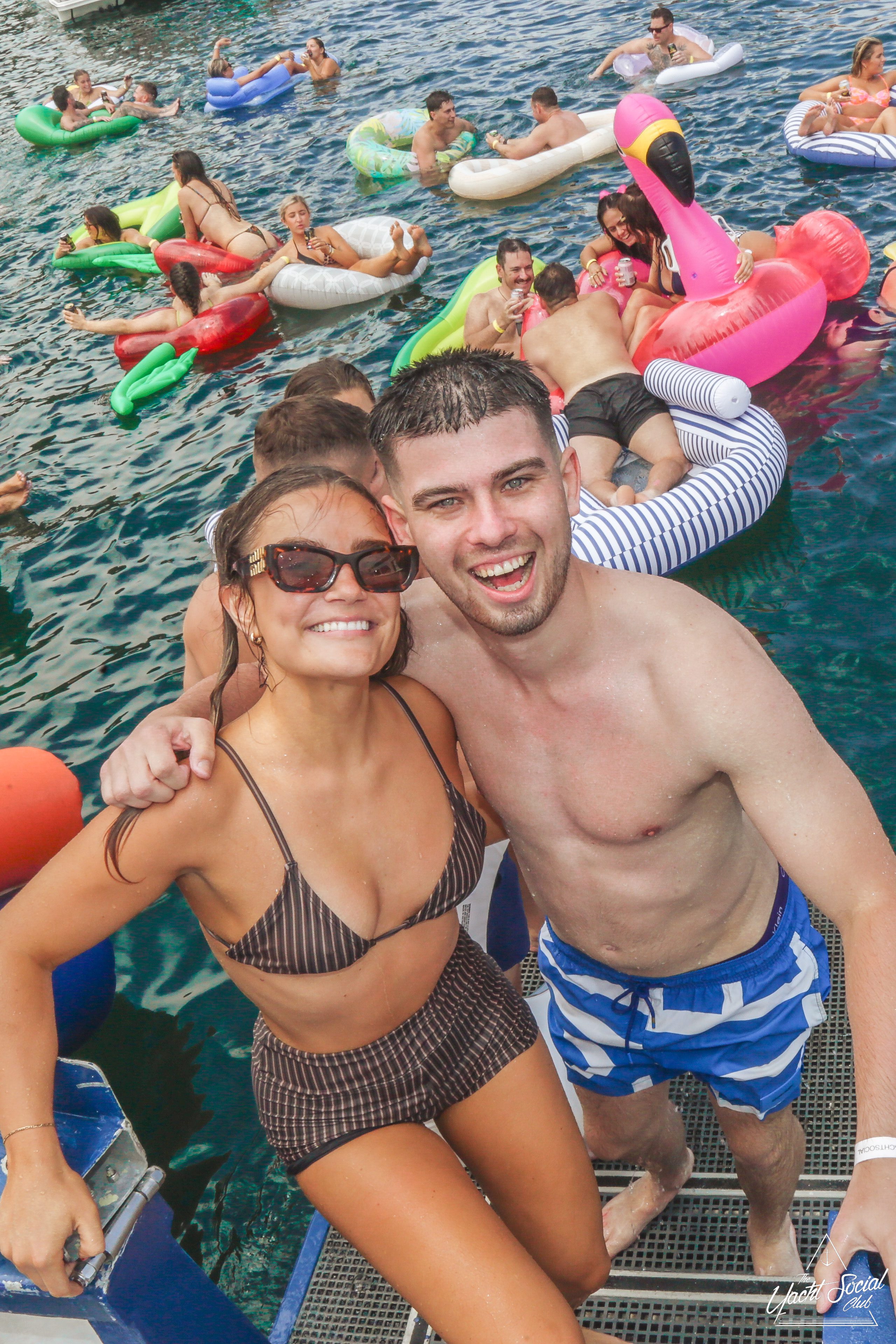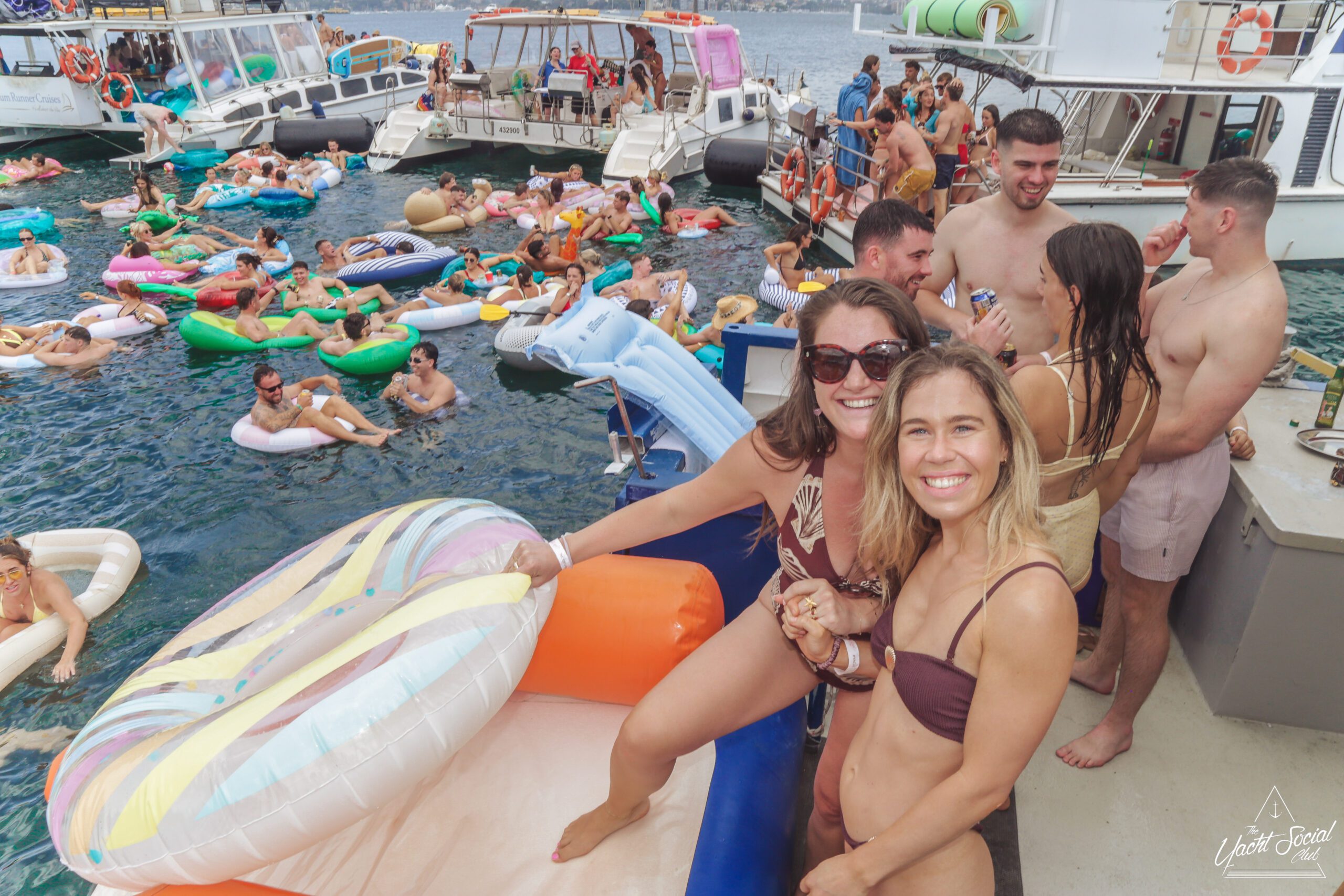 A group of people in swimsuits and sunglasses smile and pose on a boat during a sunny day party. Other boats and people are visible in the background on the water, with colorful pool floats and a festive atmosphere.