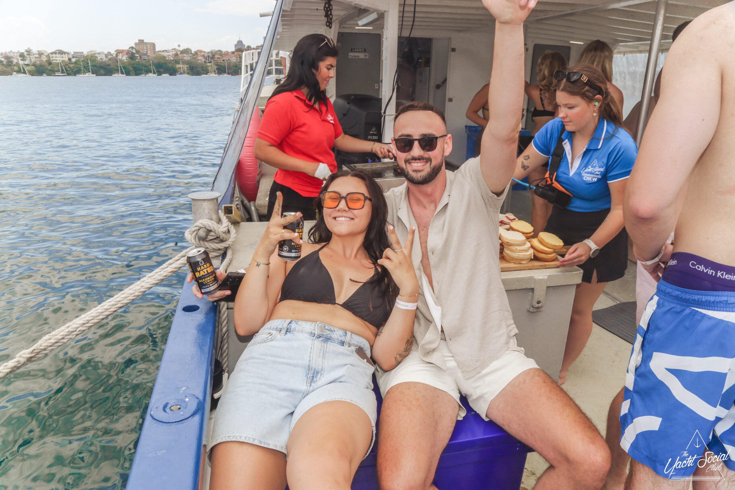 Three smiling people in swimwear stand together on a boat under a sunny sky. One woman holds a drink, the man holds a plate with a burger, and the ocean and city skyline are visible in the background.