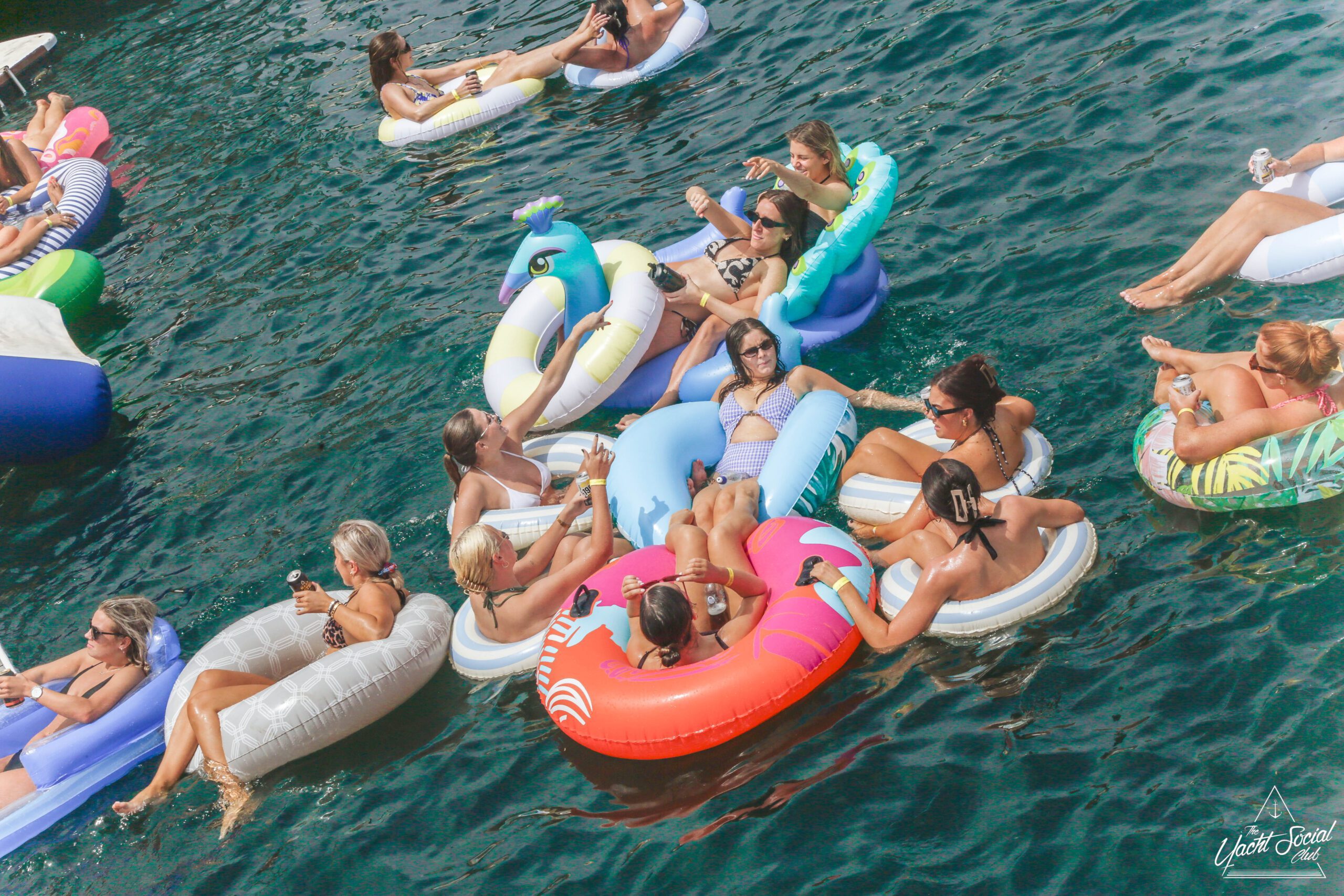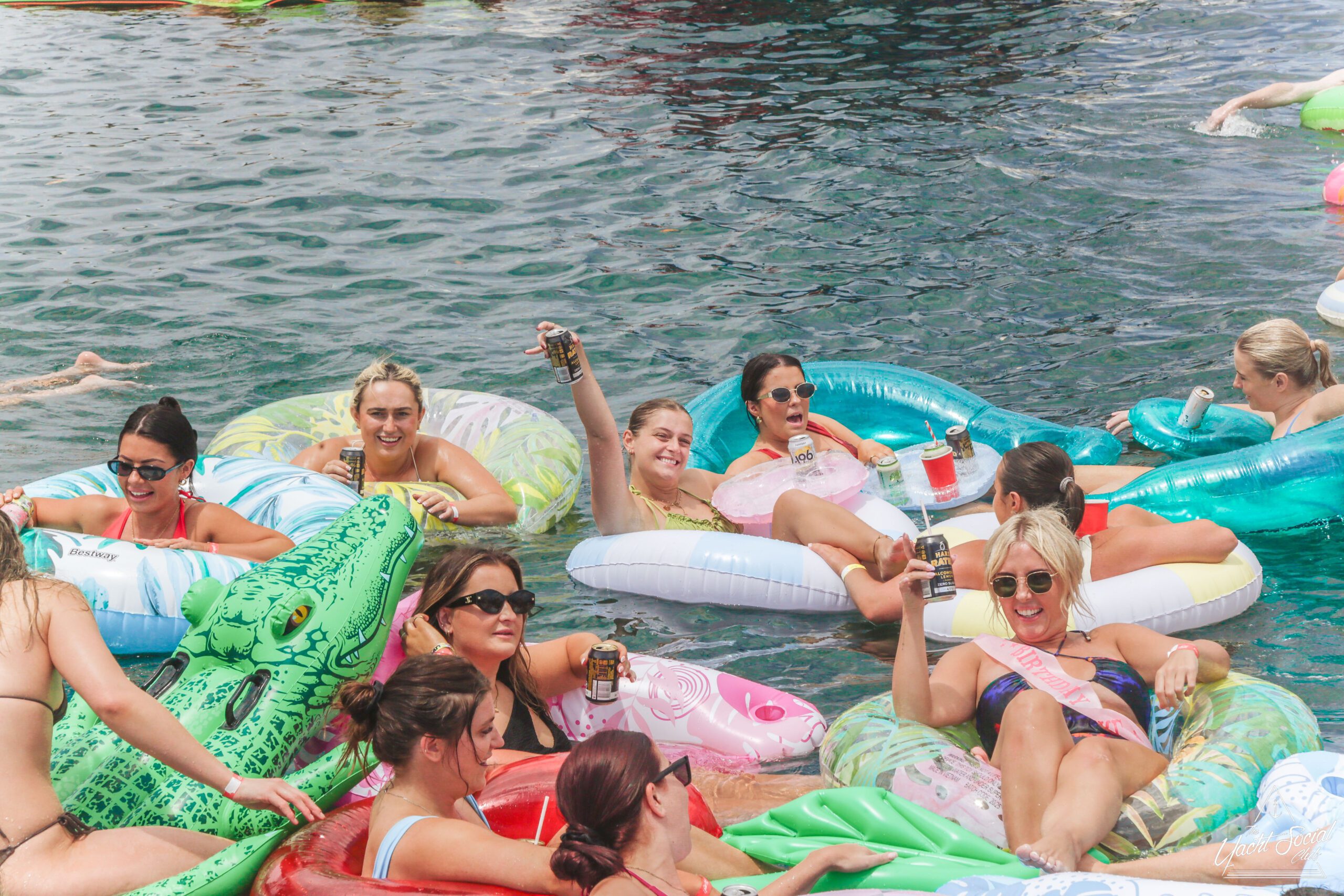 Five people relax on colorful inflatable rafts in the water, smiling and holding drinks, with boats and more people celebrating in the background under a sunny blue sky.