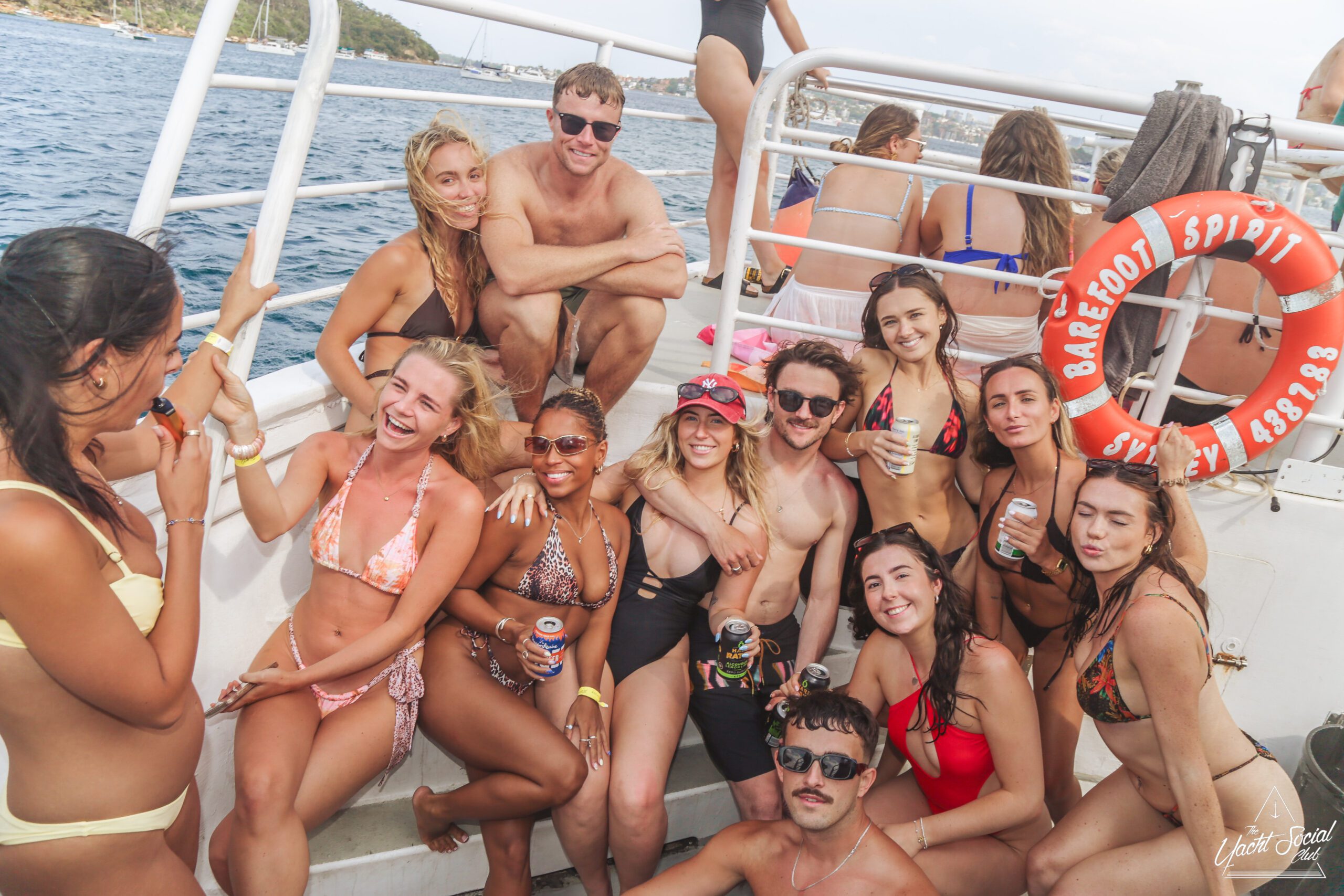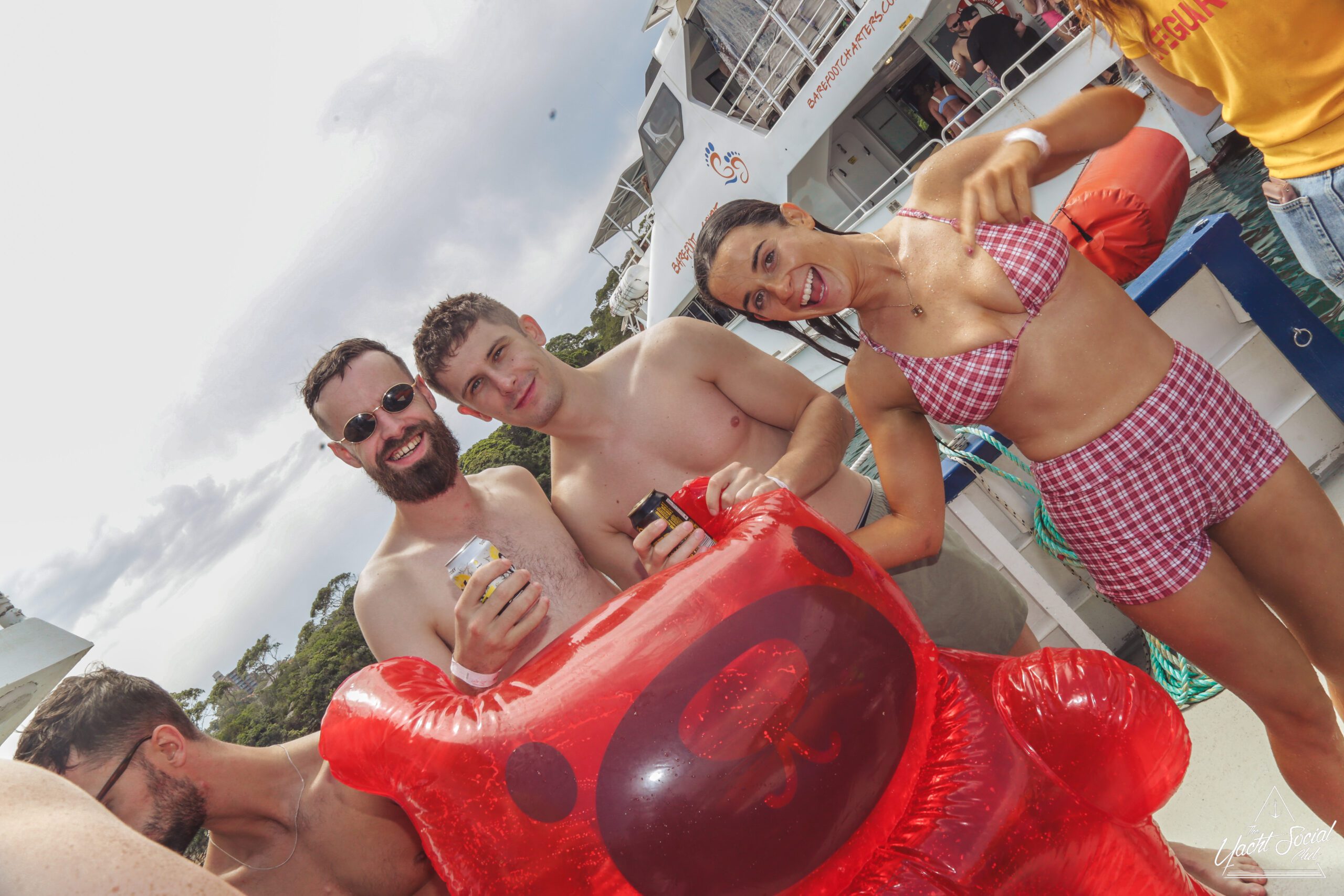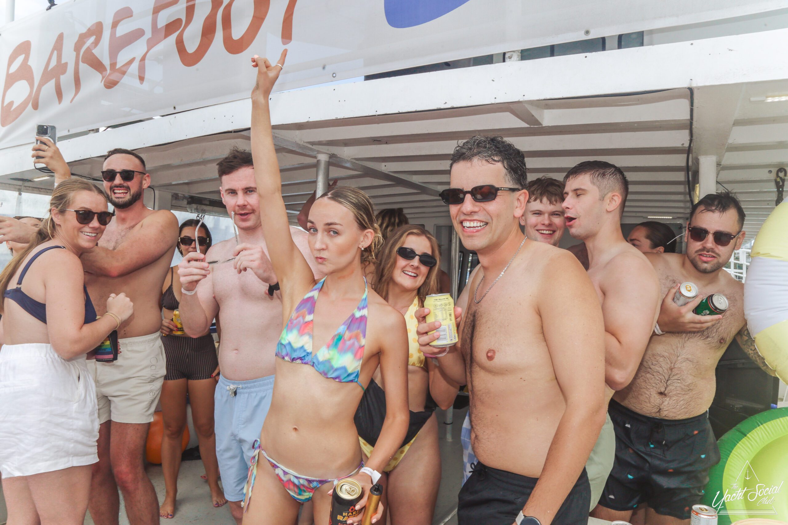 A group of smiling people in swimsuits and summer clothes enjoy drinks on the deck of a boat labeled "BAREFOOT BLUE," with water and a city skyline in the background. Some are waving and posing for the camera.