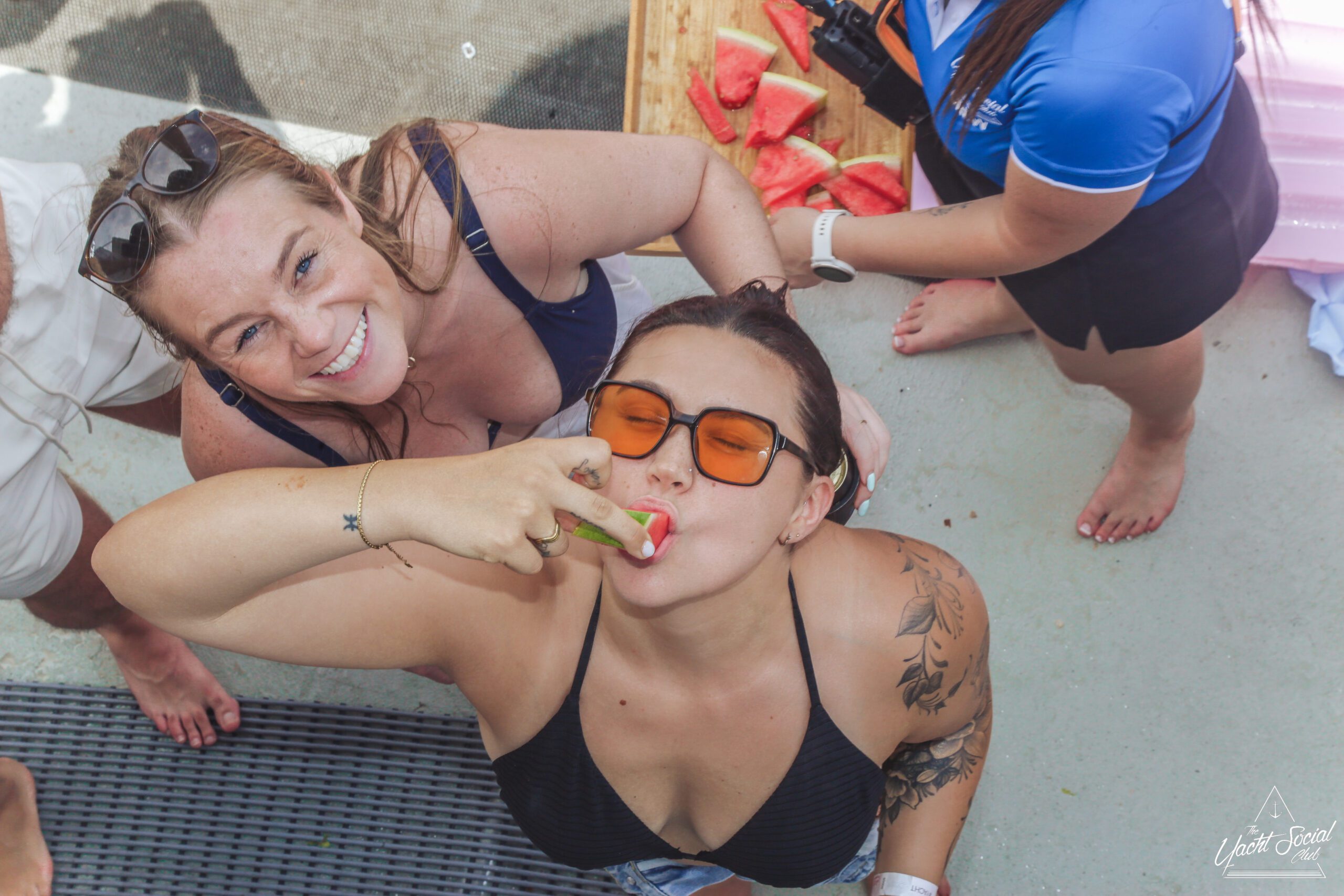 Three women in swimsuits and sunglasses smile at the camera while sitting together at a lively outdoor pool or boat party. People and floaties are visible in the background.