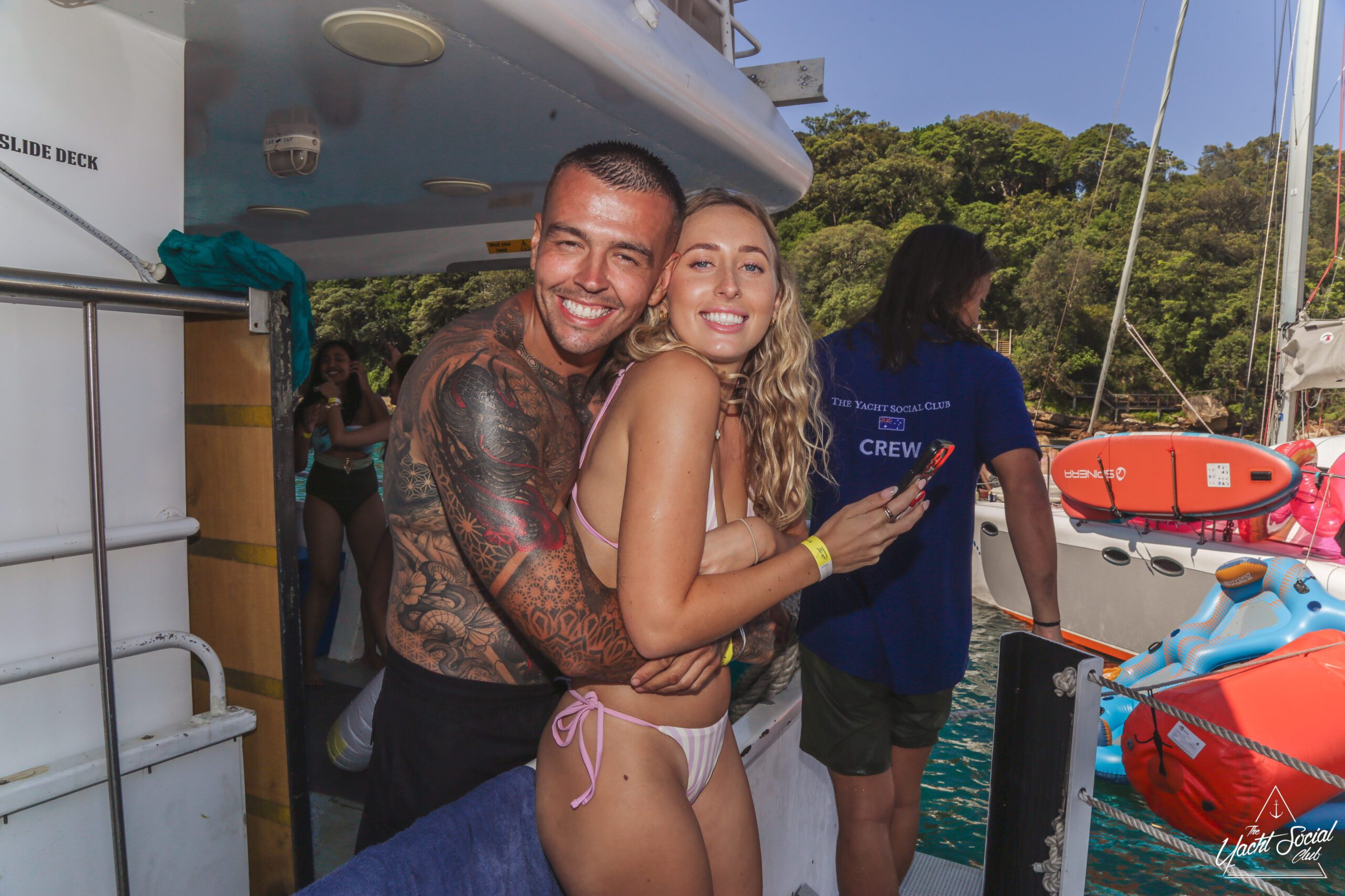A smiling woman in a colorful bikini top and sunglasses stands next to a man in a blue shirt holding a drink, surrounded by people enjoying a party on a boat.