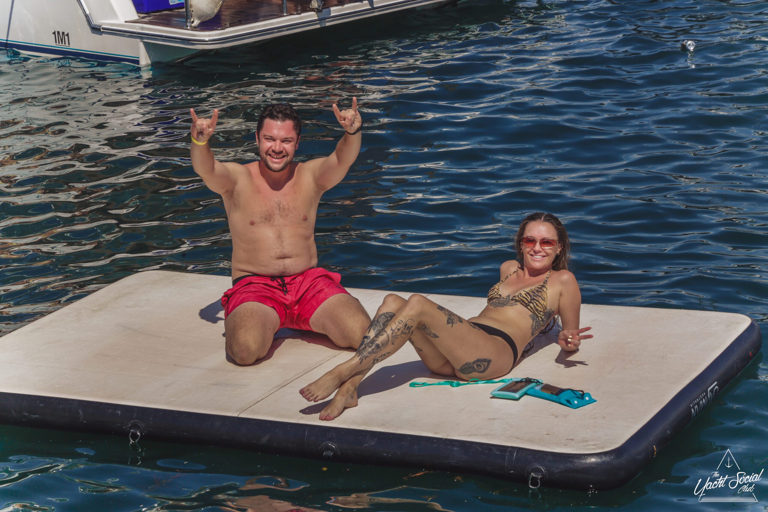 A group of people in swimsuits gather on a floating mat in the ocean, smiling and playing in the sun. One woman stands with arms raised, surrounded by boats and others enjoying the water.