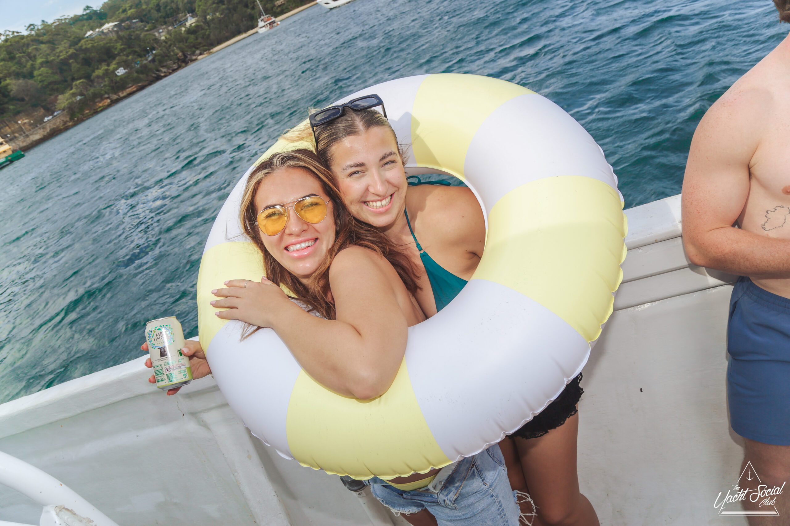 Two women in swimsuits and sunglasses sit and smile on a boat, each holding a can drink. There is water and greenery in the background, and people can be seen on another boat behind them.