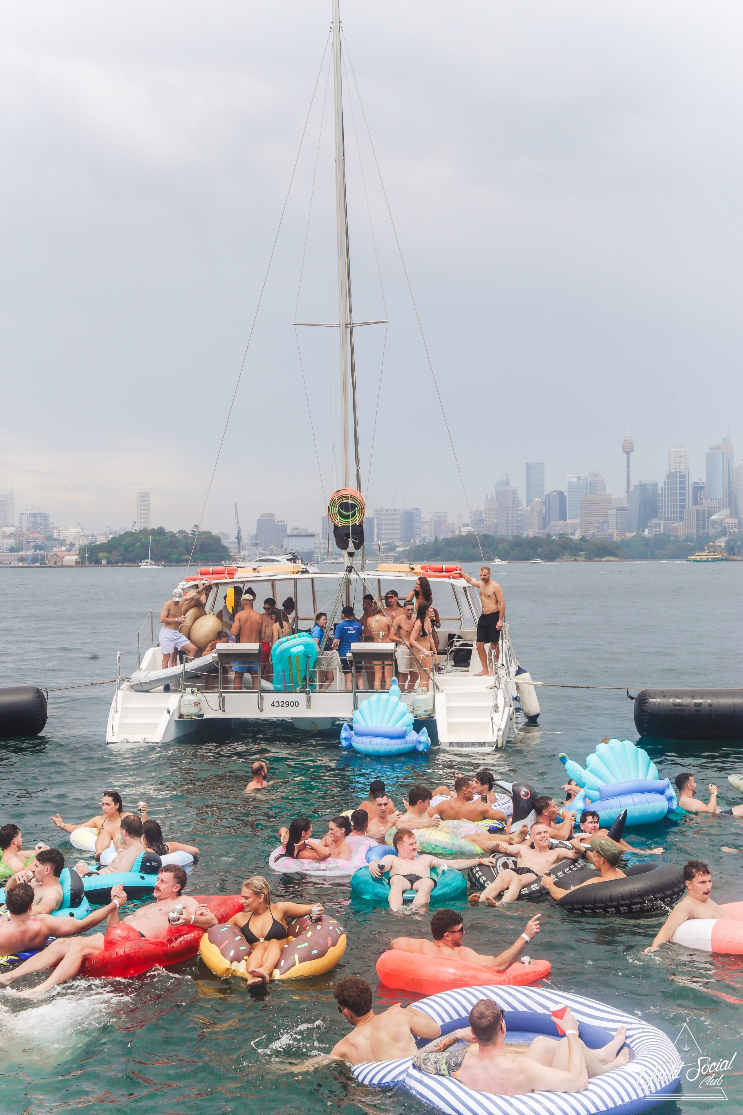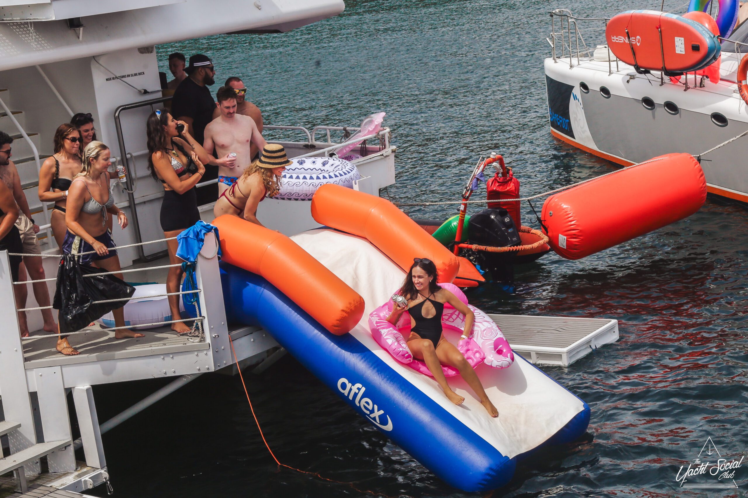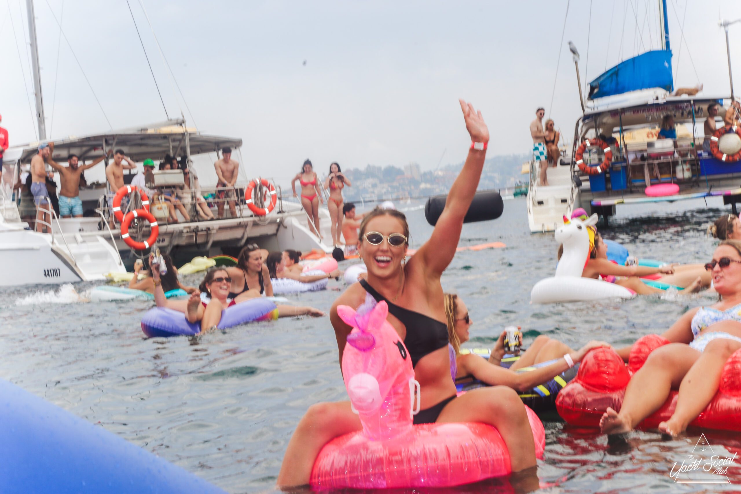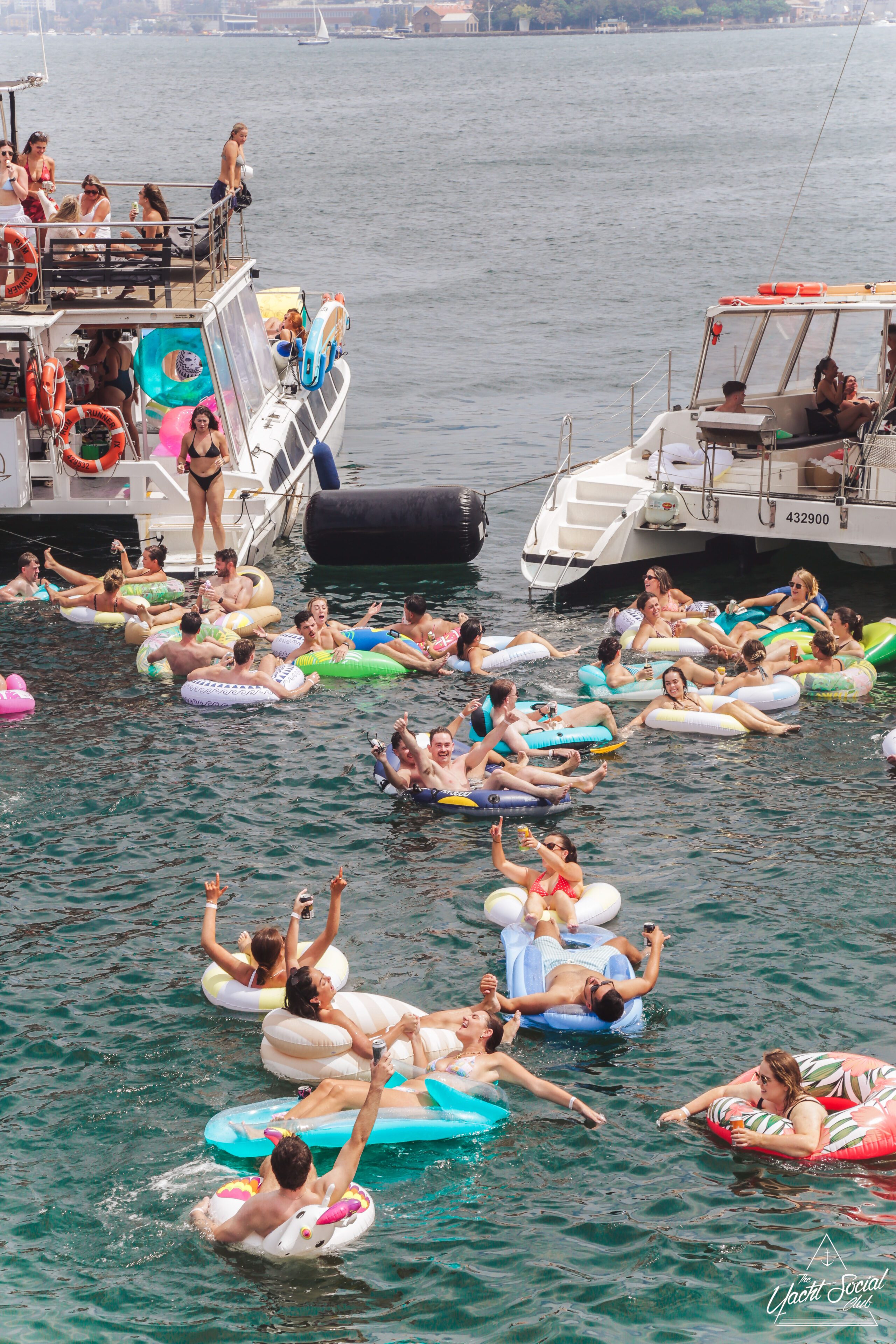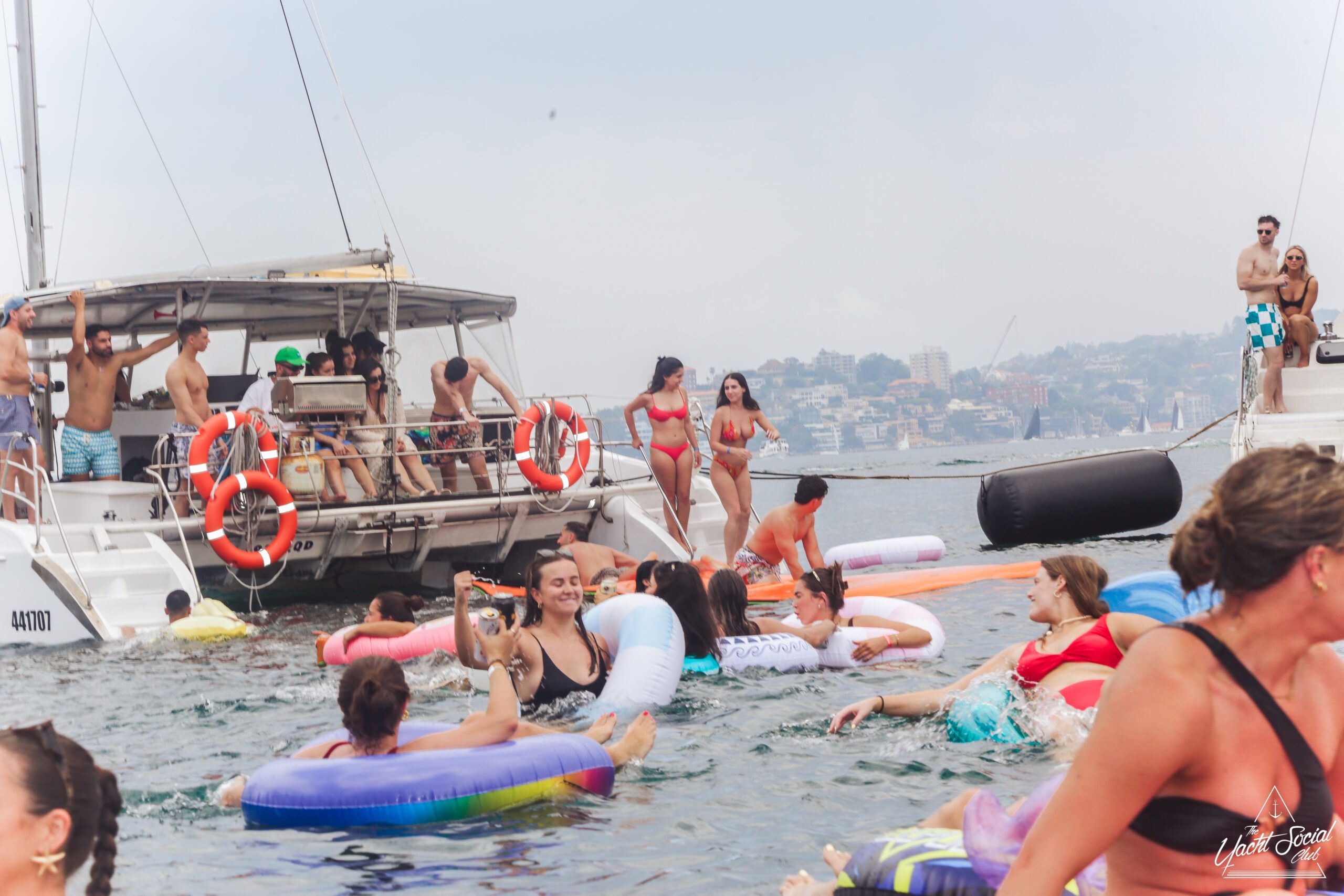 A group of people on a catamaran and in the water on colorful inflatables, enjoying a party. The city skyline and cloudy sky are visible in the background.