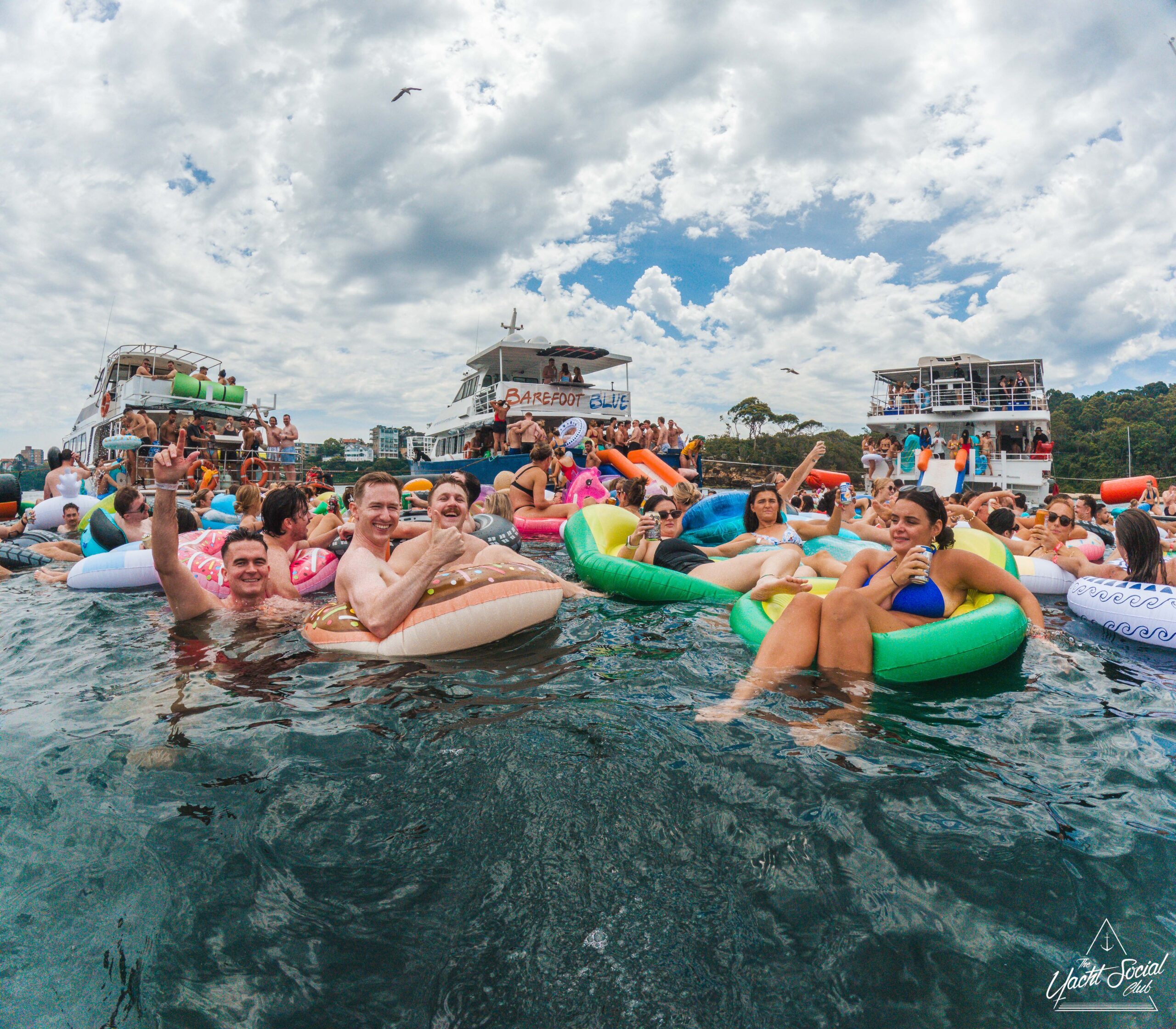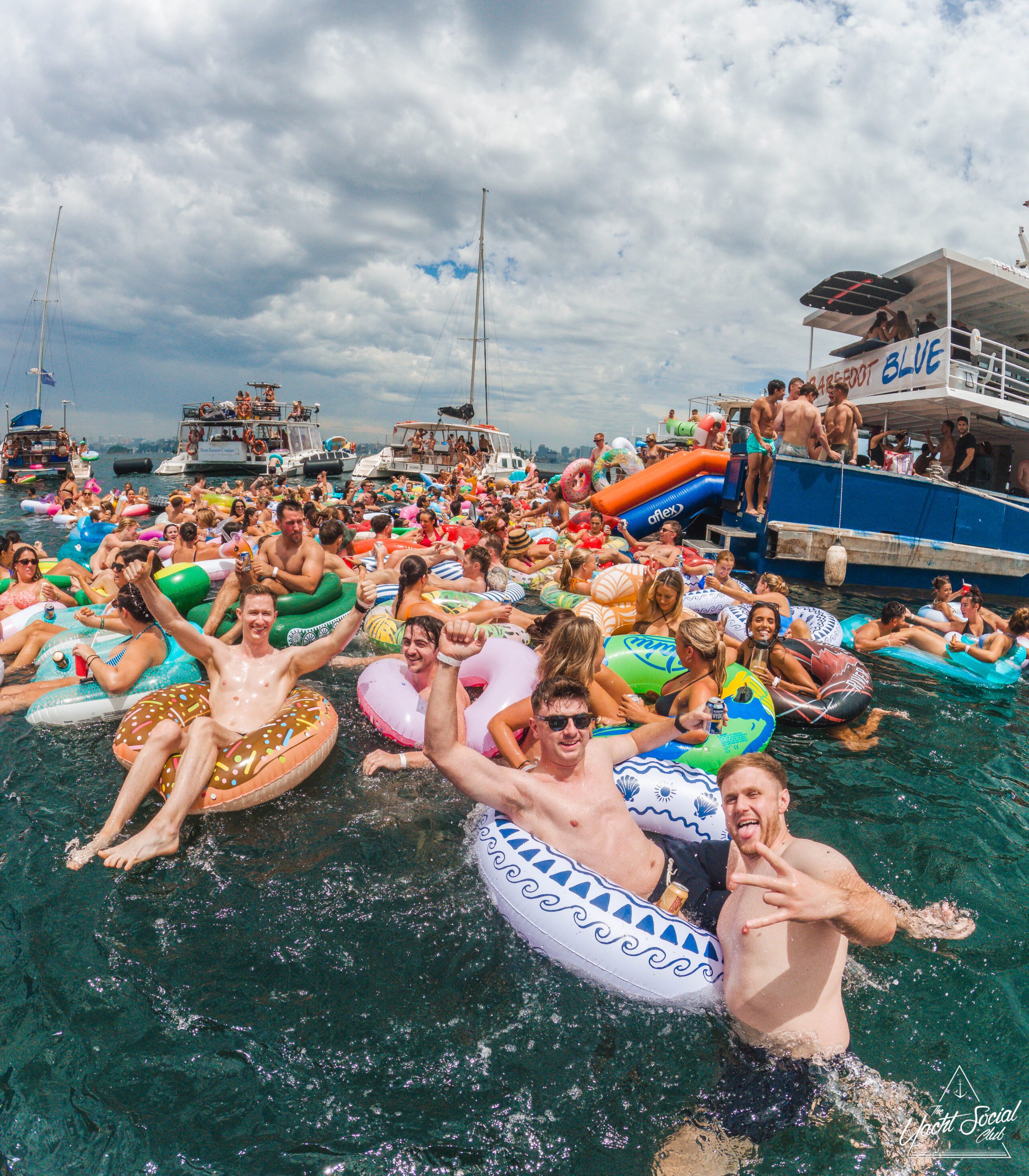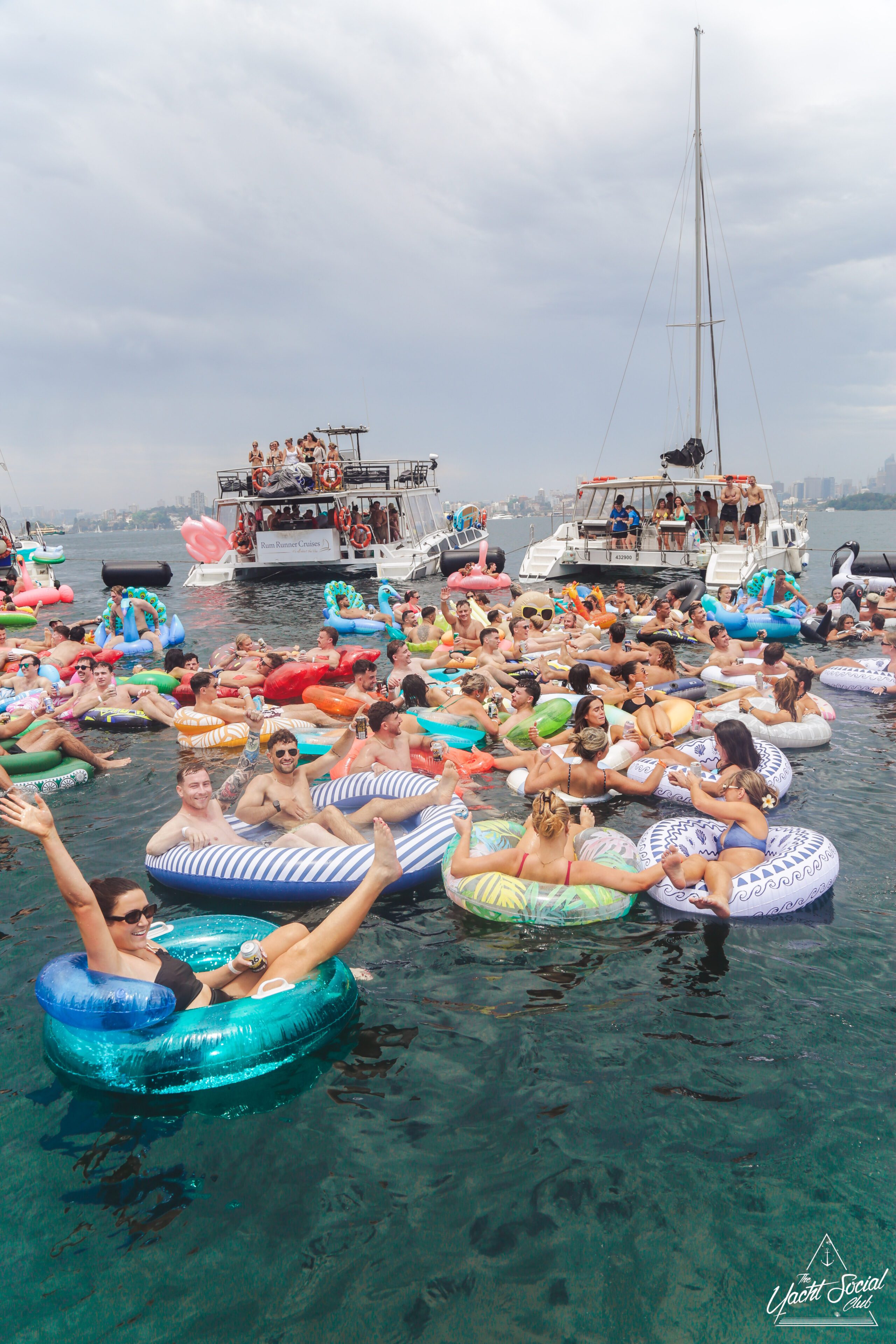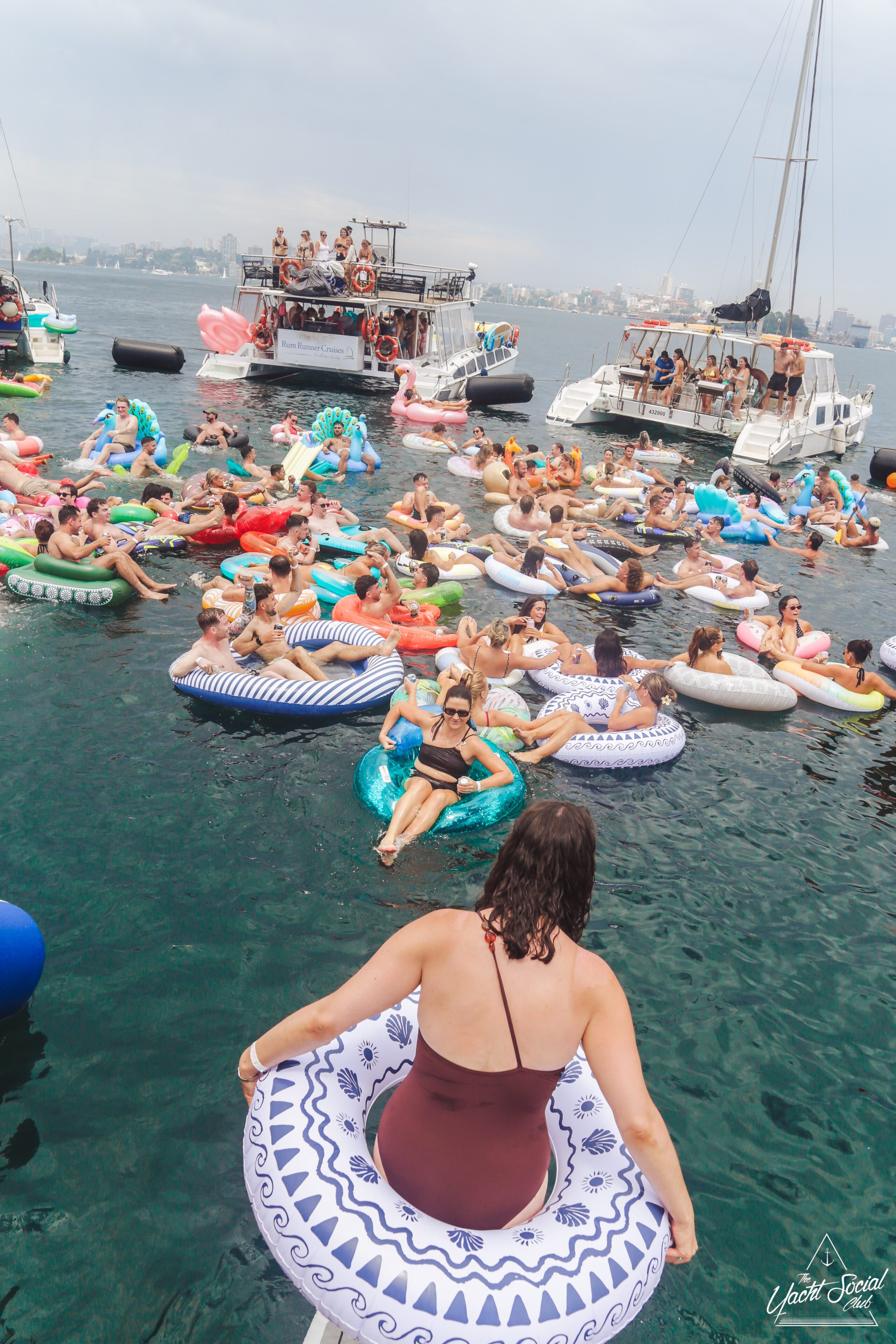 A group of people on a catamaran and in the water on colorful inflatables, enjoying a party. The city skyline and cloudy sky are visible in the background.