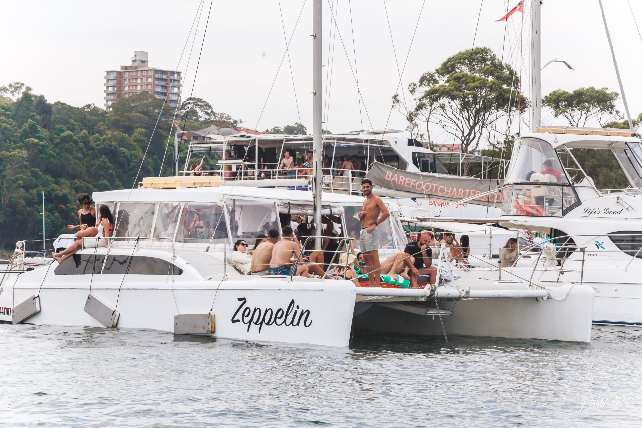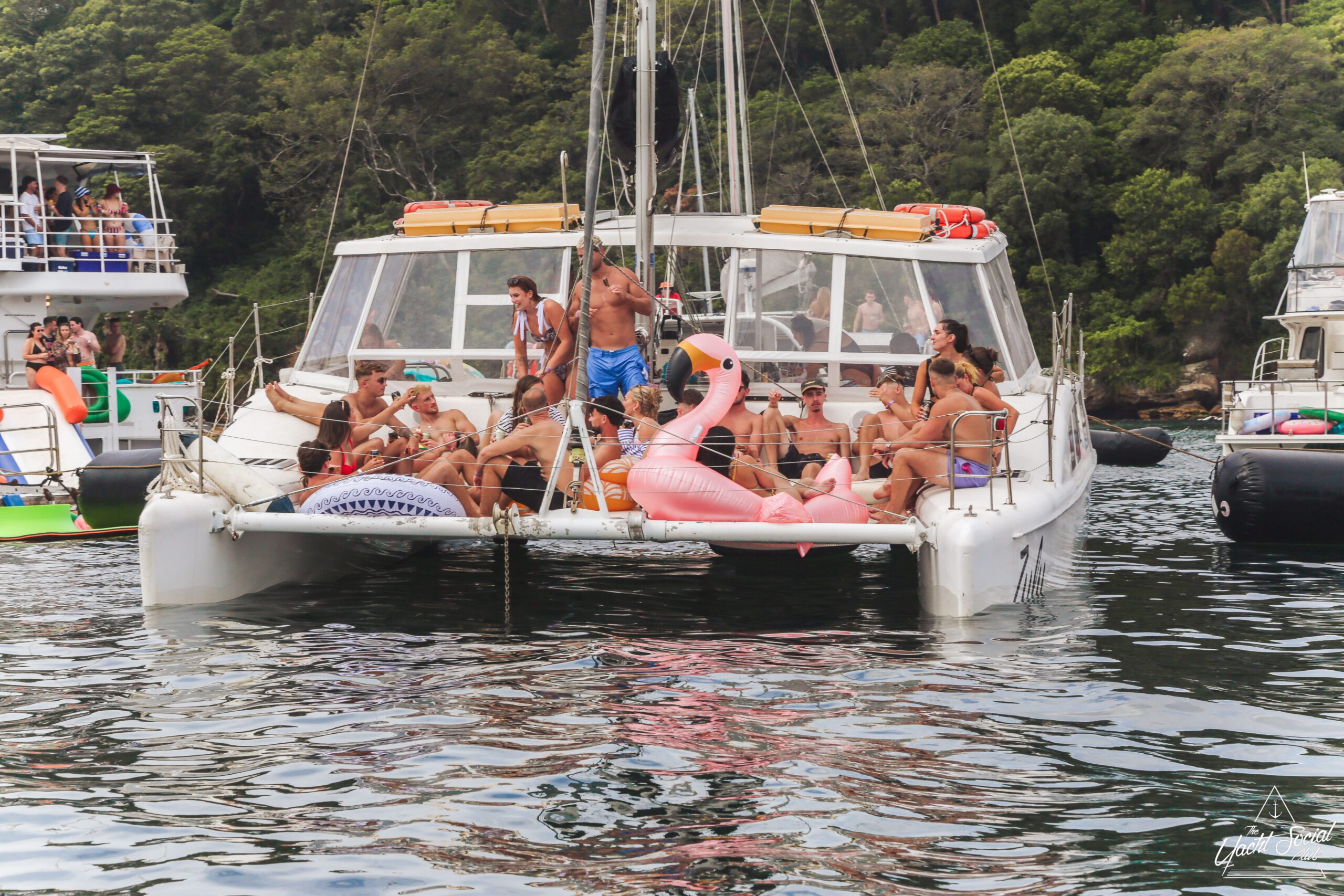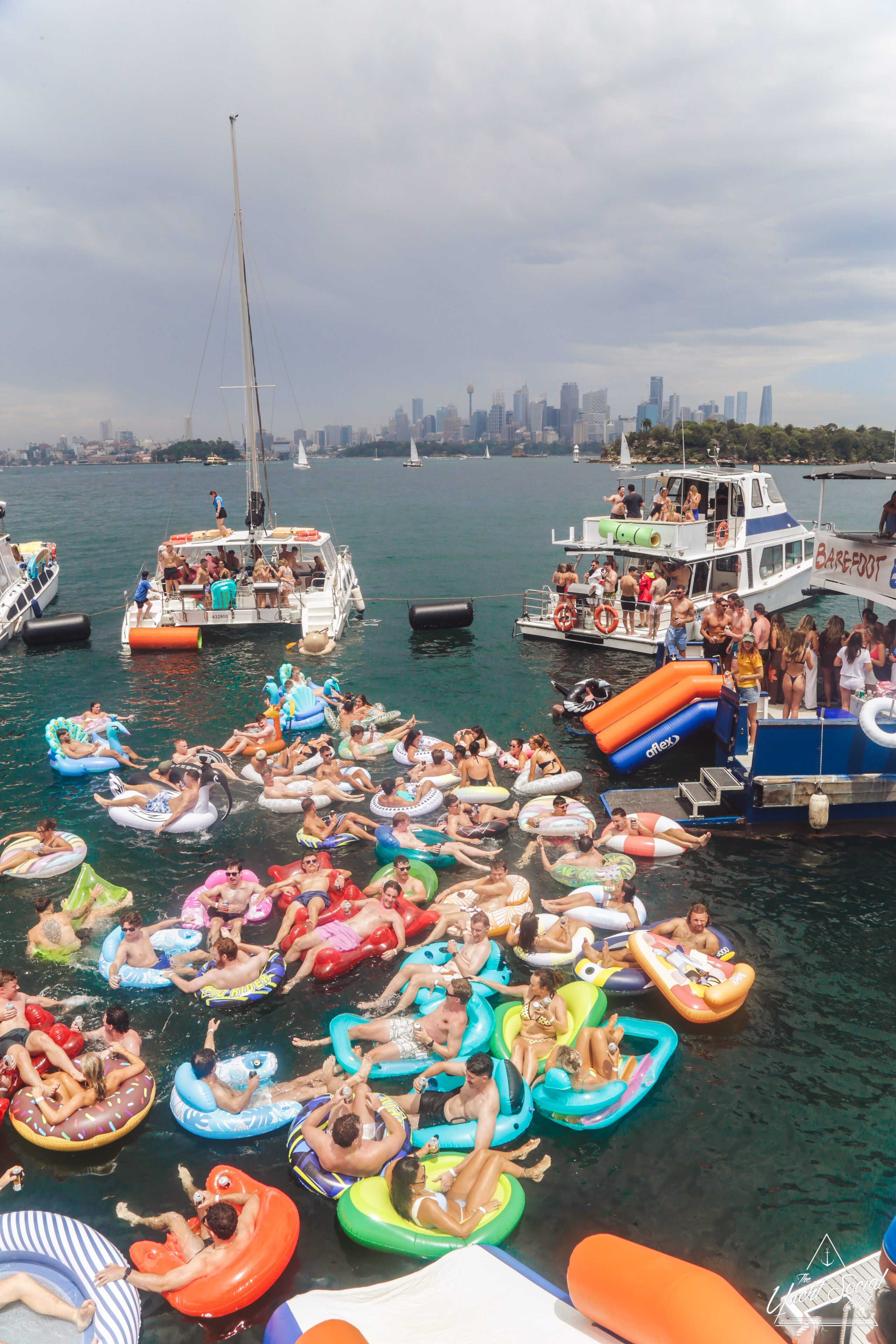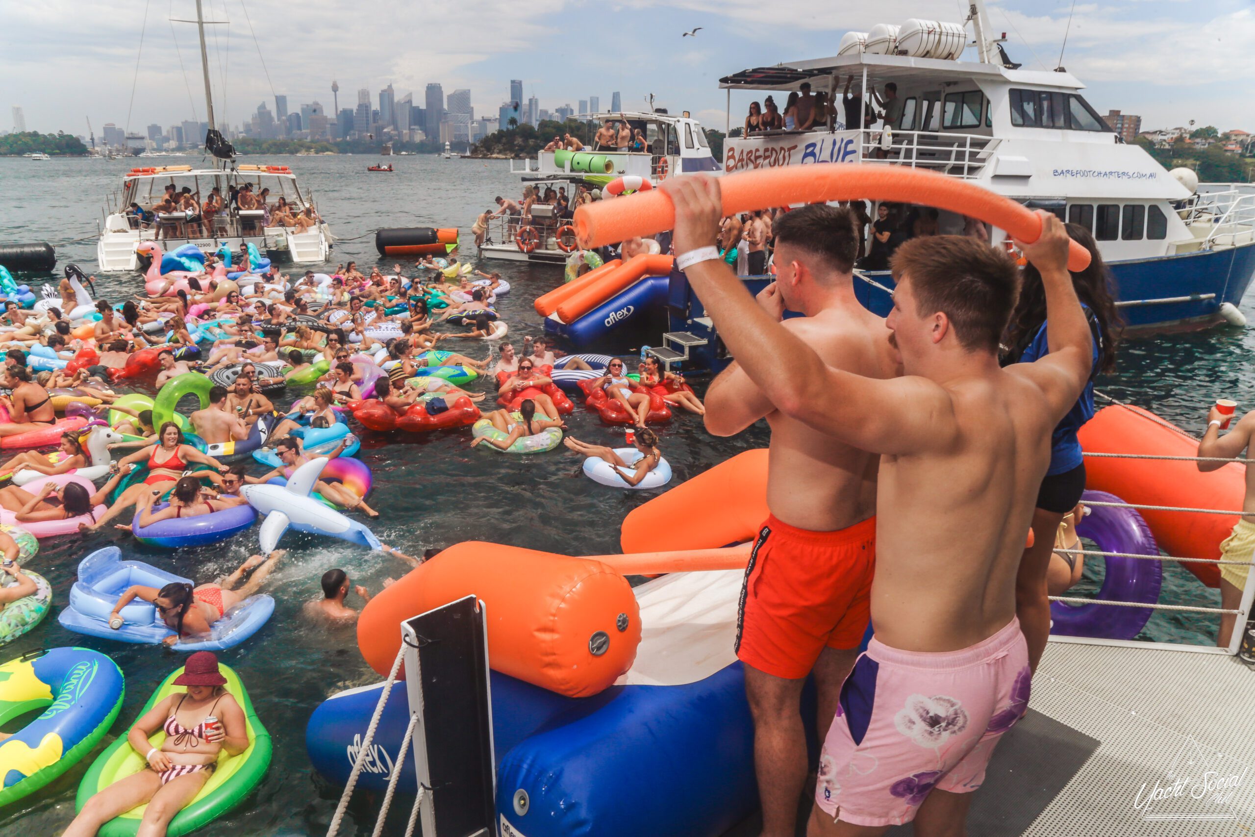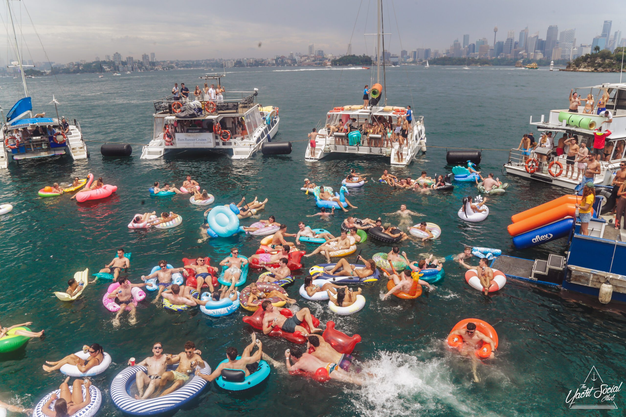 A group of people on a catamaran and in the water on colorful inflatables, enjoying a party. The city skyline and cloudy sky are visible in the background.