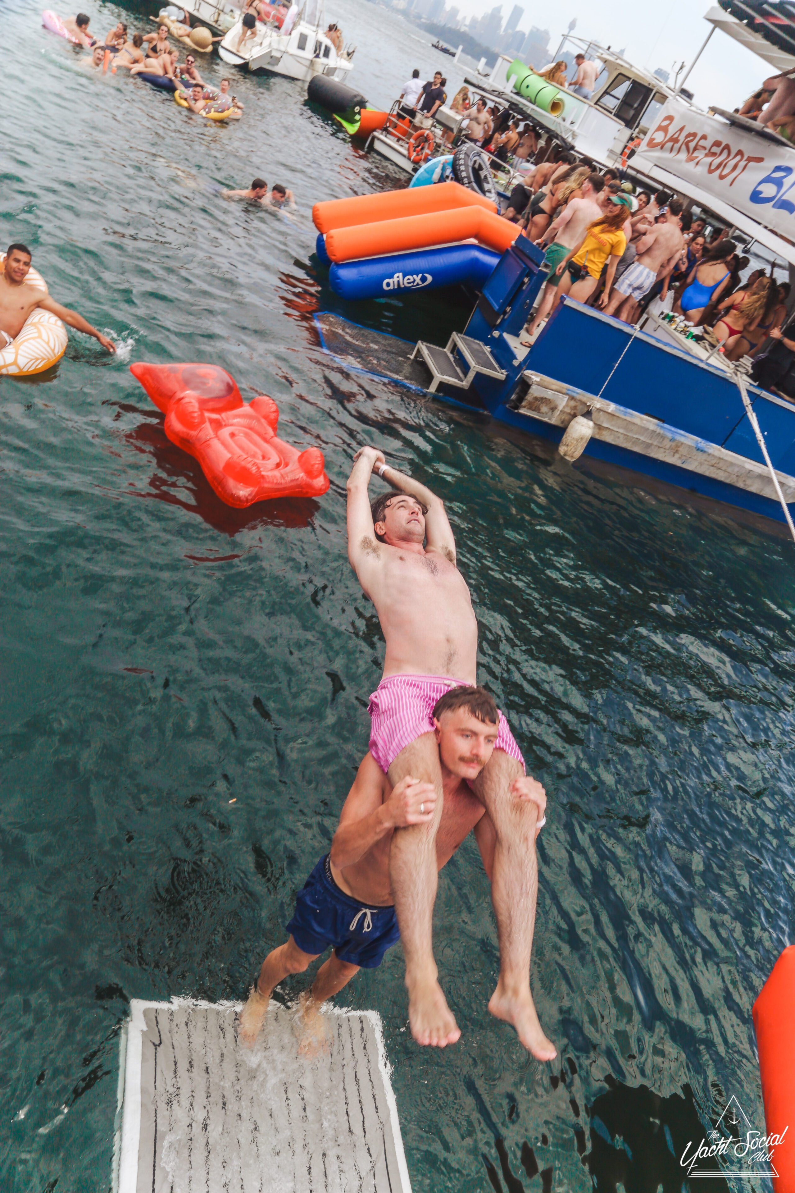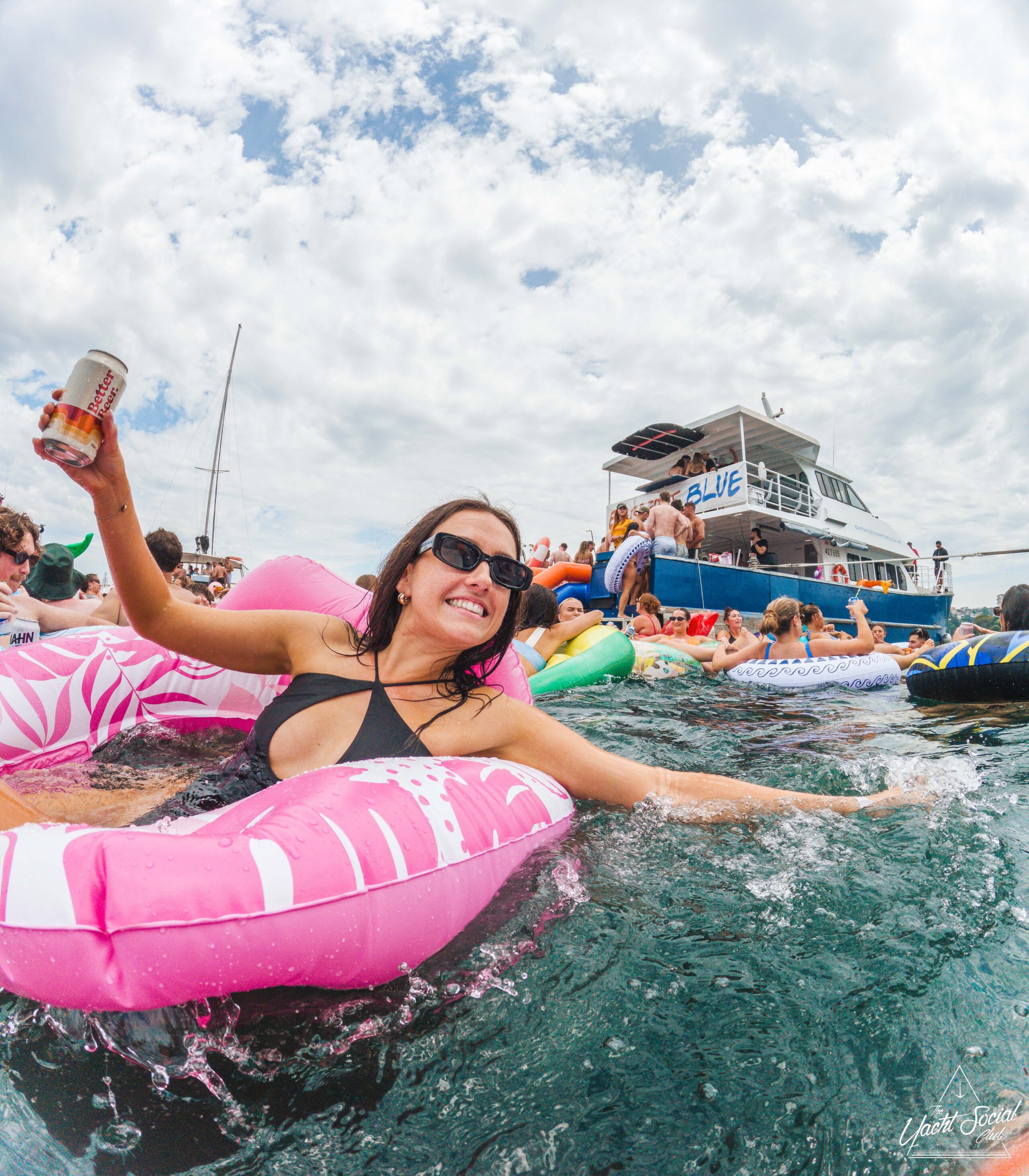Two women in swimsuits smile and pose with drinks on a float, while a lively crowd enjoys a party on the water with boats, inflatables, and people swimming in the background on a cloudy day.