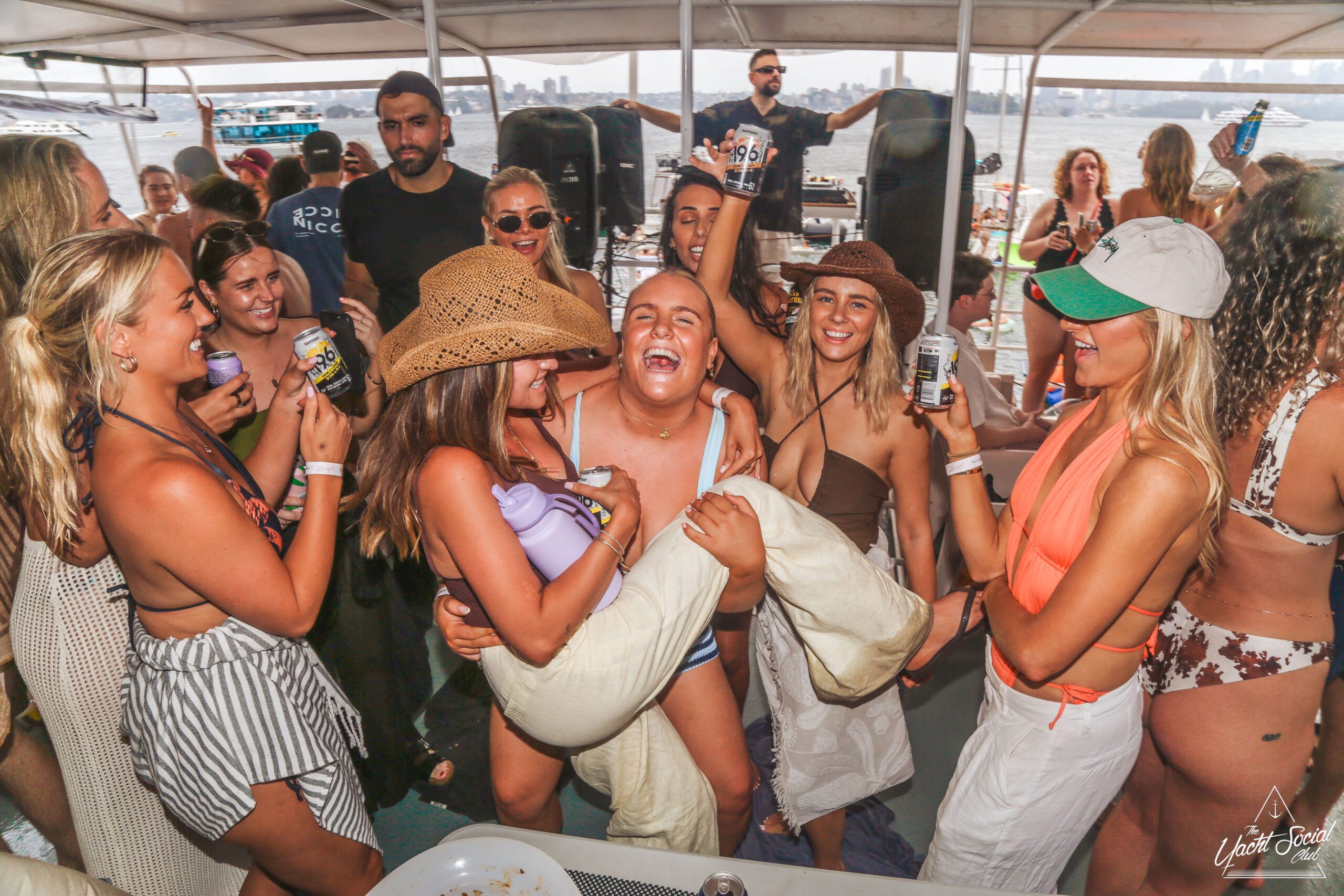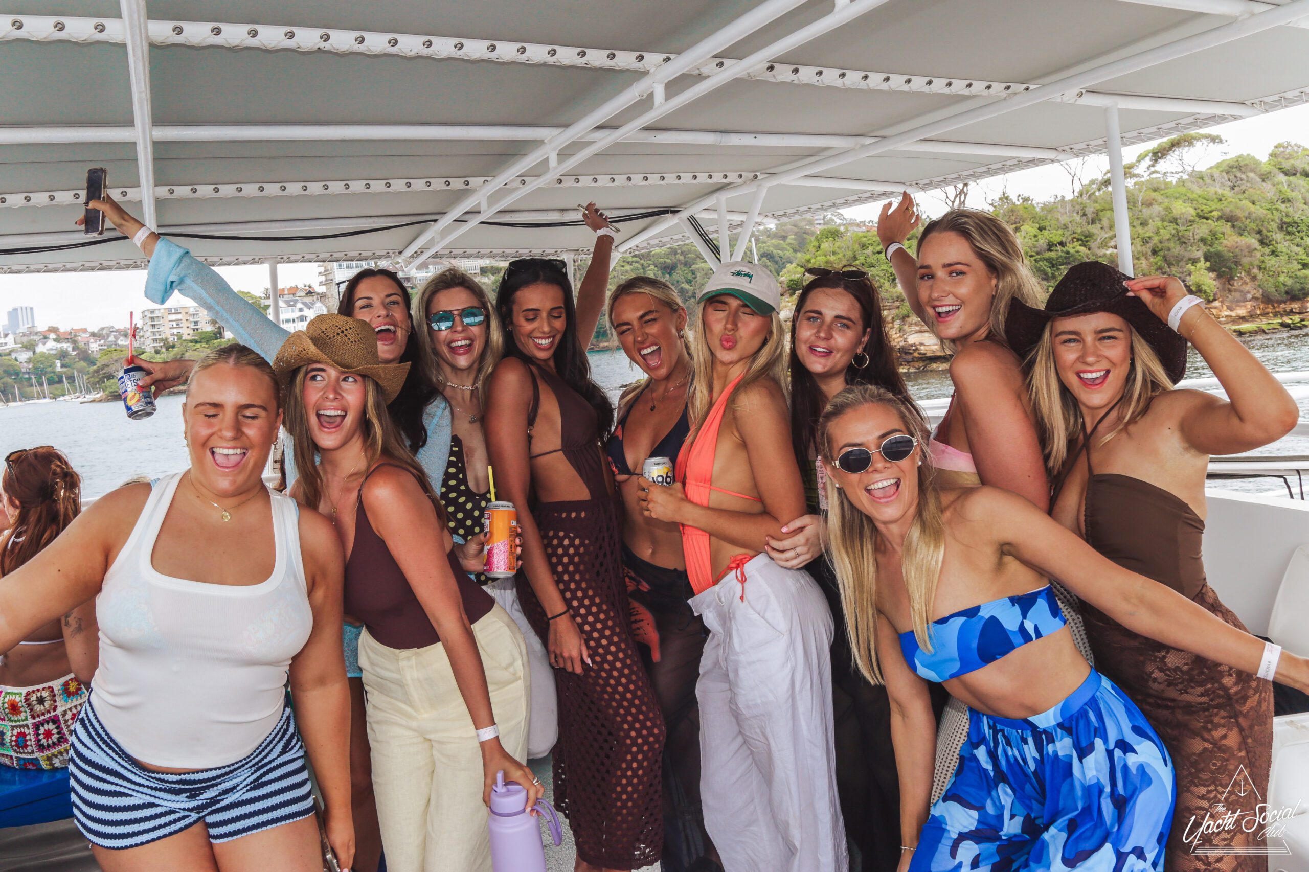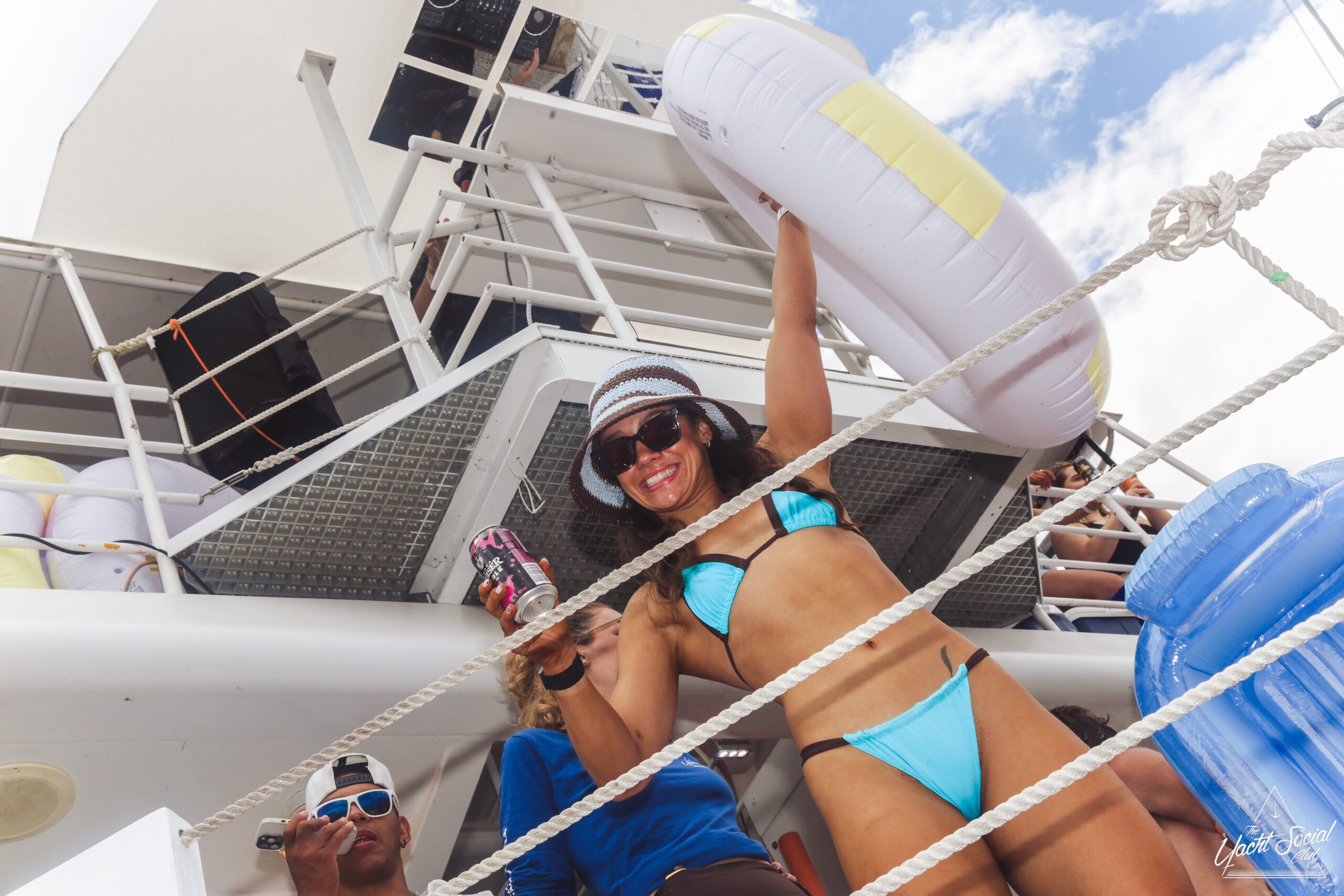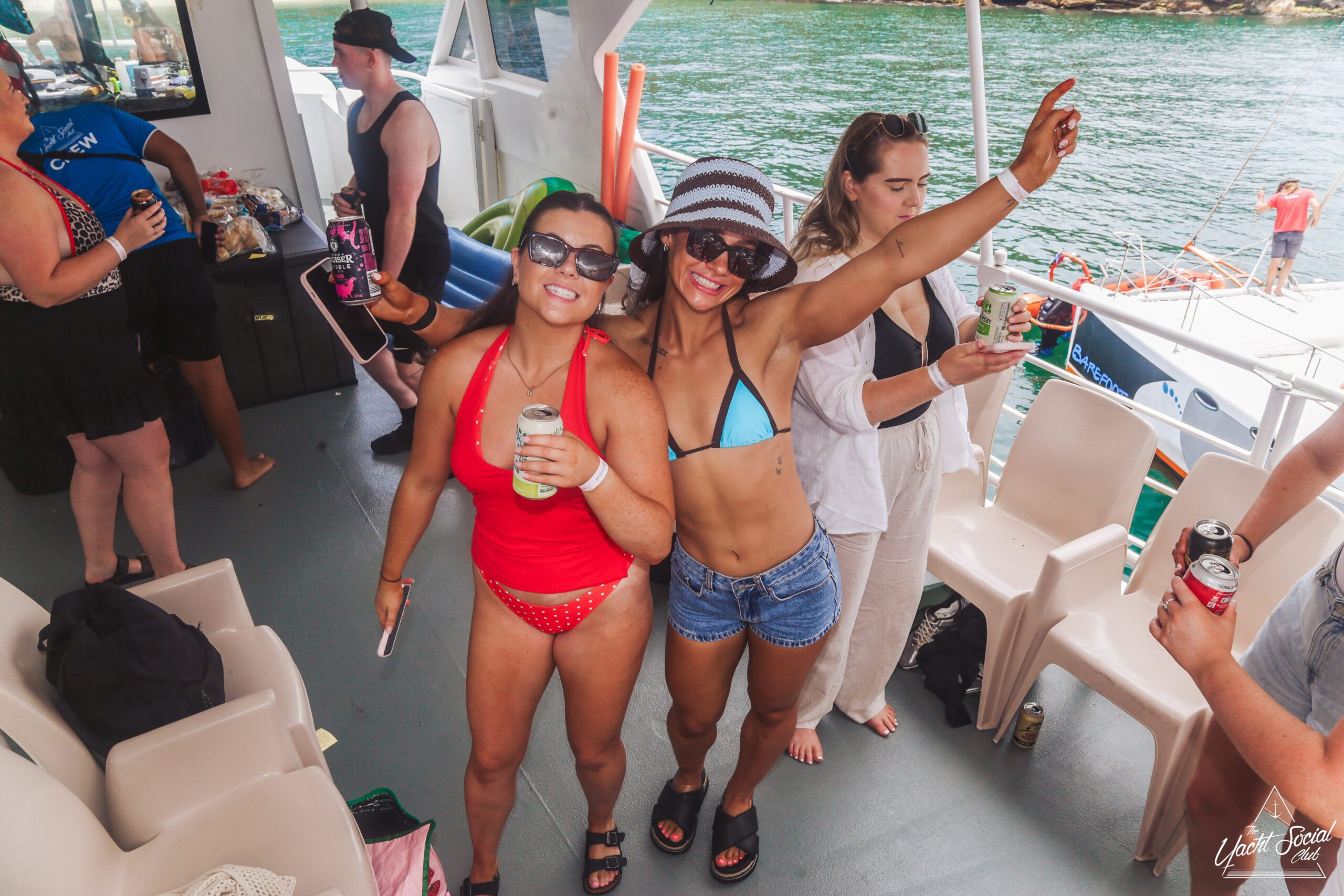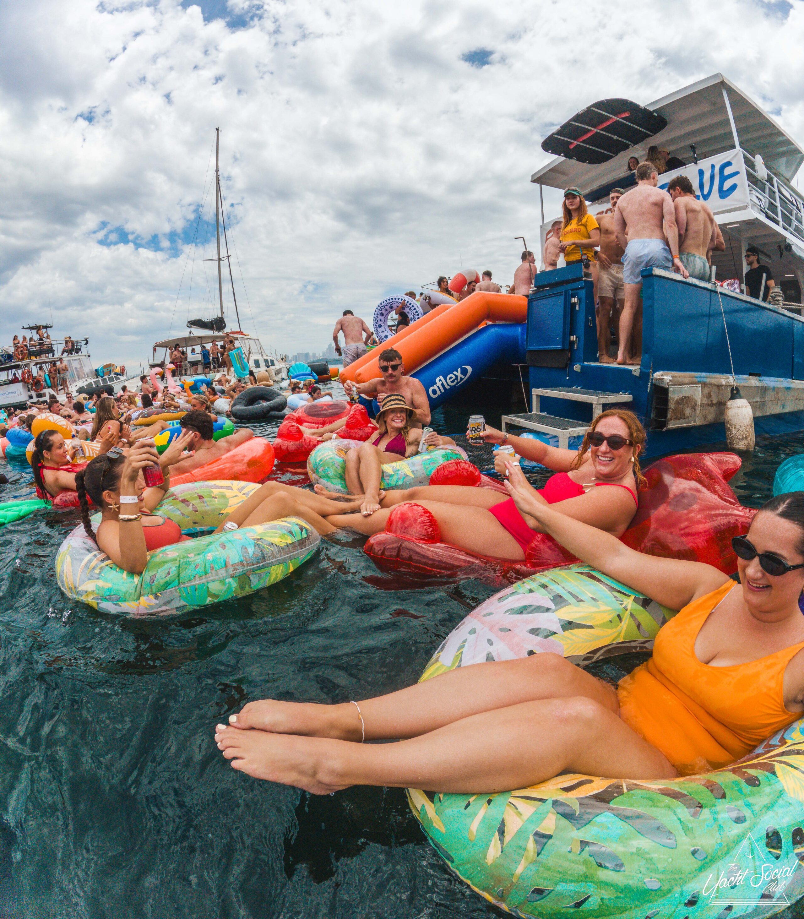 A group of women in swimsuits relax and socialize on the deck of a yacht, with drinks in hand. Other partygoers and boats are visible on the water, and a city skyline appears in the background under a partly cloudy sky.