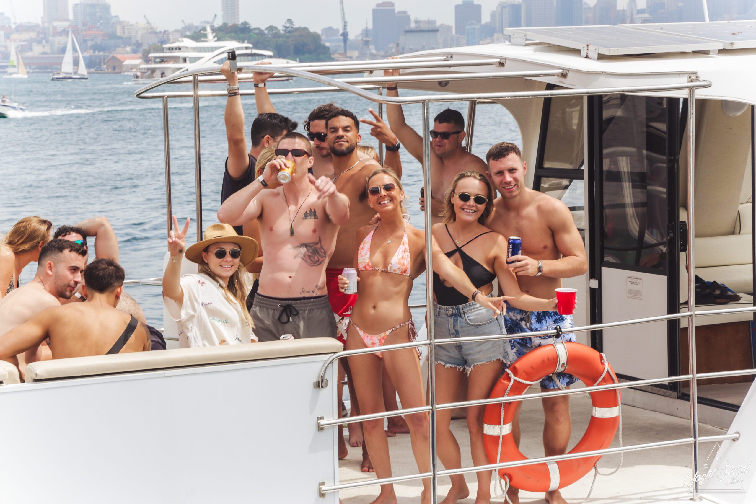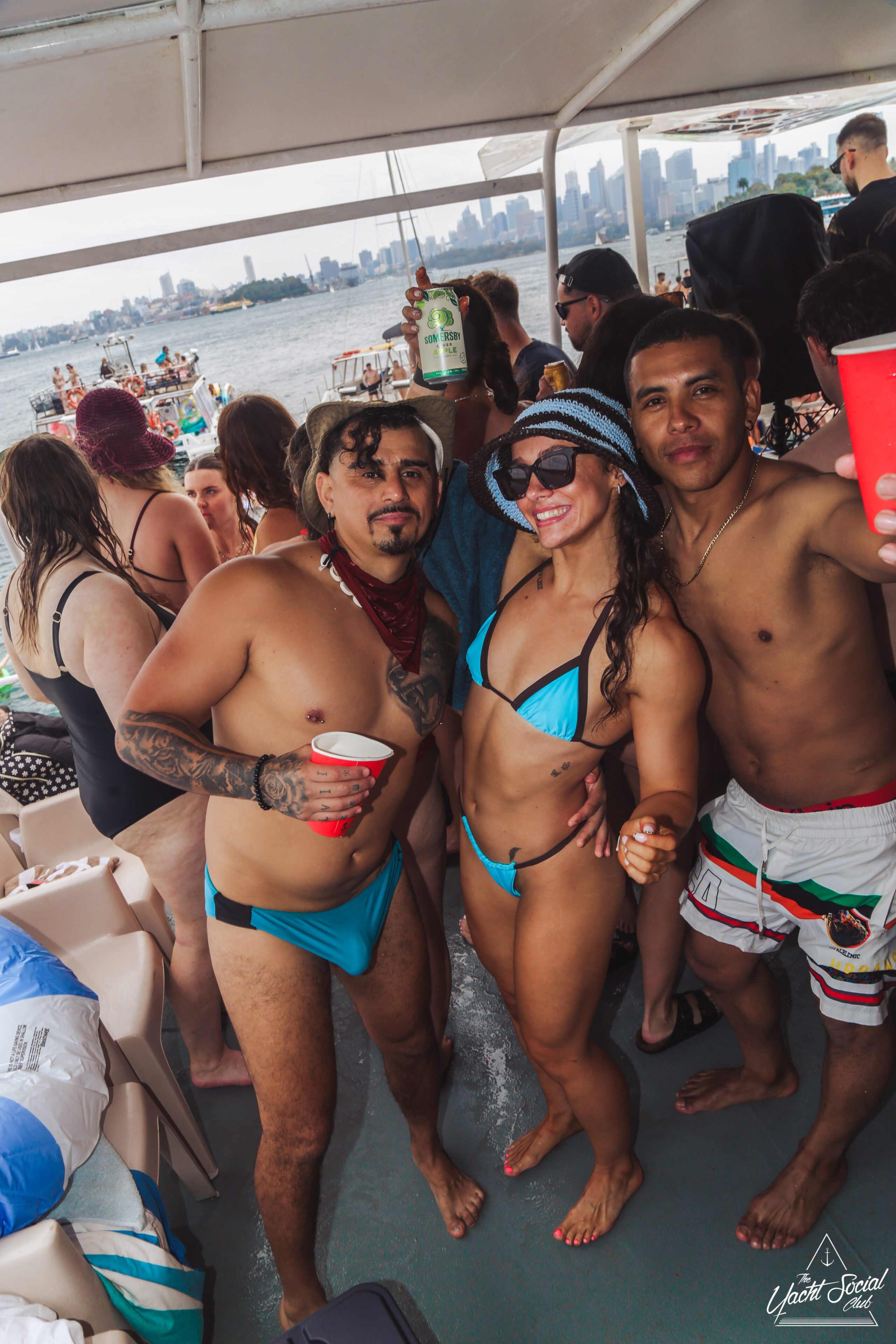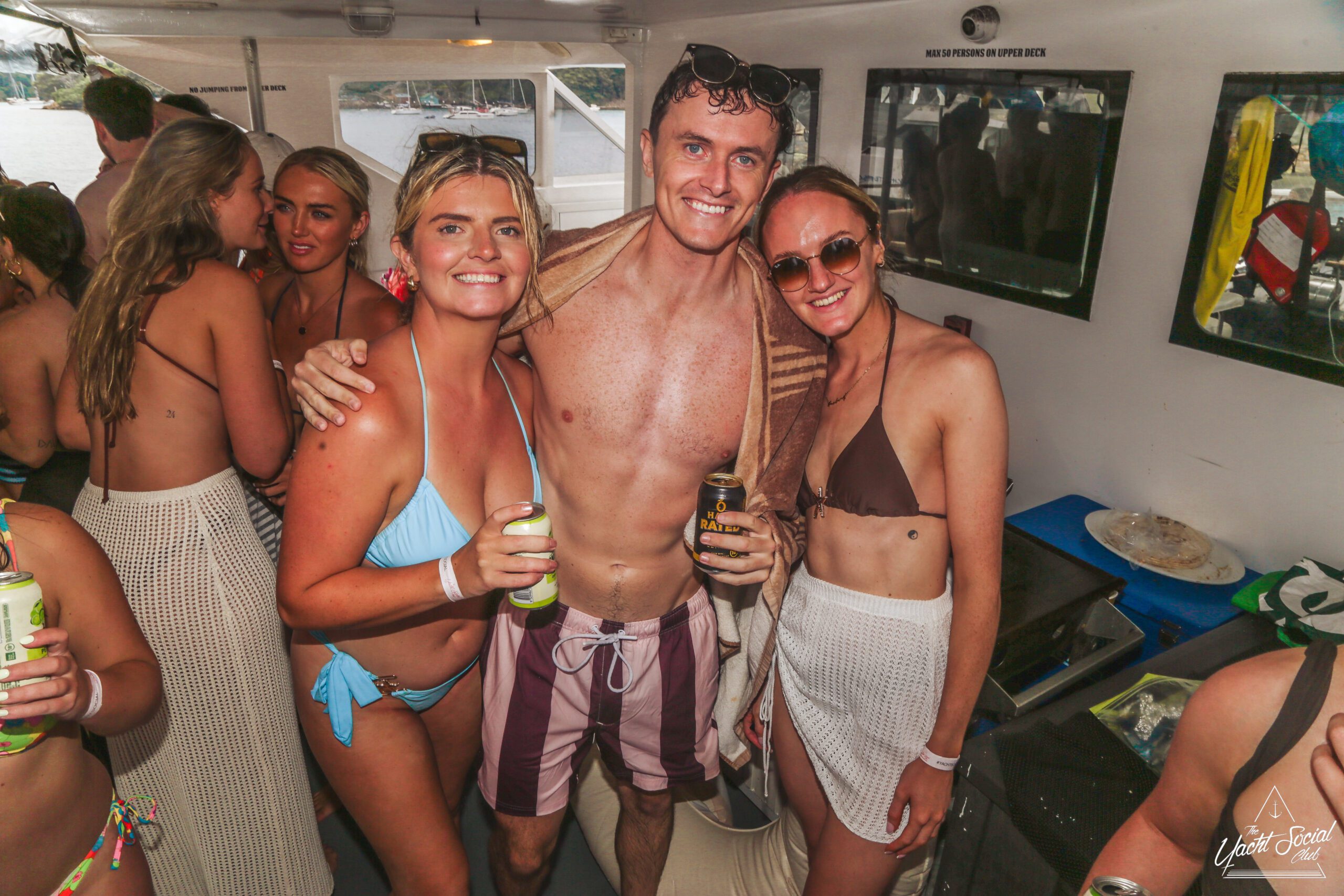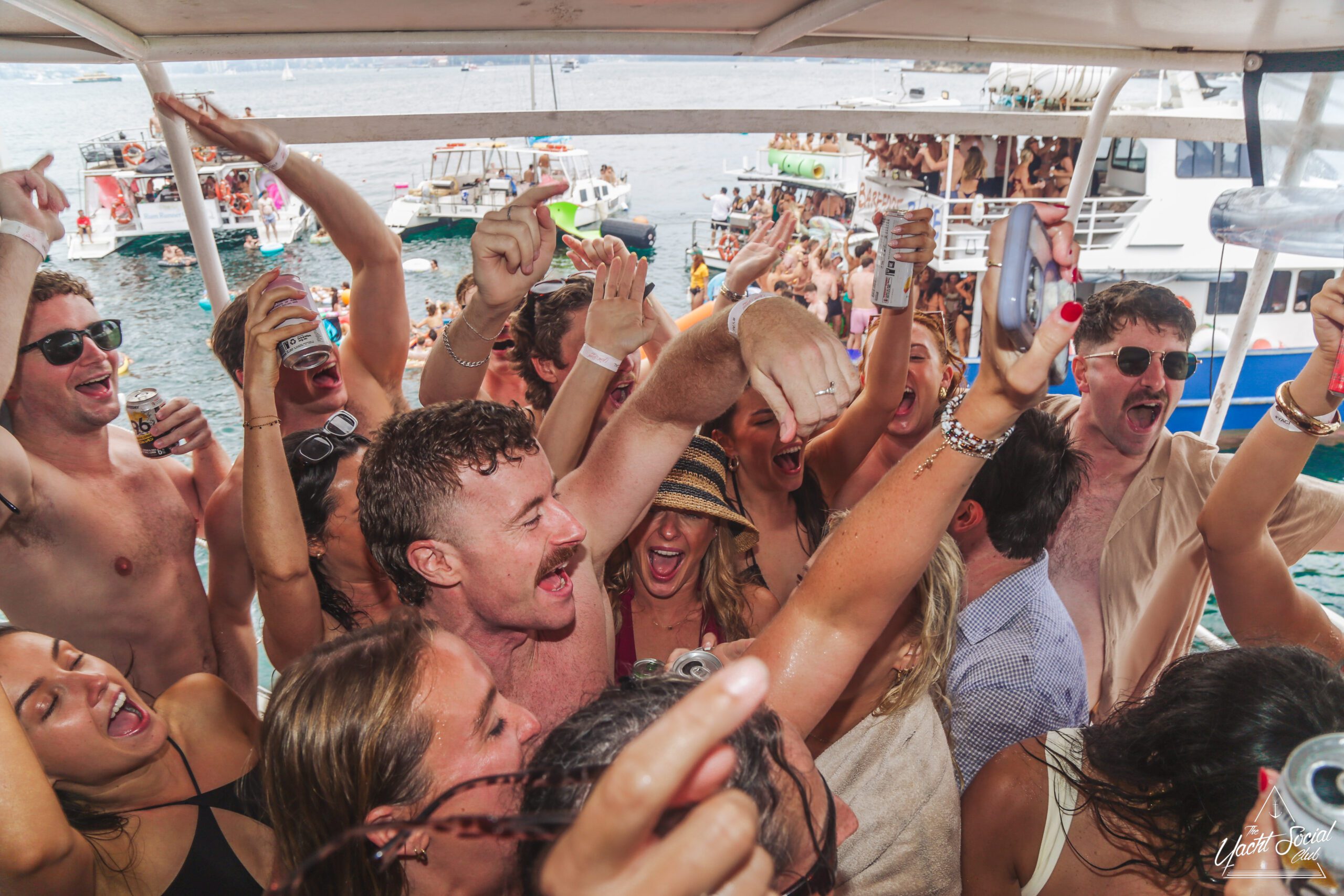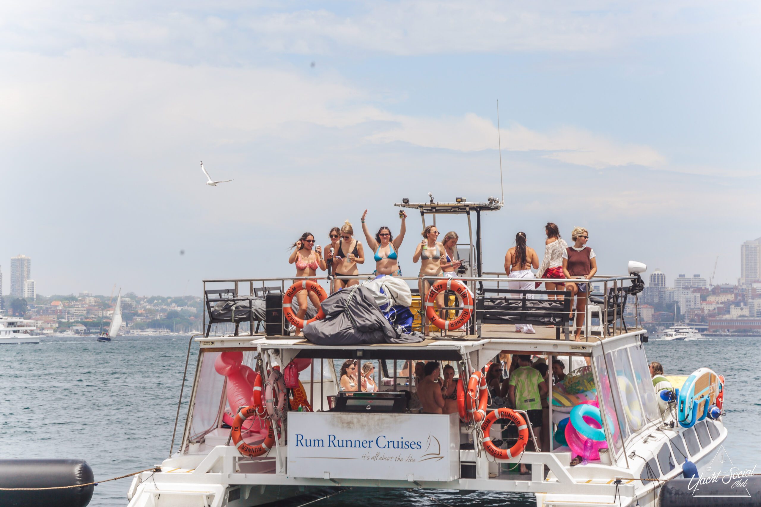 A group of women in swimsuits relax and socialize on the deck of a yacht, with drinks in hand. Other partygoers and boats are visible on the water, and a city skyline appears in the background under a partly cloudy sky.