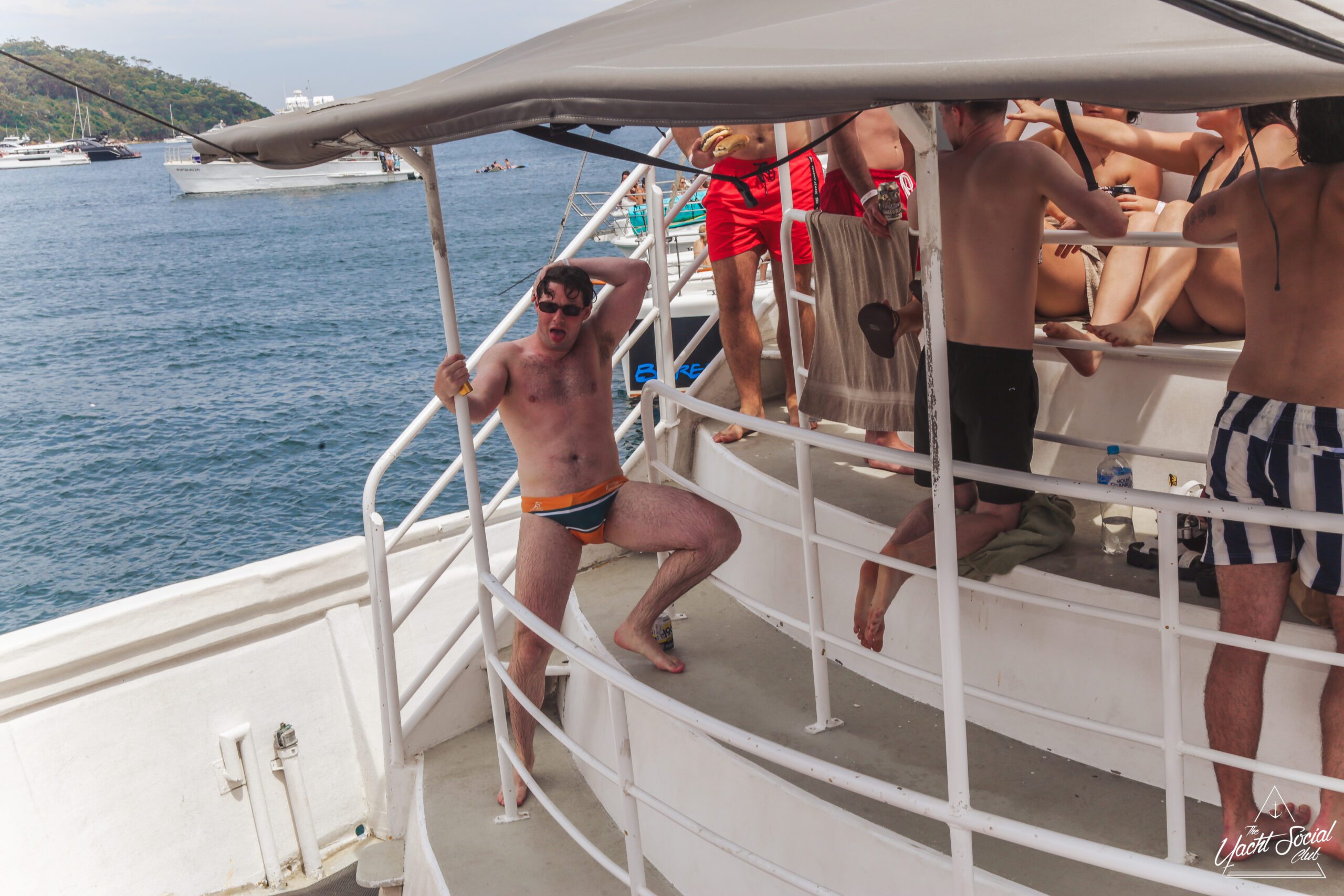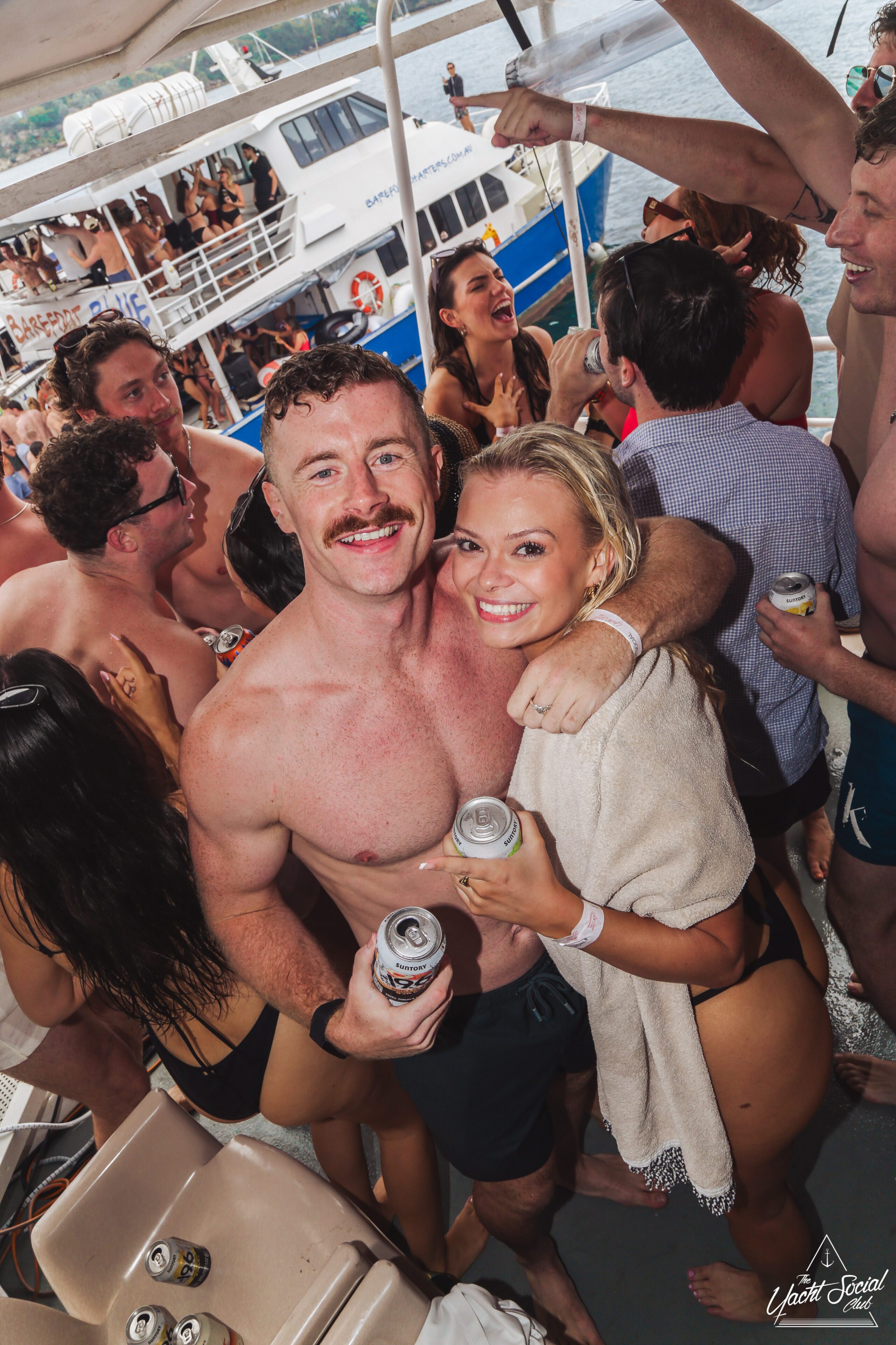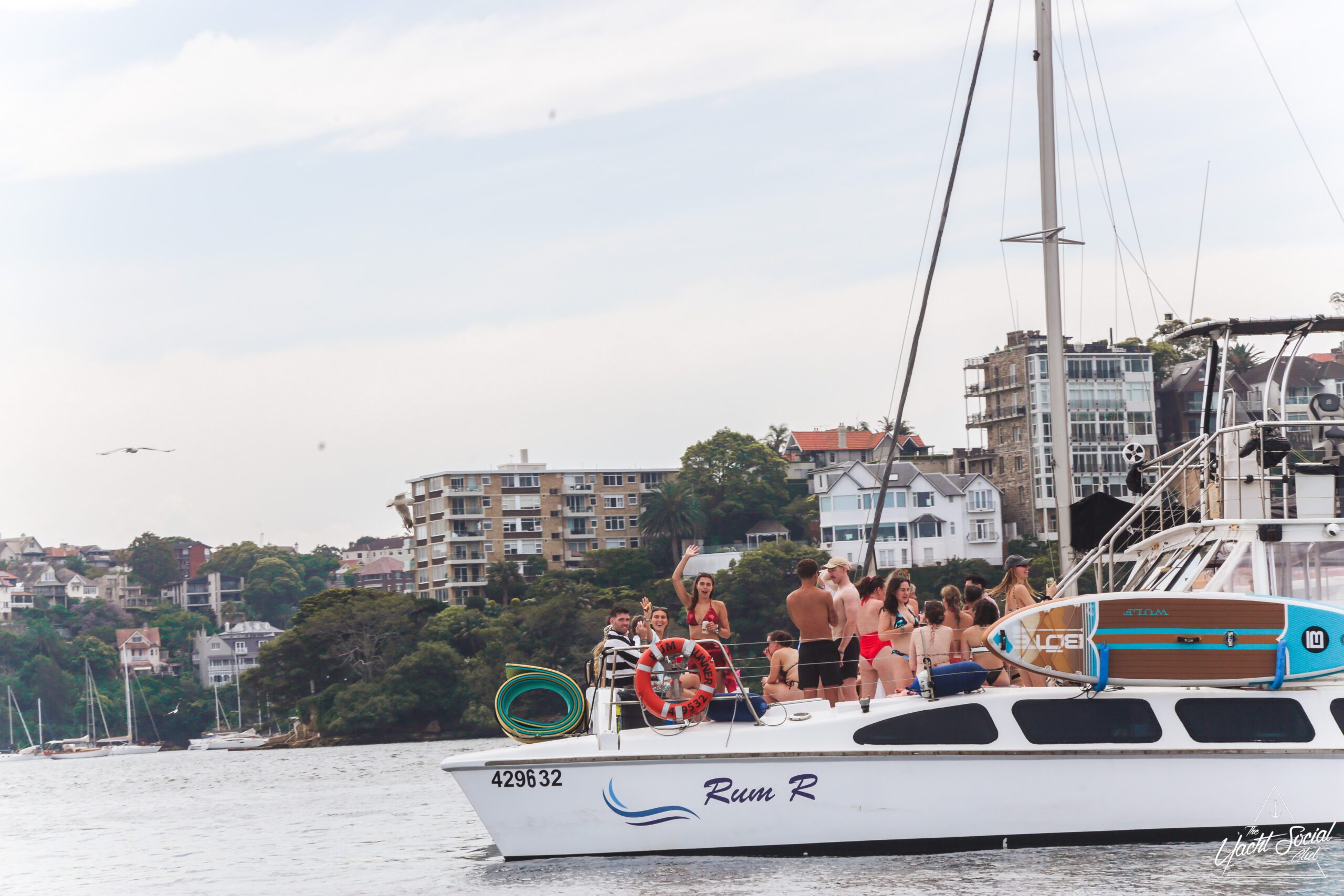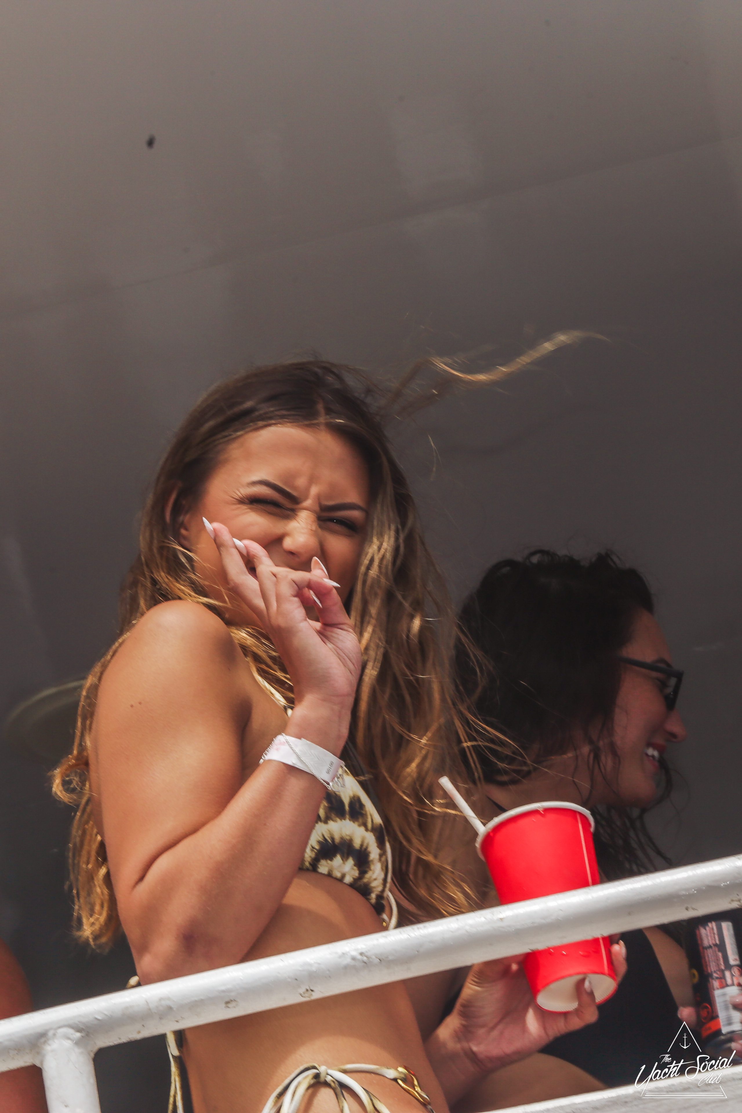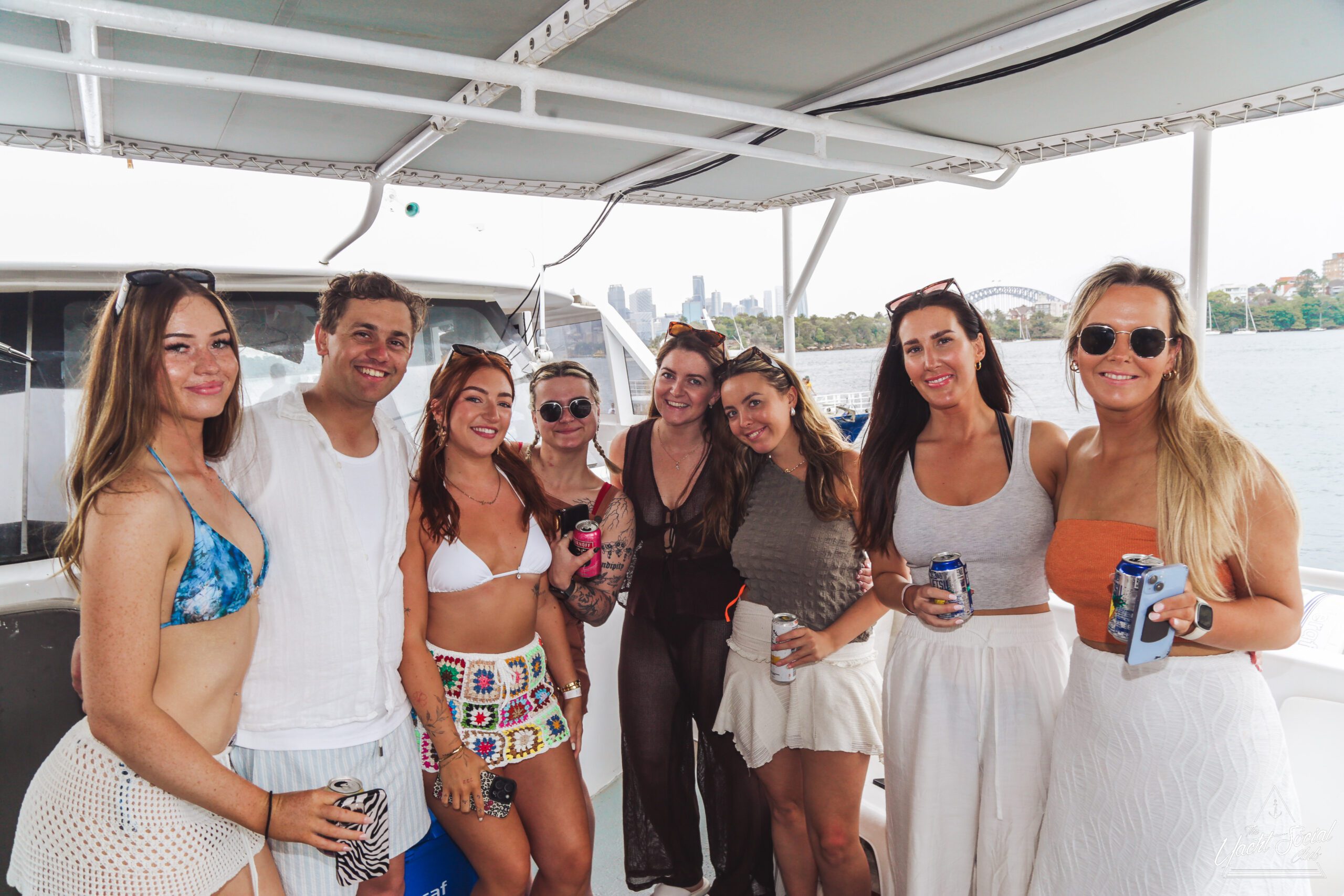 A group of women in swimsuits relax and socialize on the deck of a yacht, with drinks in hand. Other partygoers and boats are visible on the water, and a city skyline appears in the background under a partly cloudy sky.