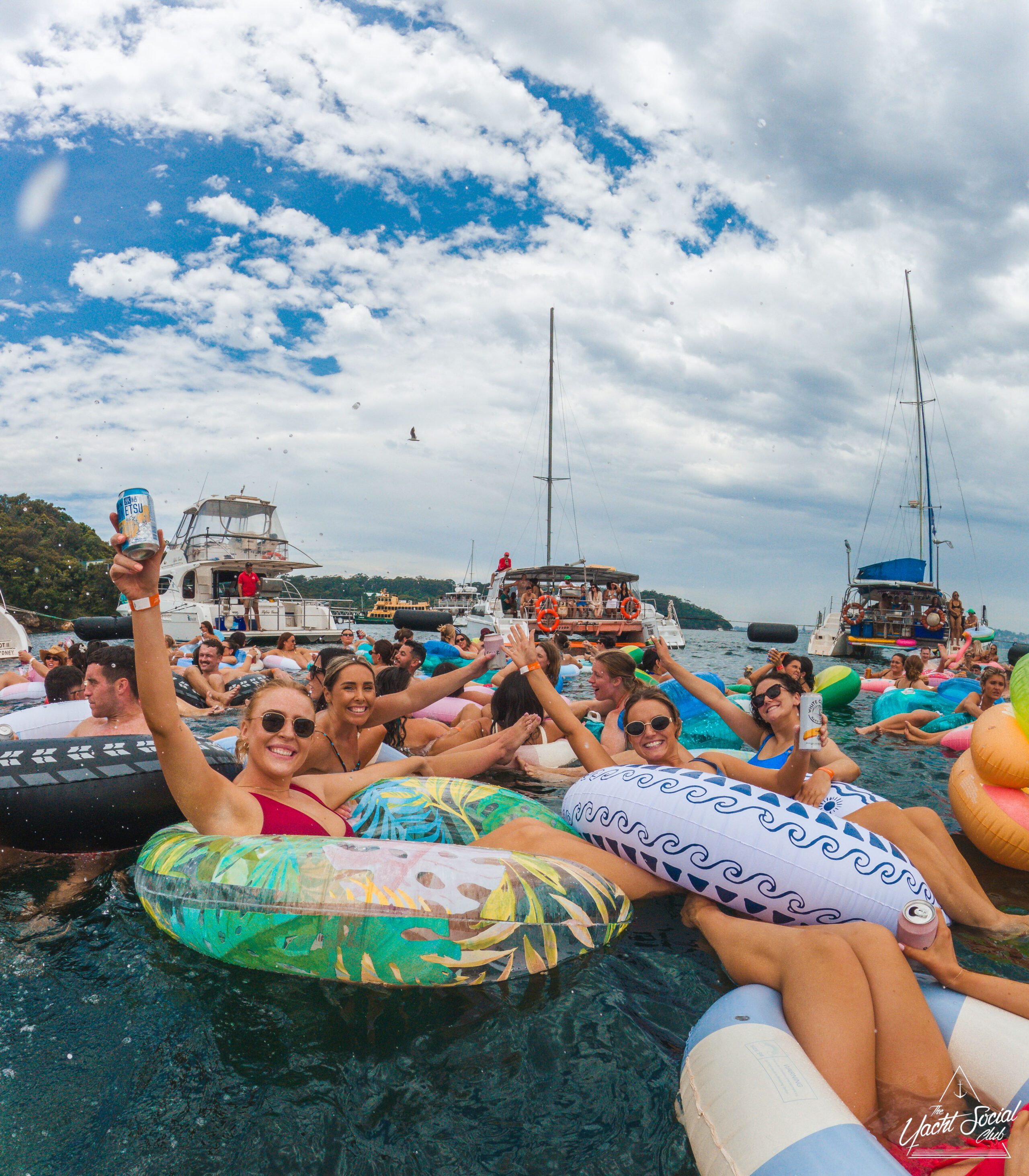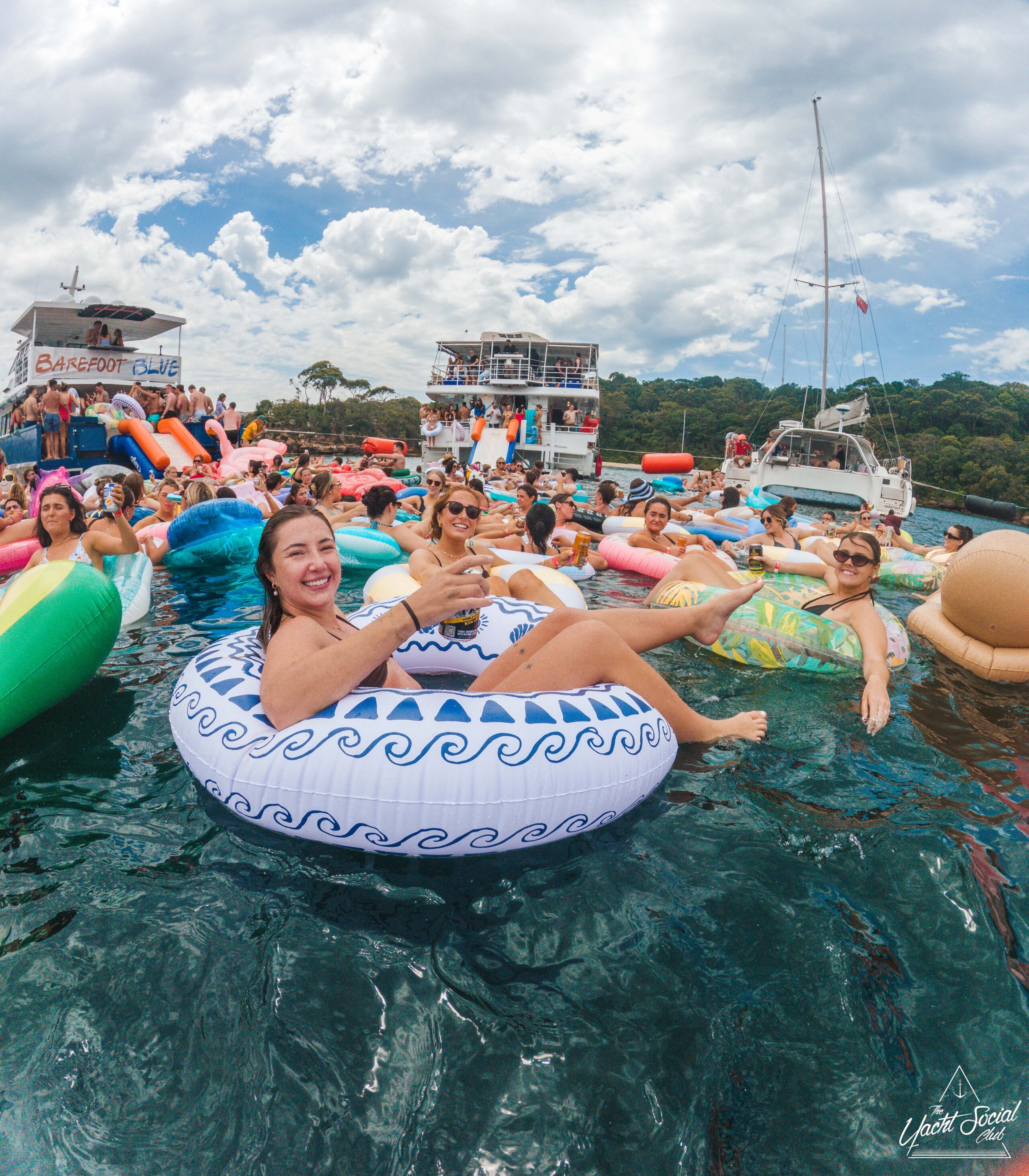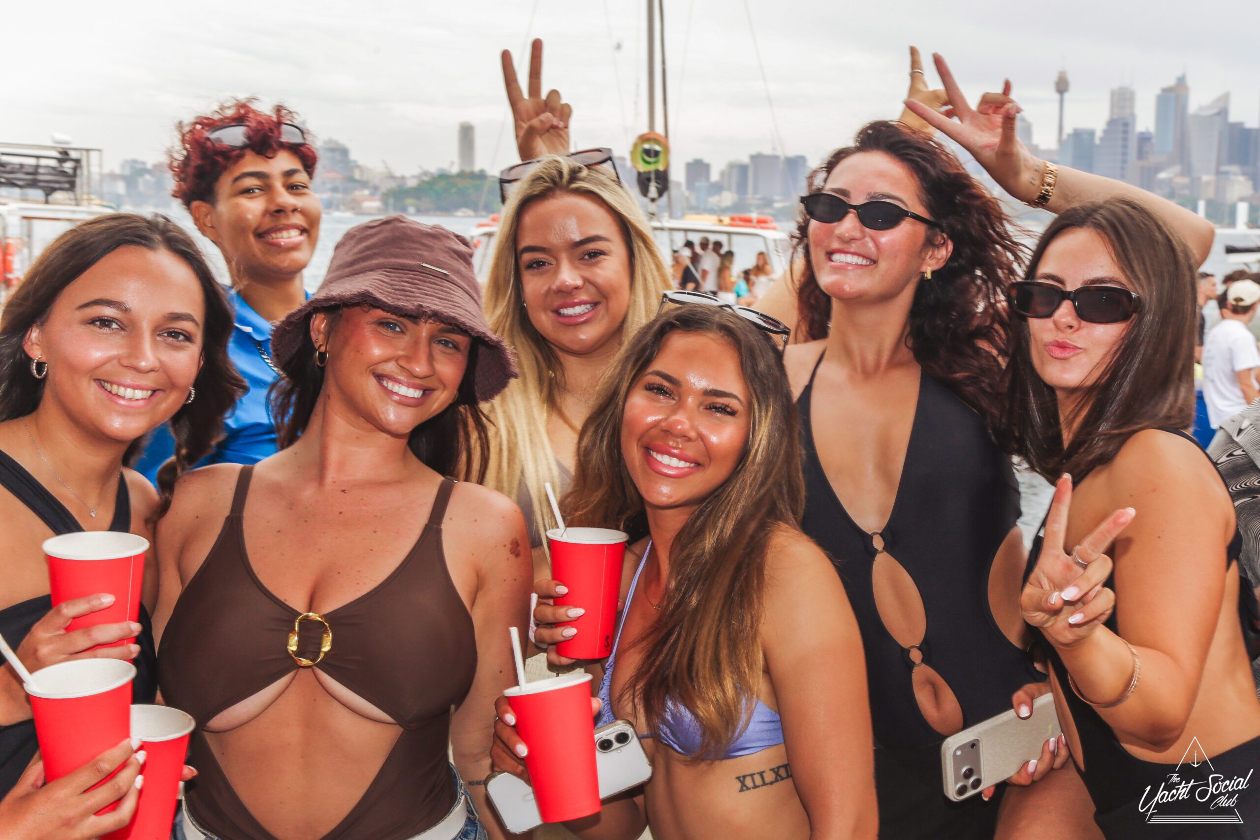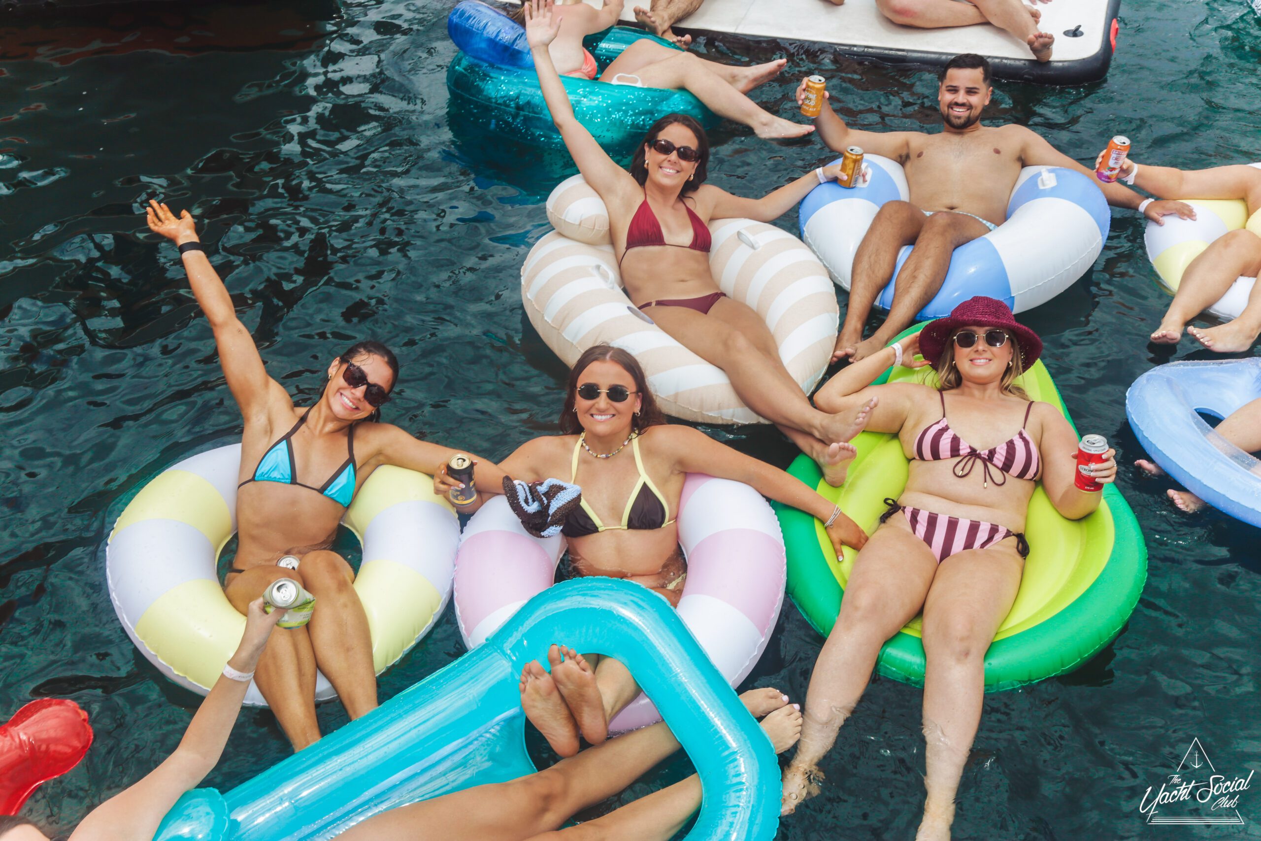 Five women in swimsuits and sunglasses smile and pose with drinks on a crowded boat party. Other people are swimming and relaxing on inflatables nearby, with a large boat in the background under a cloudy sky.