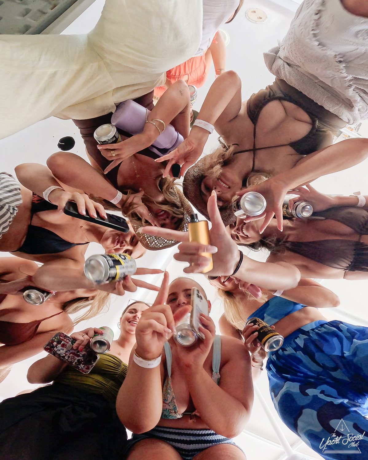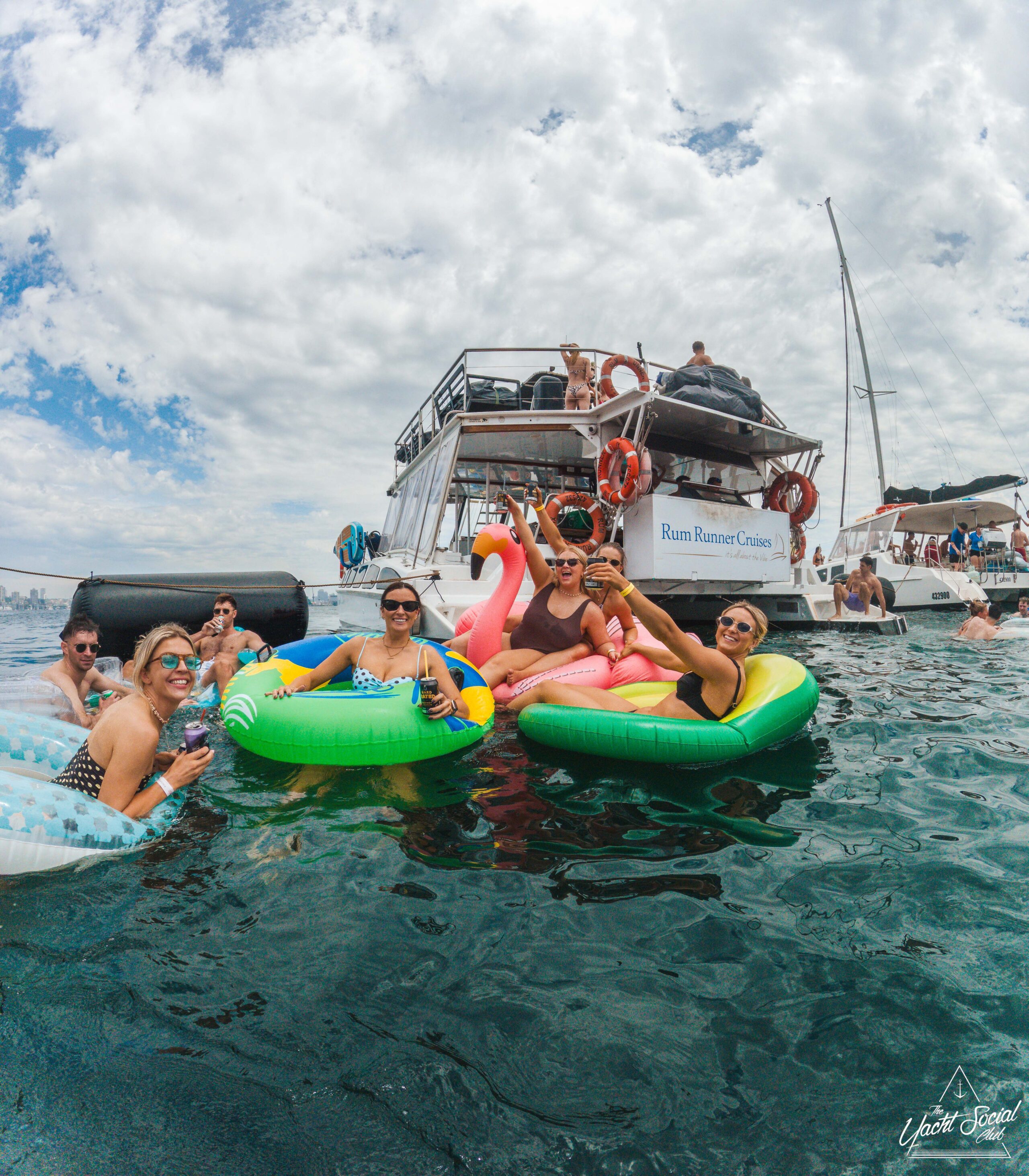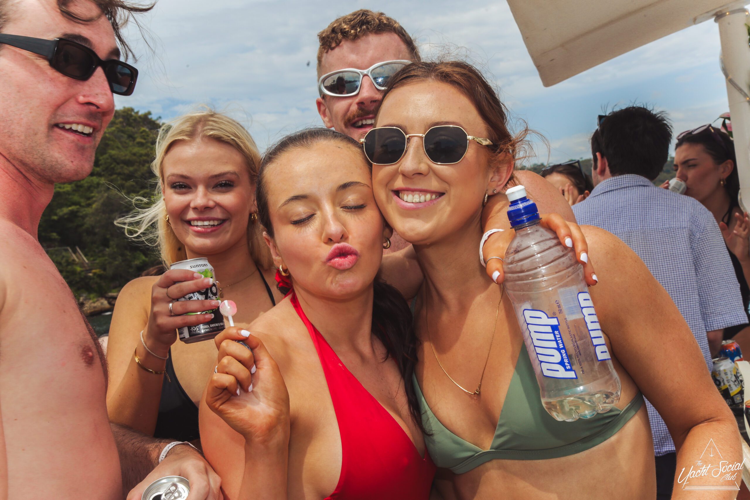 Five women in swimsuits and sunglasses smile and pose with drinks on a crowded boat party. Other people are swimming and relaxing on inflatables nearby, with a large boat in the background under a cloudy sky.