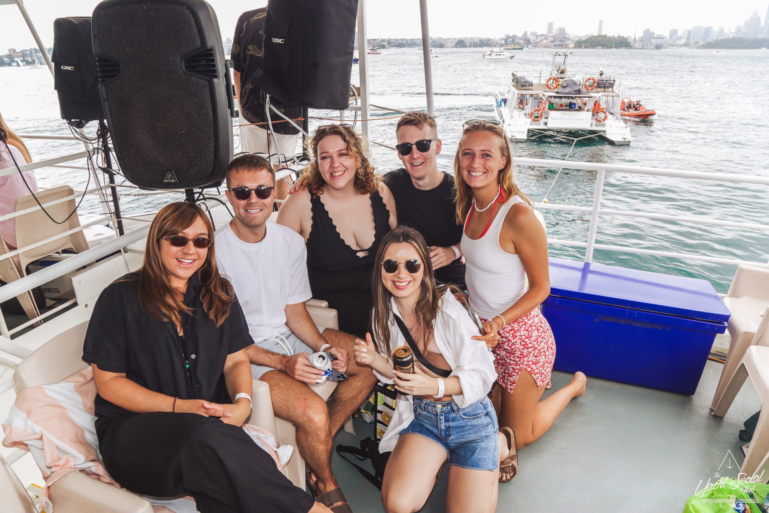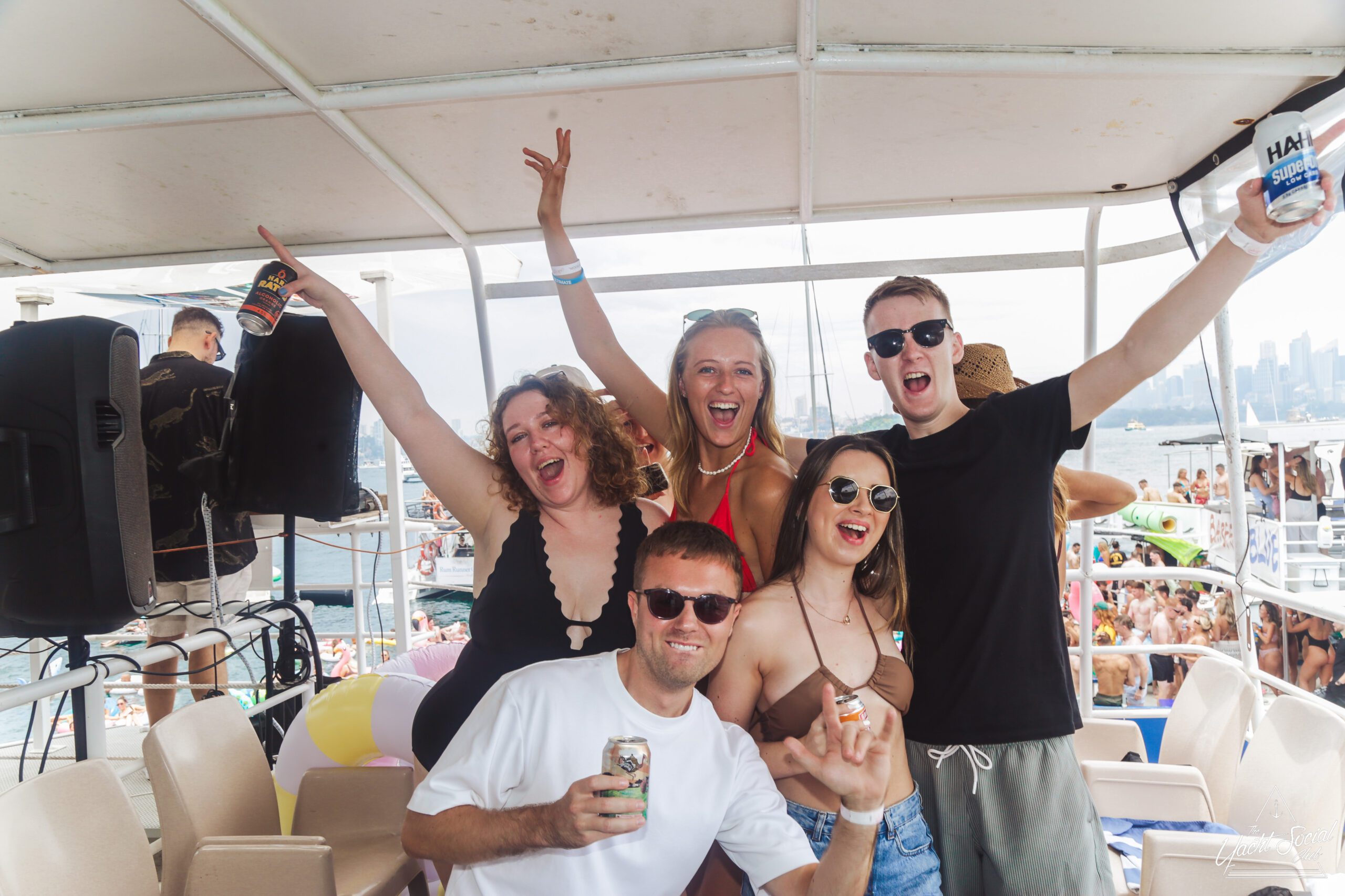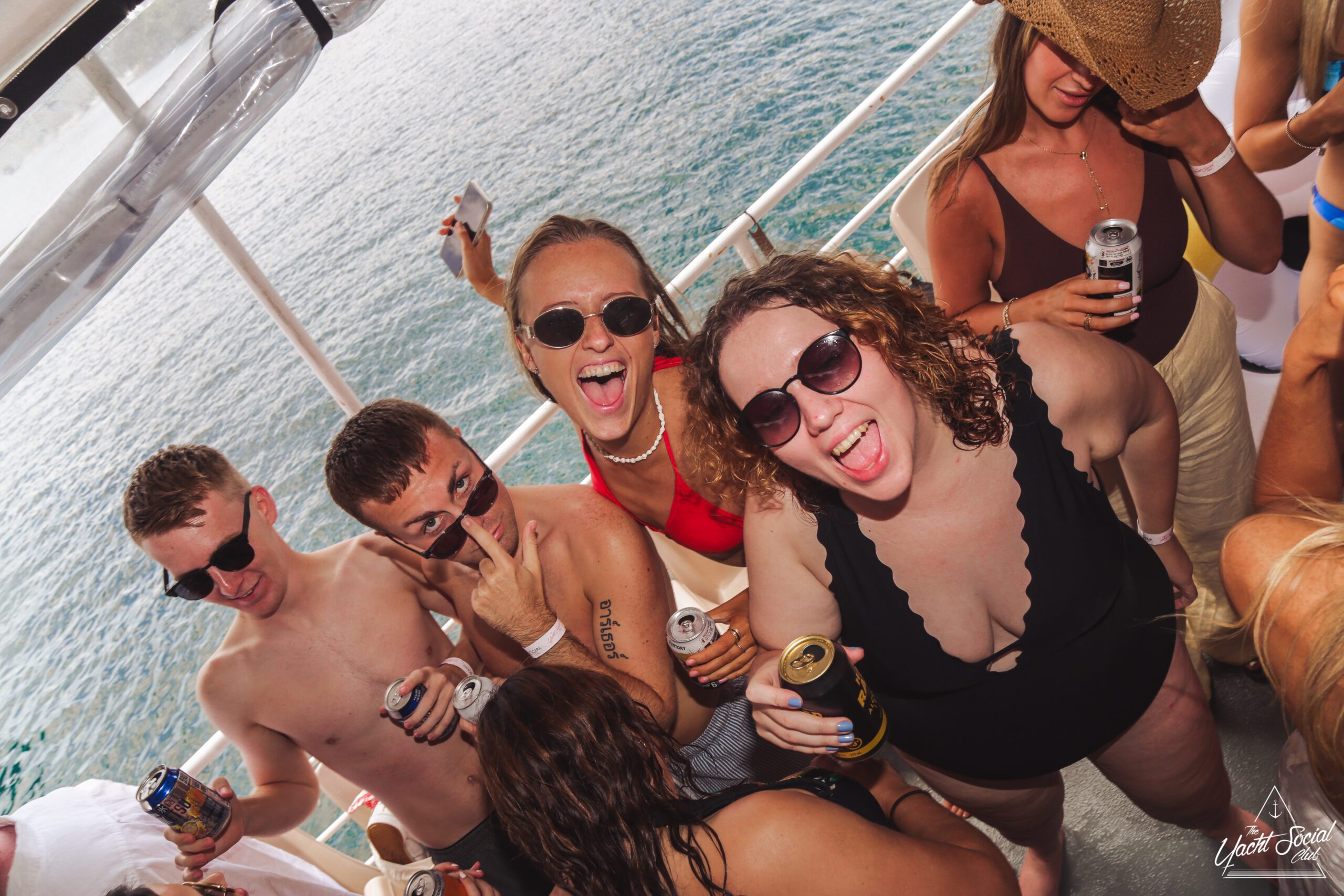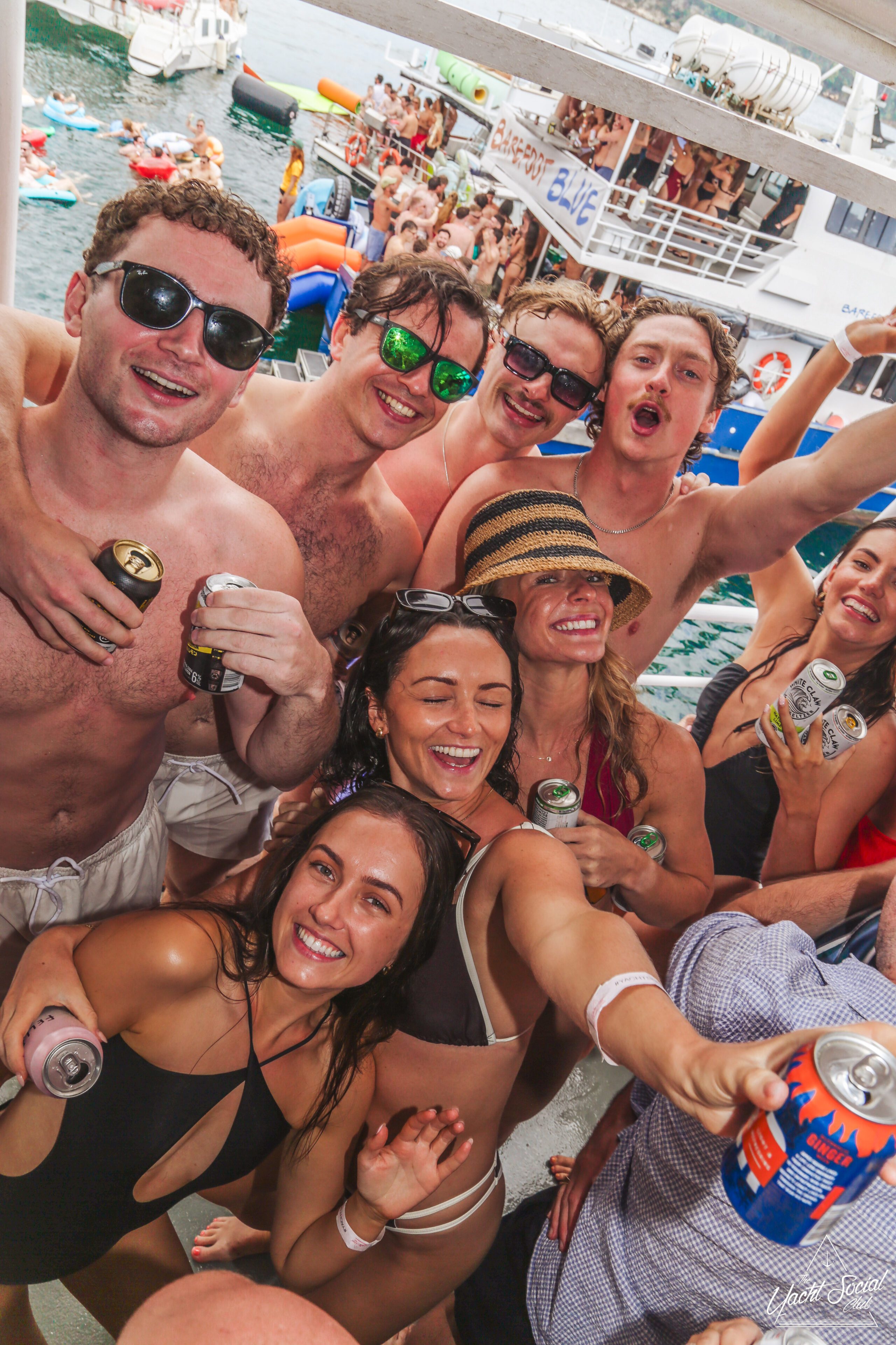 Five women in swimsuits and sunglasses smile and pose with drinks on a crowded boat party. Other people are swimming and relaxing on inflatables nearby, with a large boat in the background under a cloudy sky.