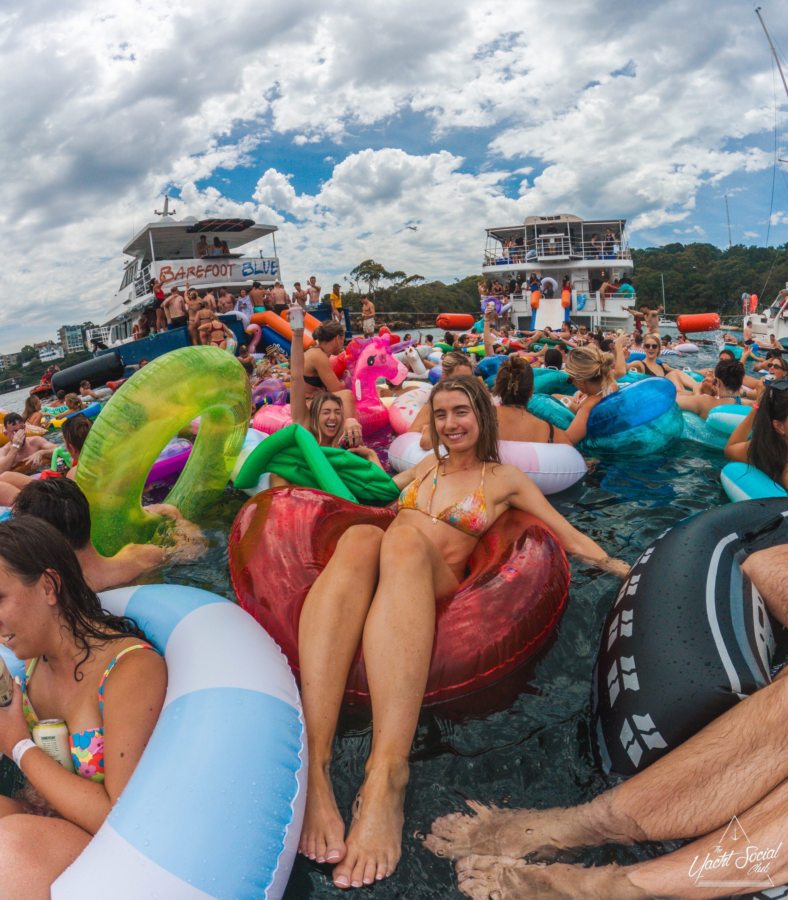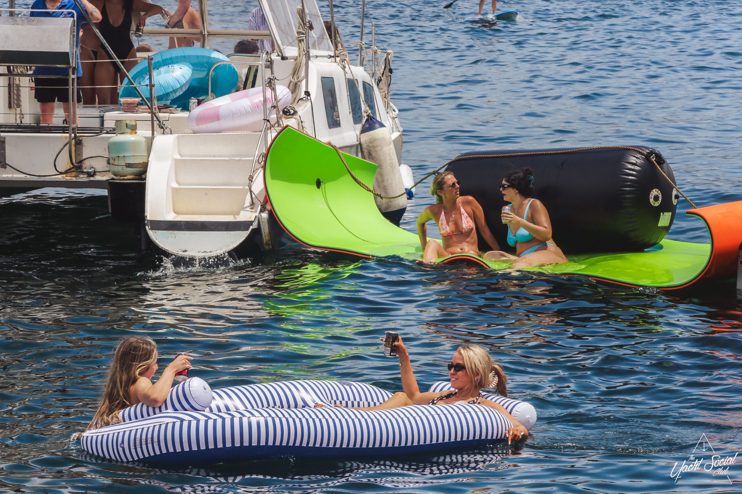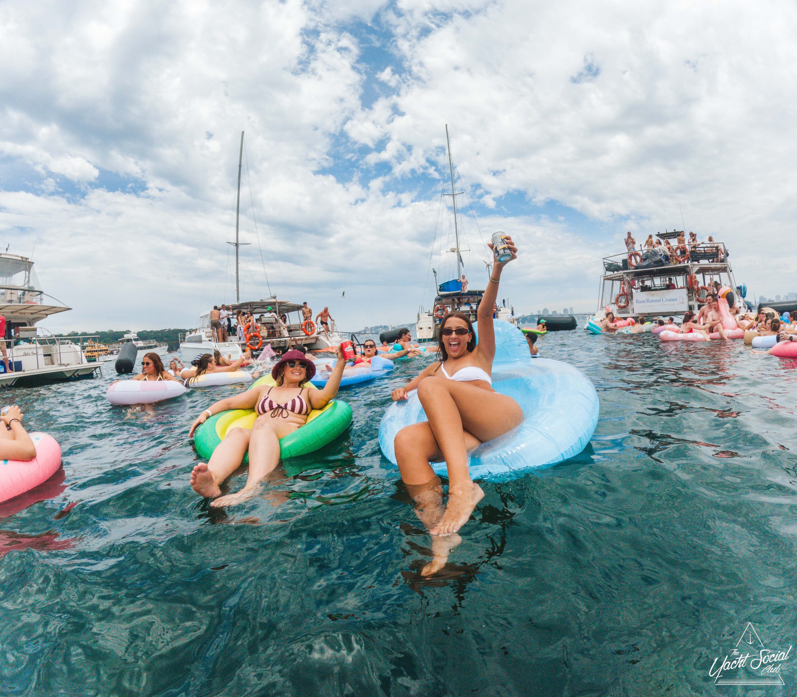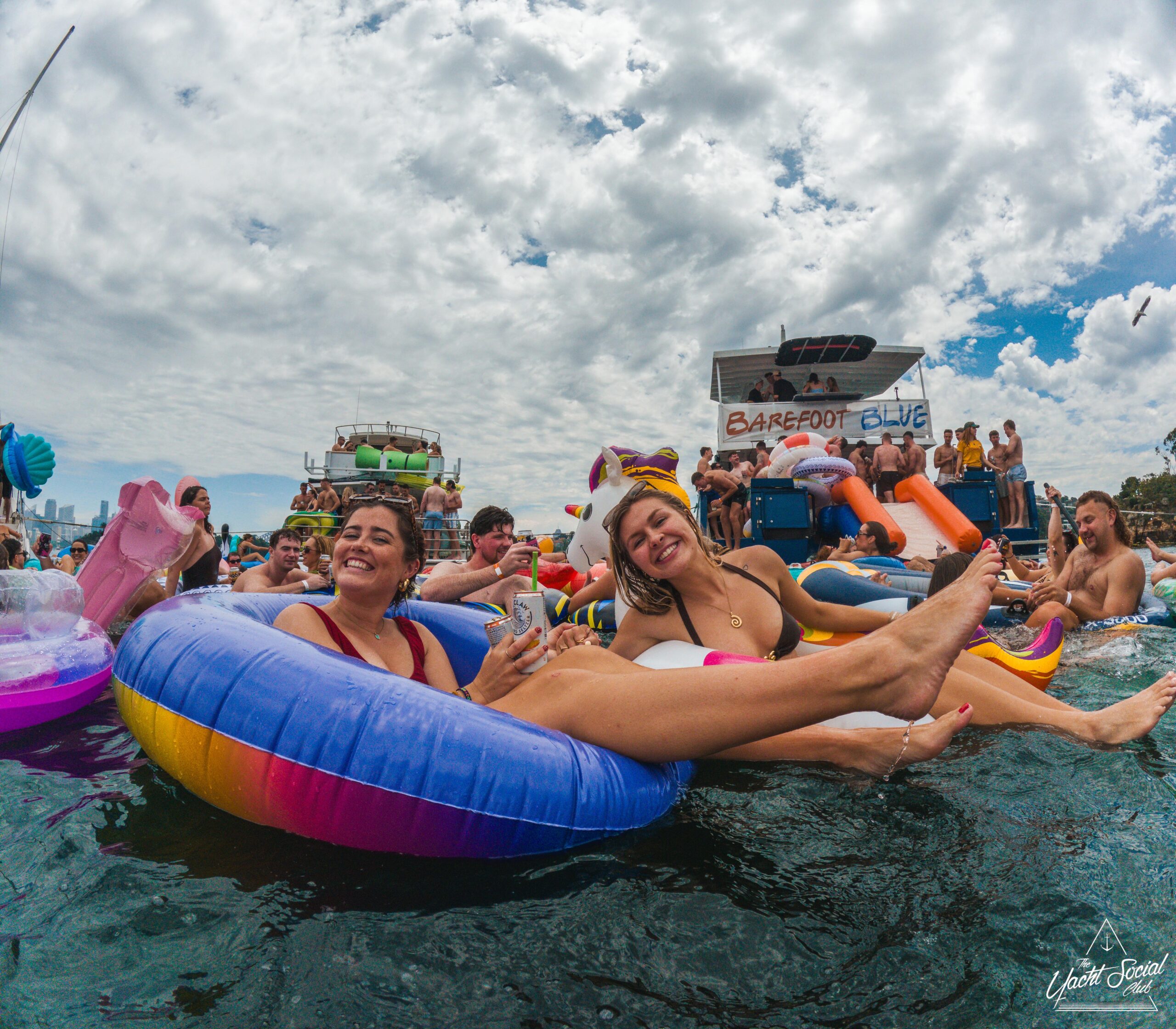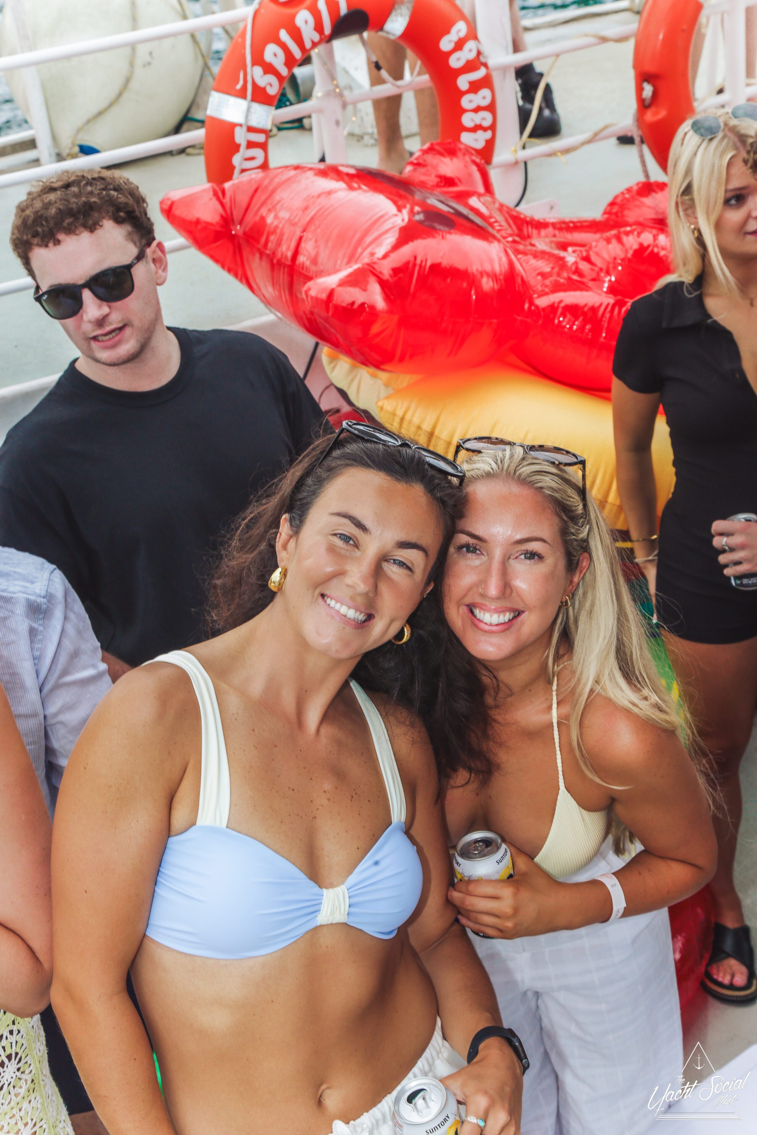 Two women in swimsuits smile and pose on a crowded boat party, surrounded by colorful inflatables and people enjoying the water and festive atmosphere, with boats and a cloudy sky in the background.