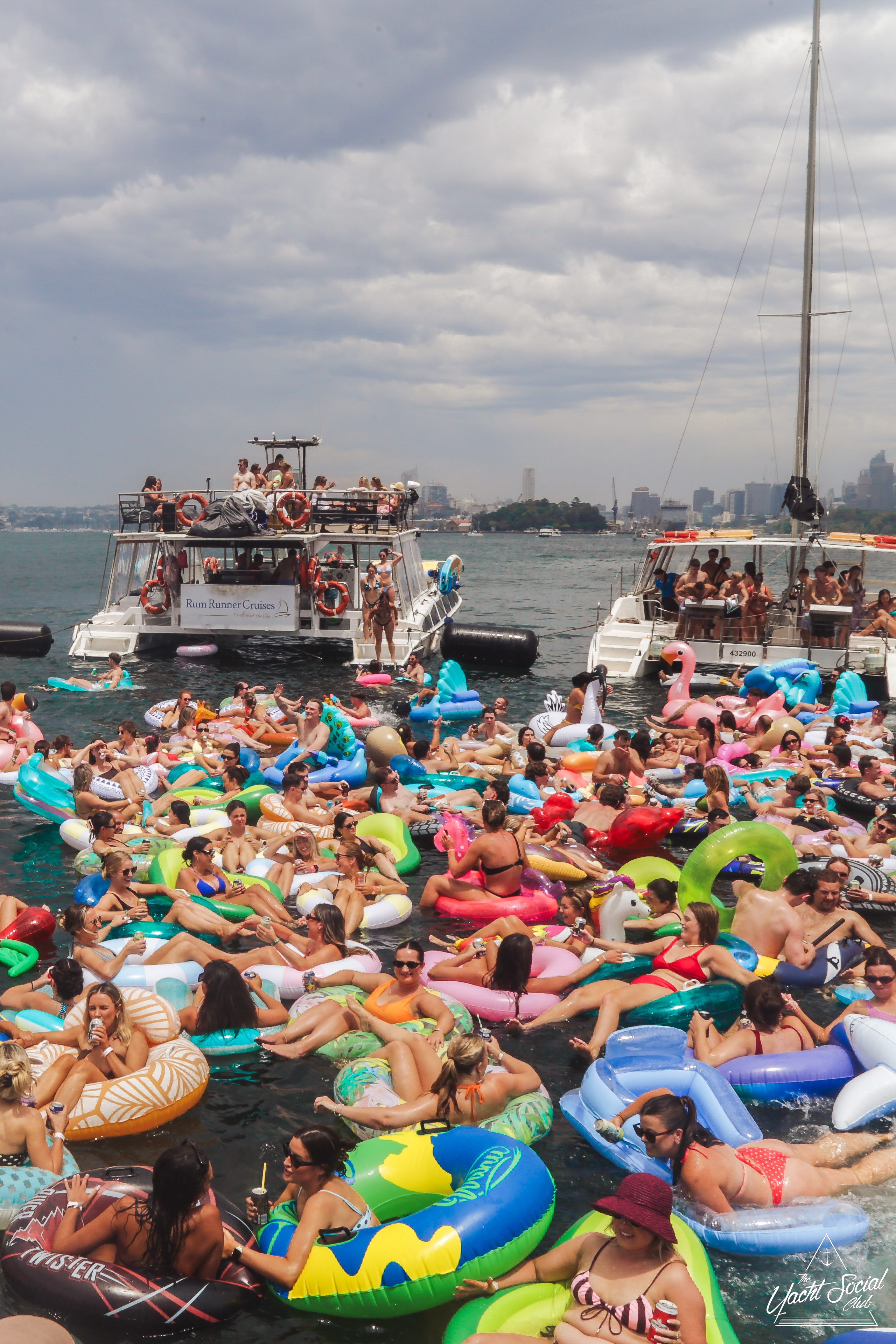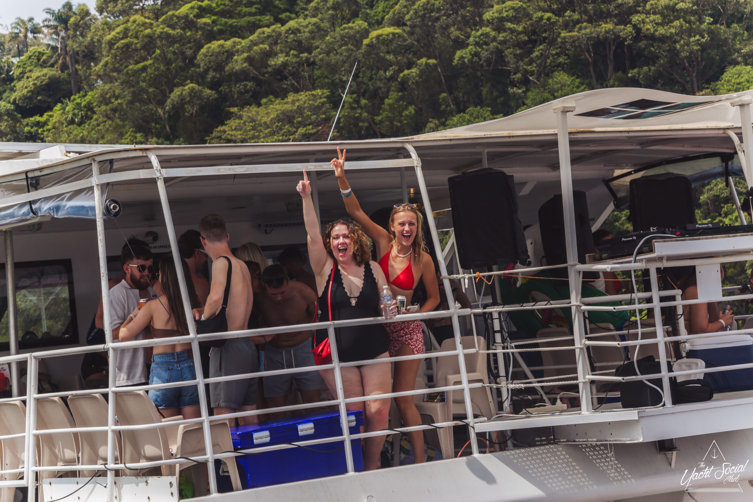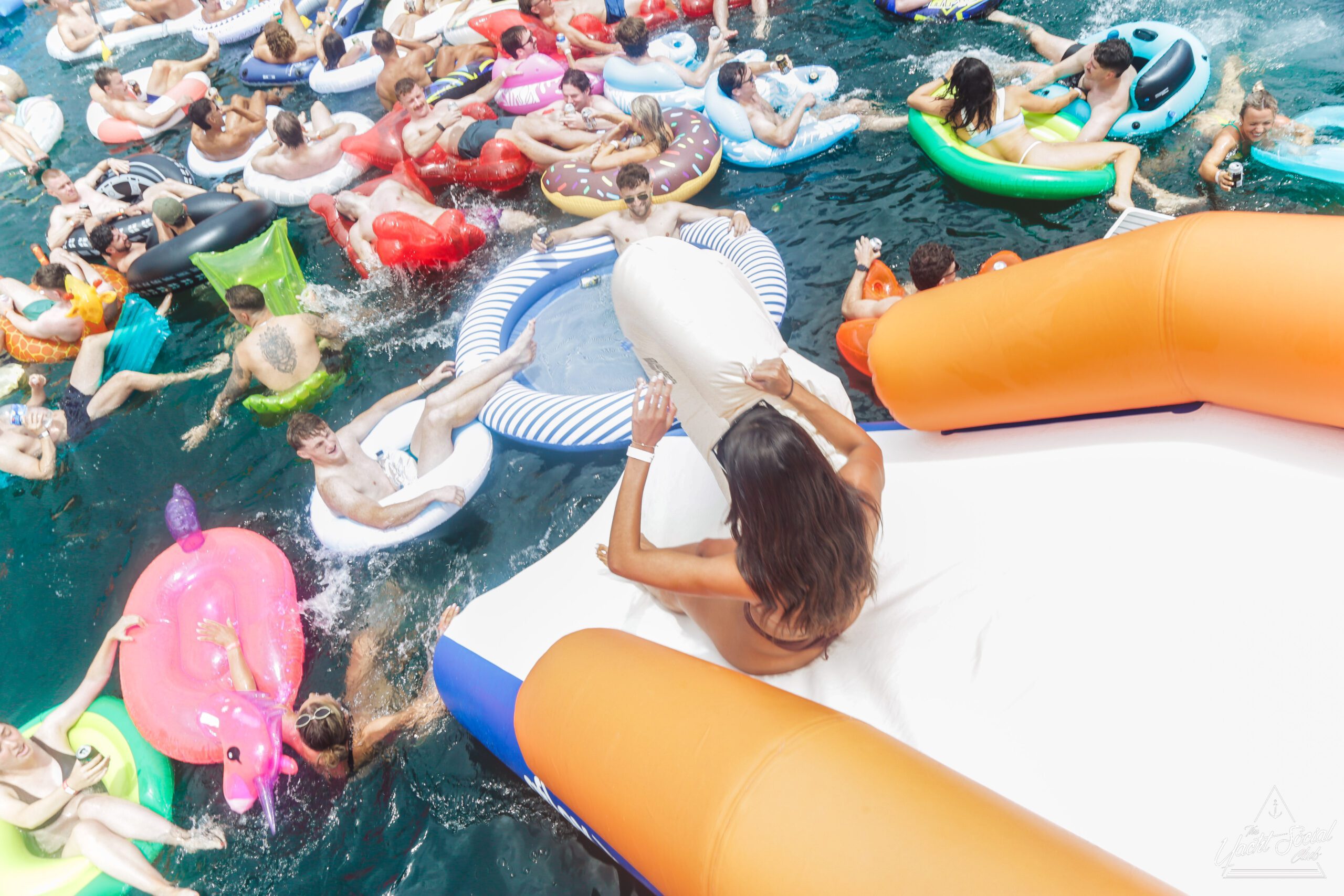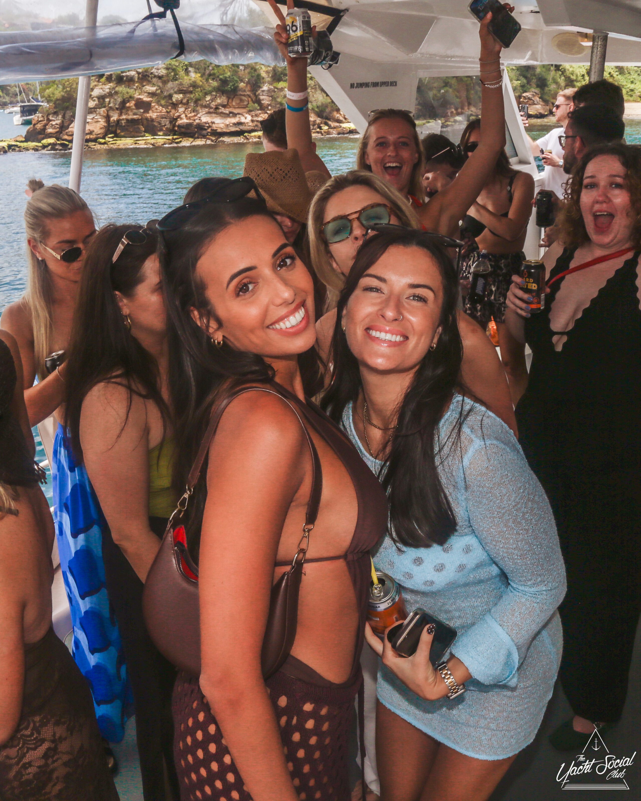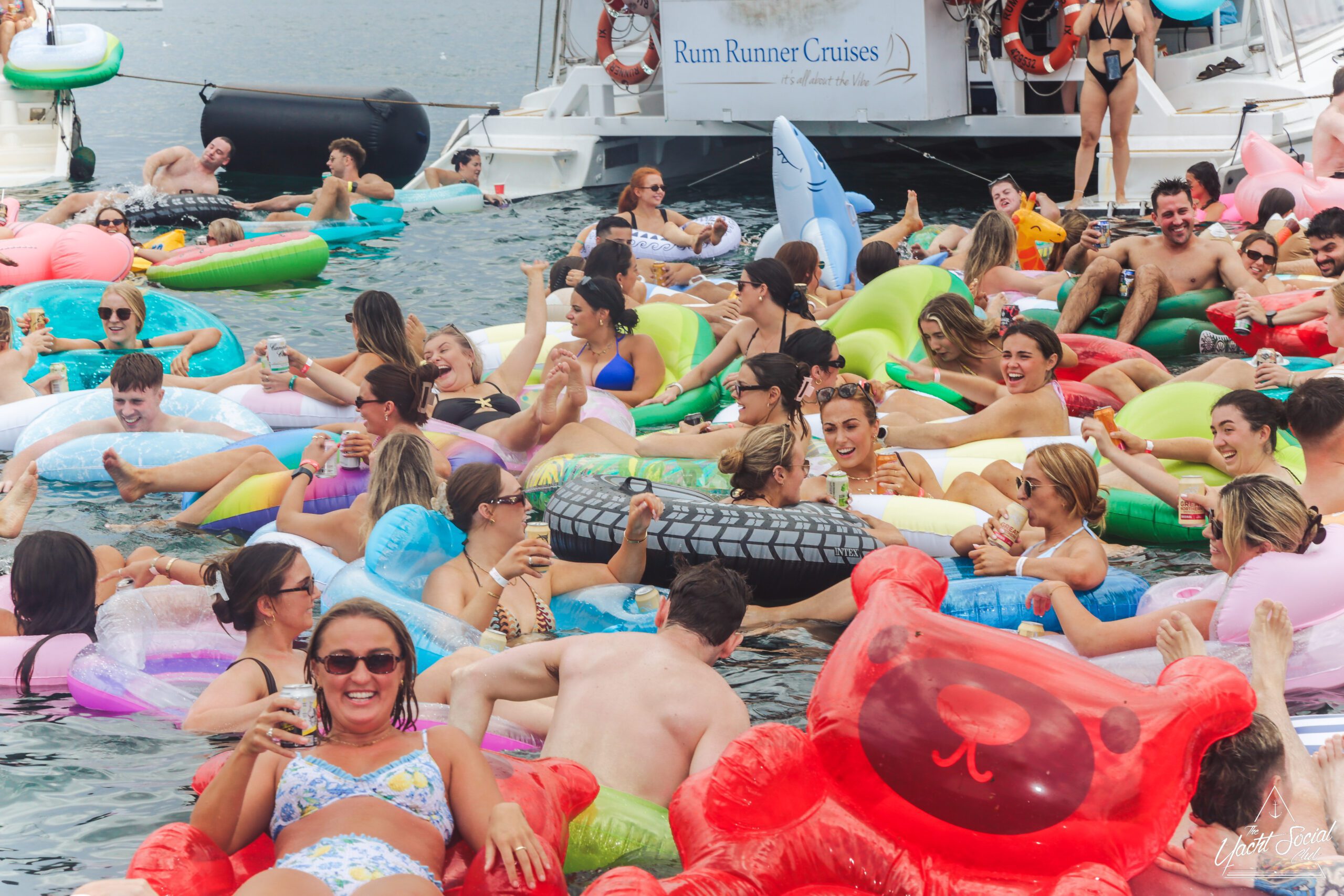 Two women in swimsuits smile and pose on a crowded boat party, surrounded by colorful inflatables and people enjoying the water and festive atmosphere, with boats and a cloudy sky in the background.