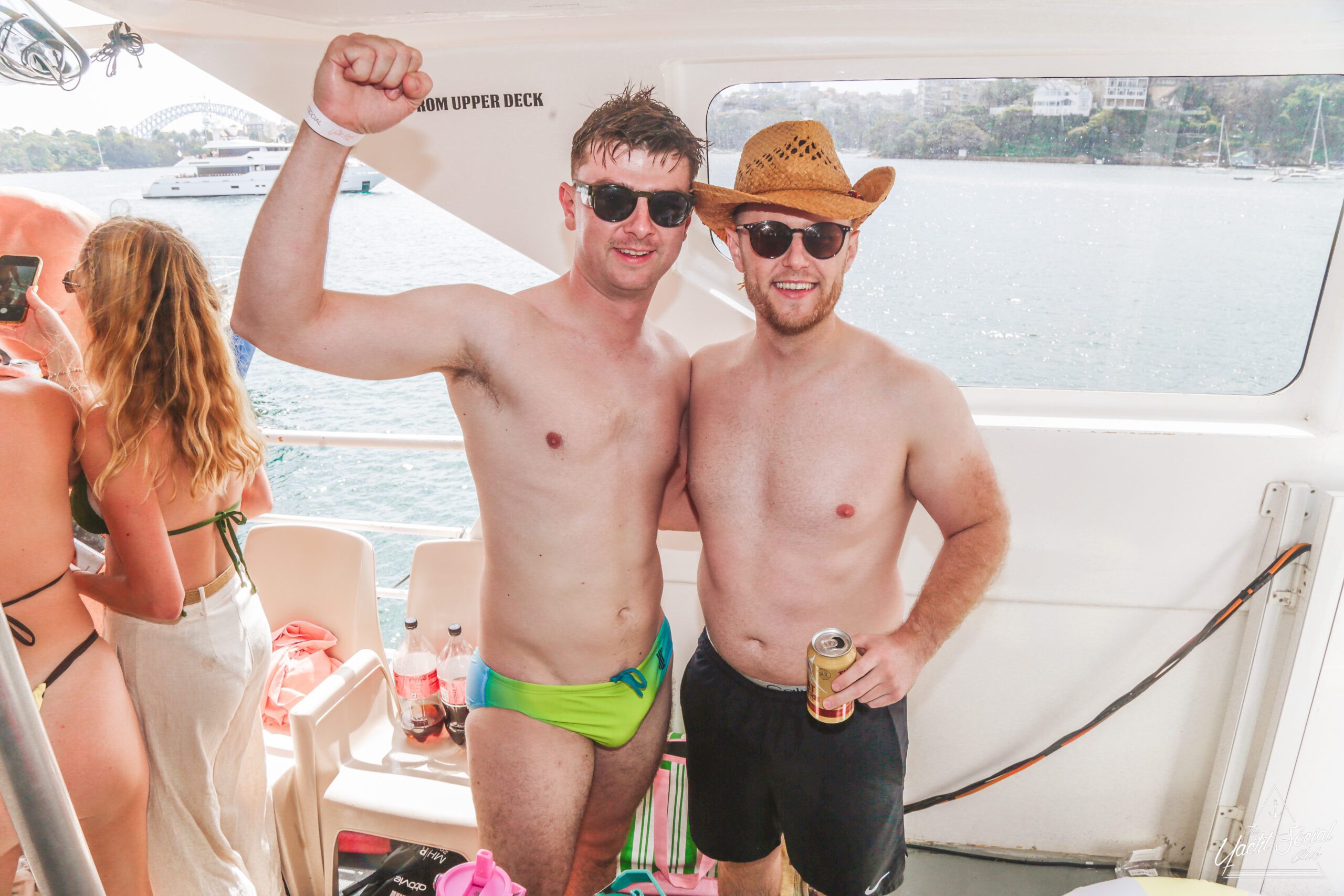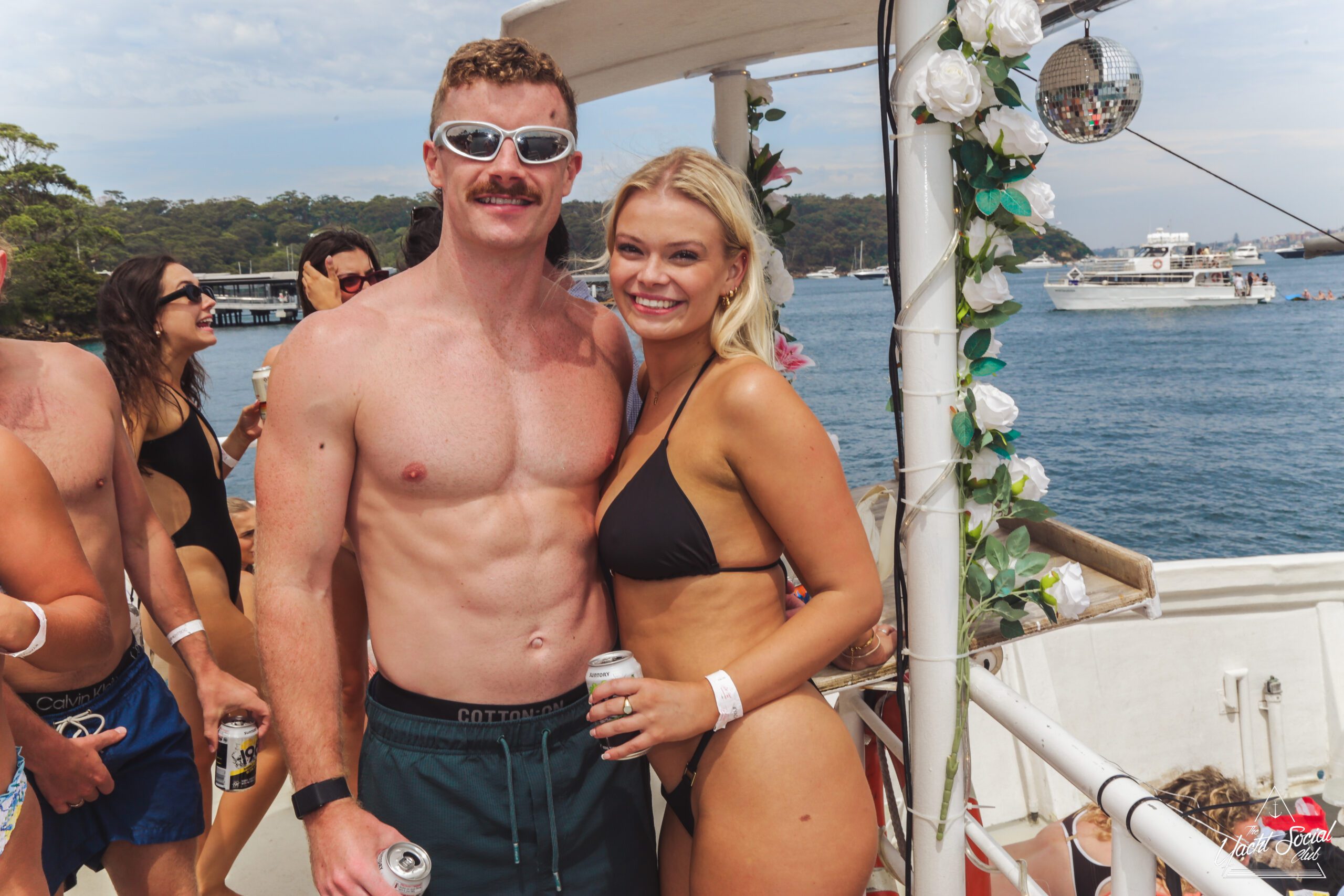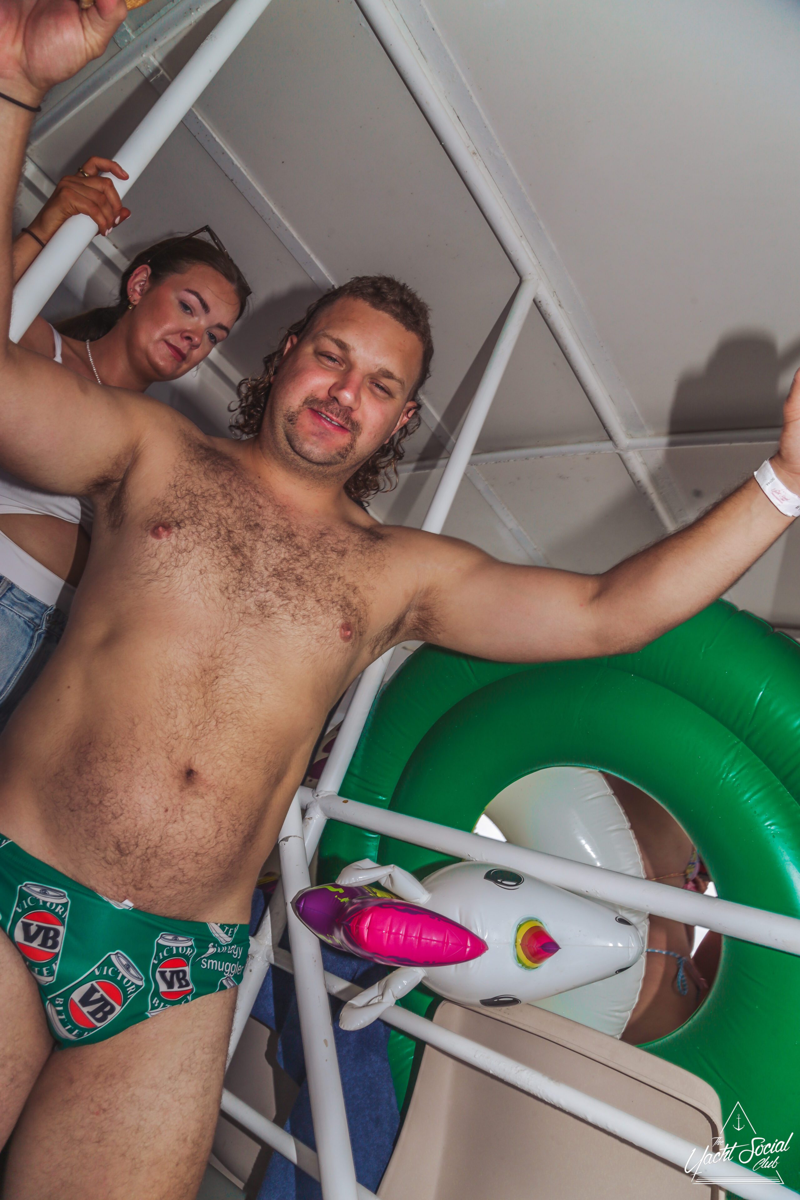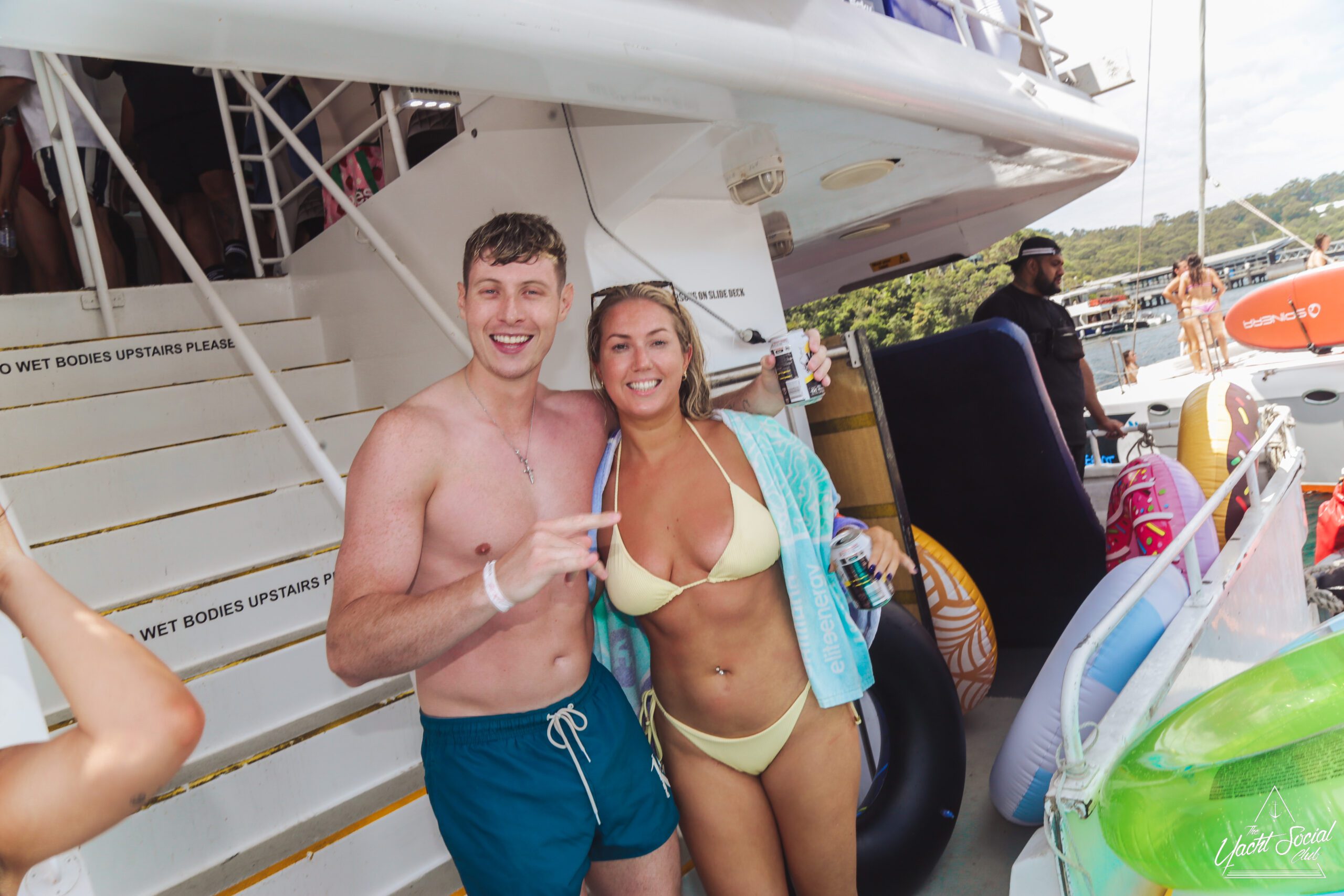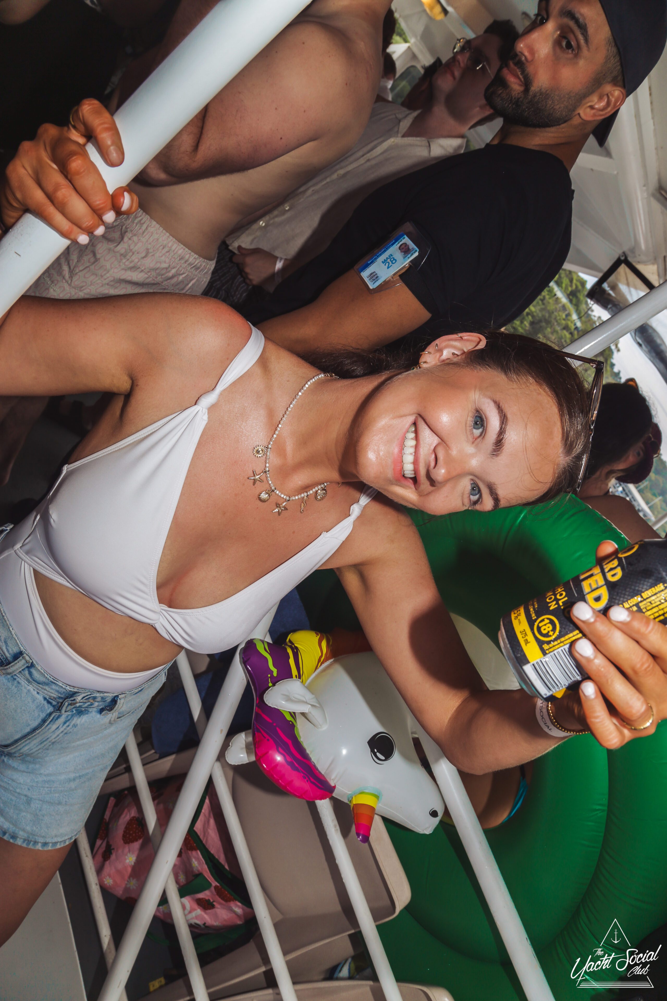Two women in swimsuits smile and pose on a crowded boat party, surrounded by colorful inflatables and people enjoying the water and festive atmosphere, with boats and a cloudy sky in the background.