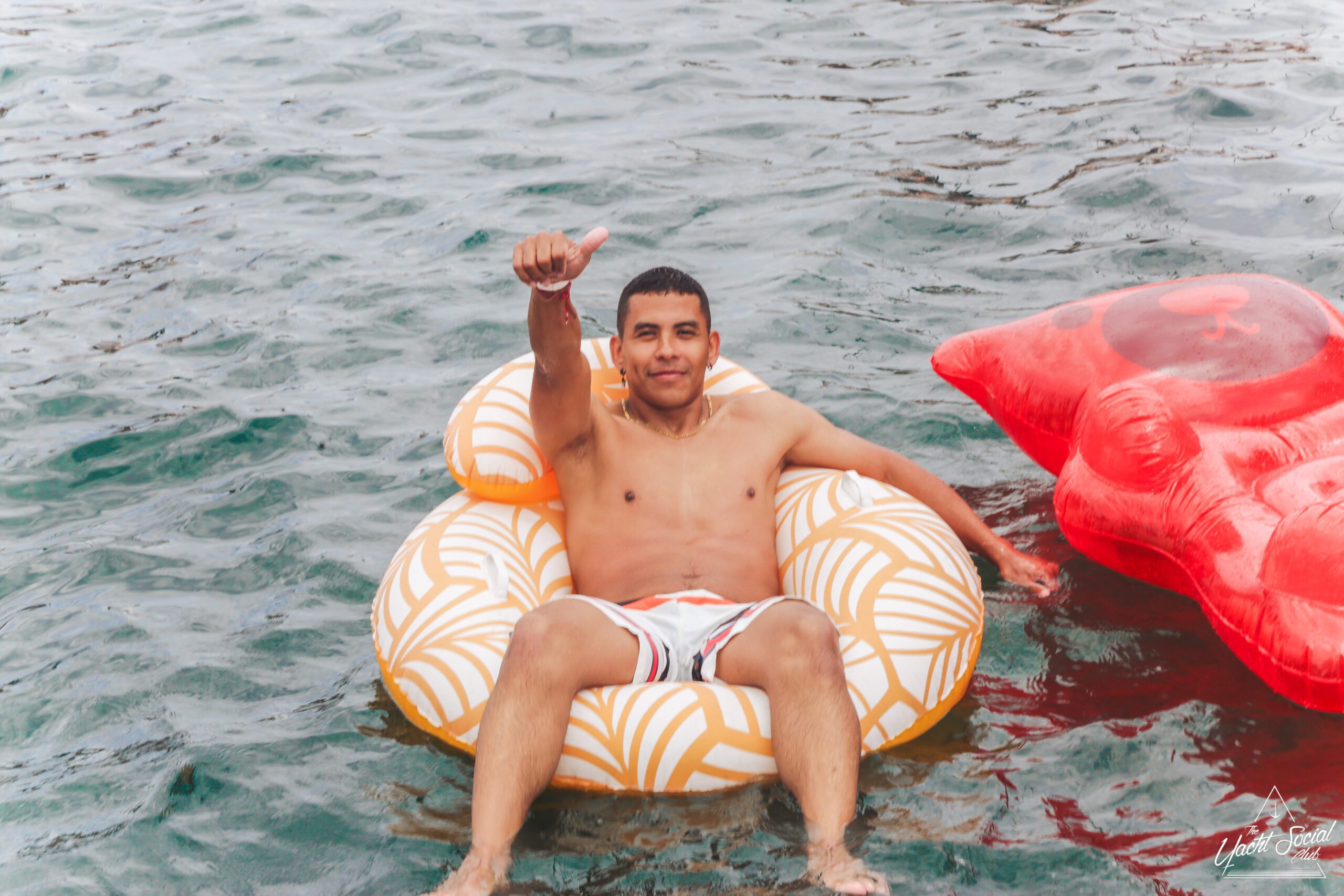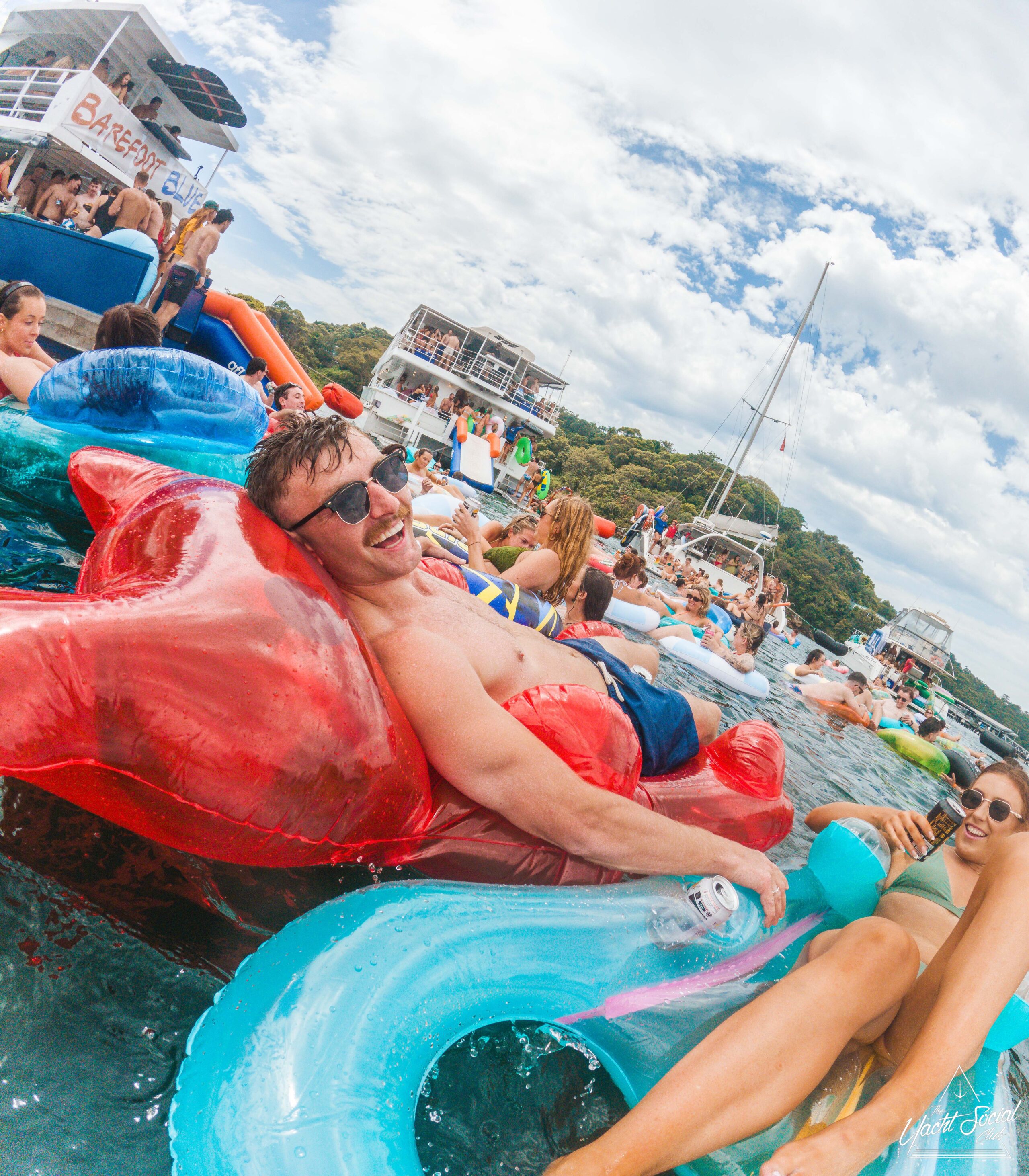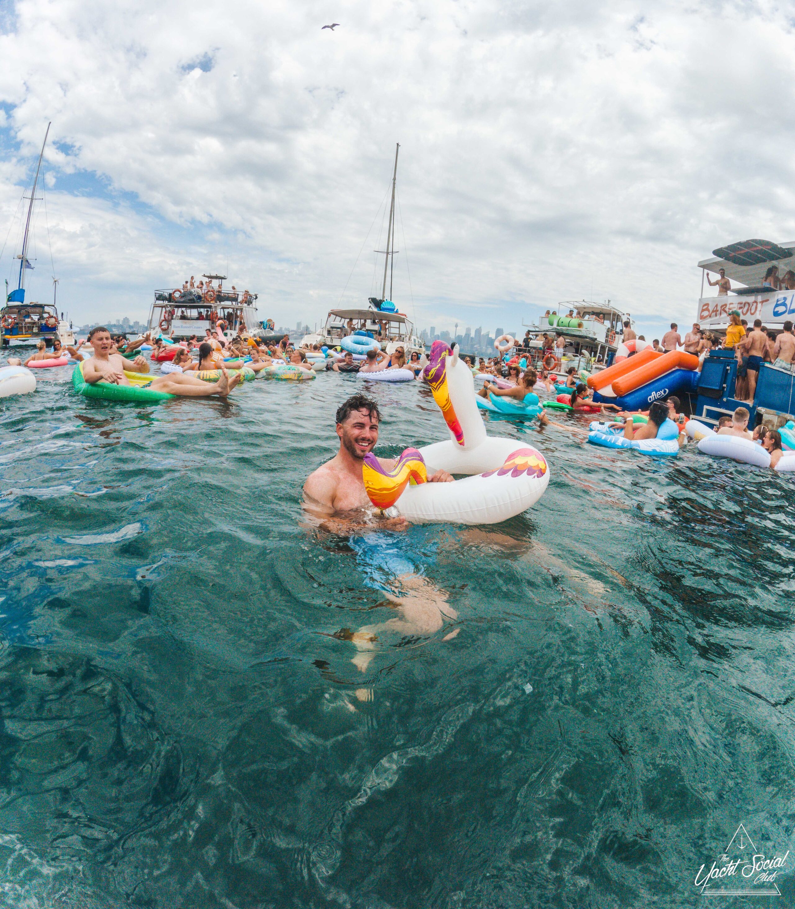A man in sunglasses lounges on a red inflatable in the water, smiling at the camera. Around him are other people on colorful floaties, boats, and a party atmosphere under a partly cloudy sky.