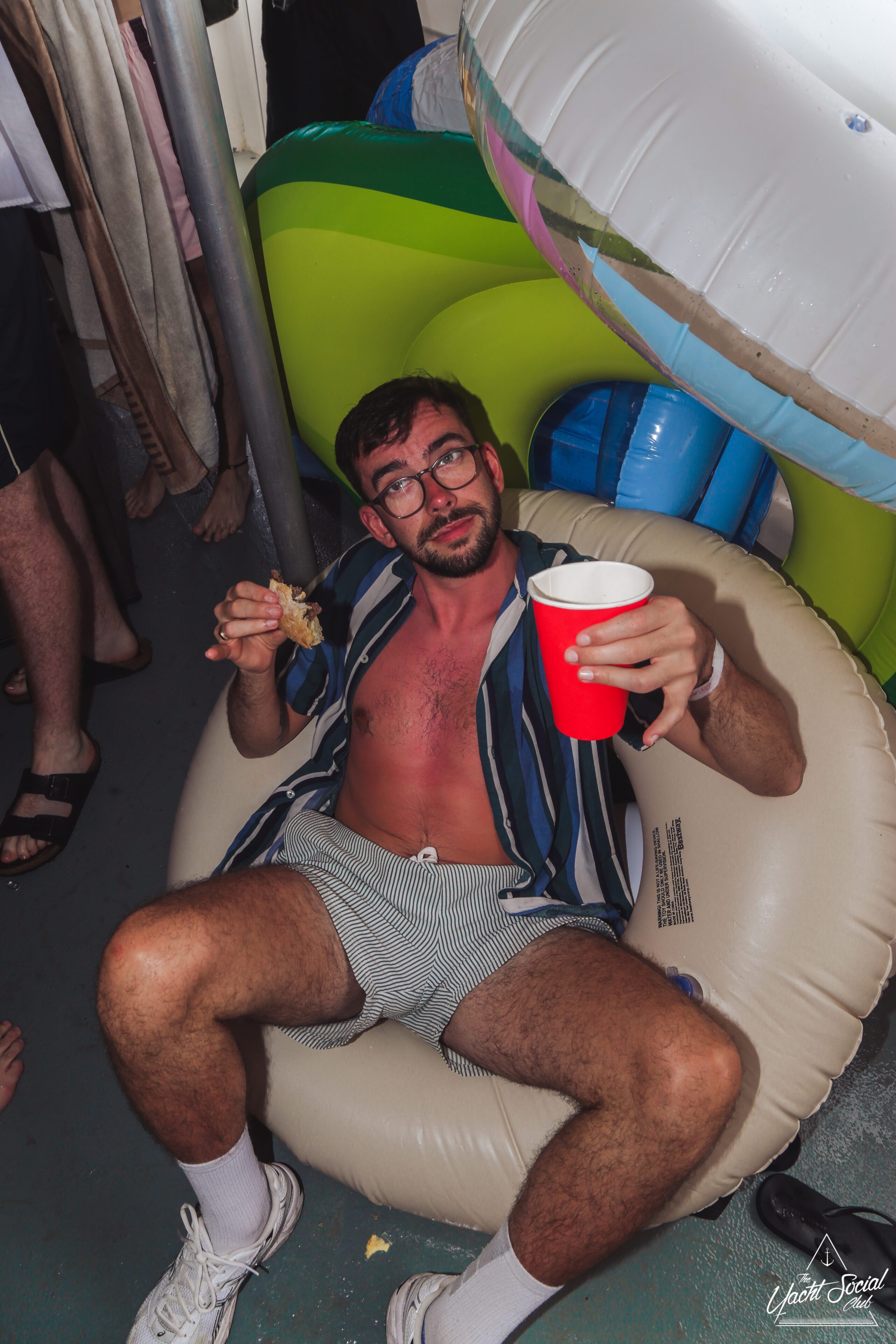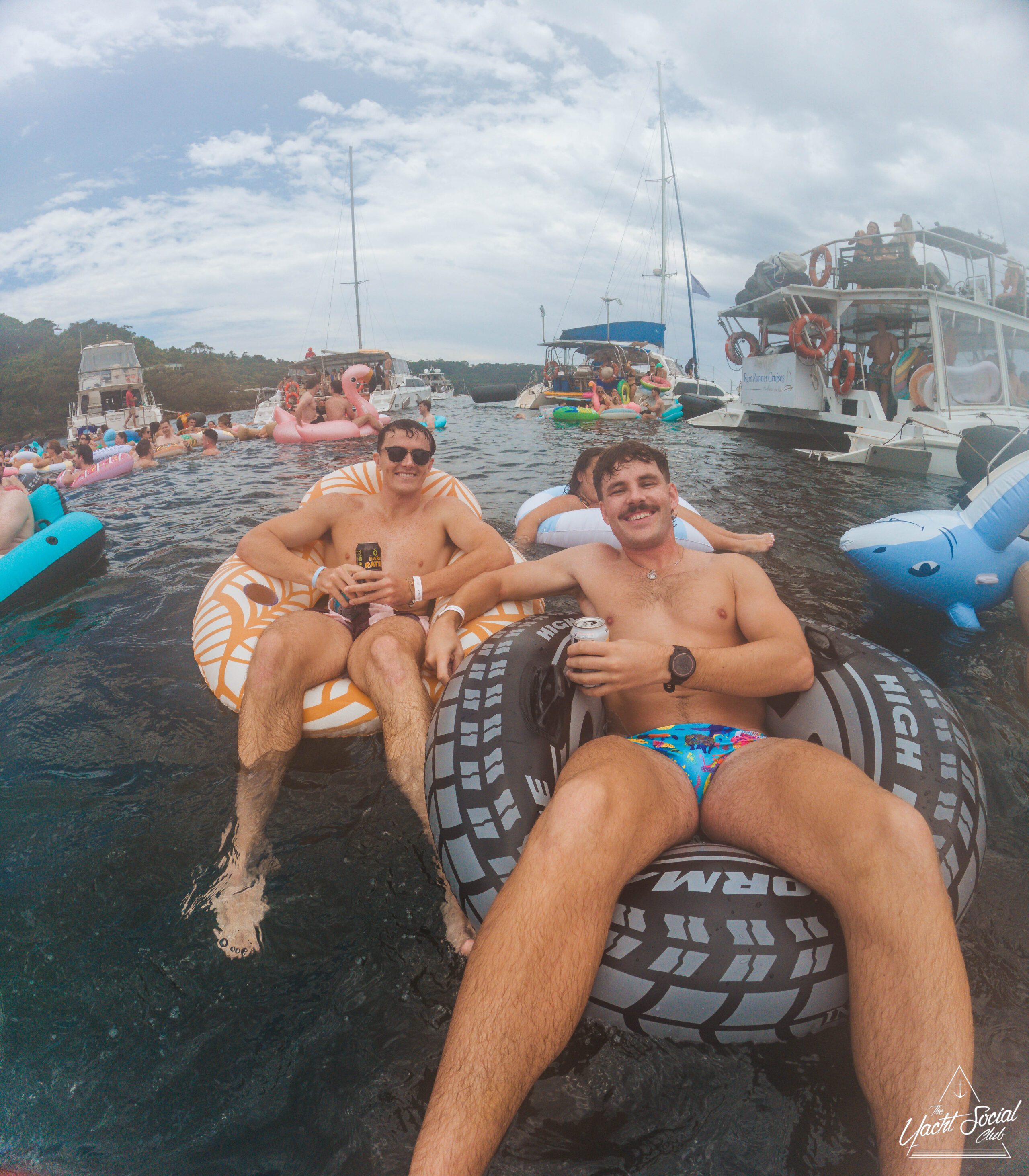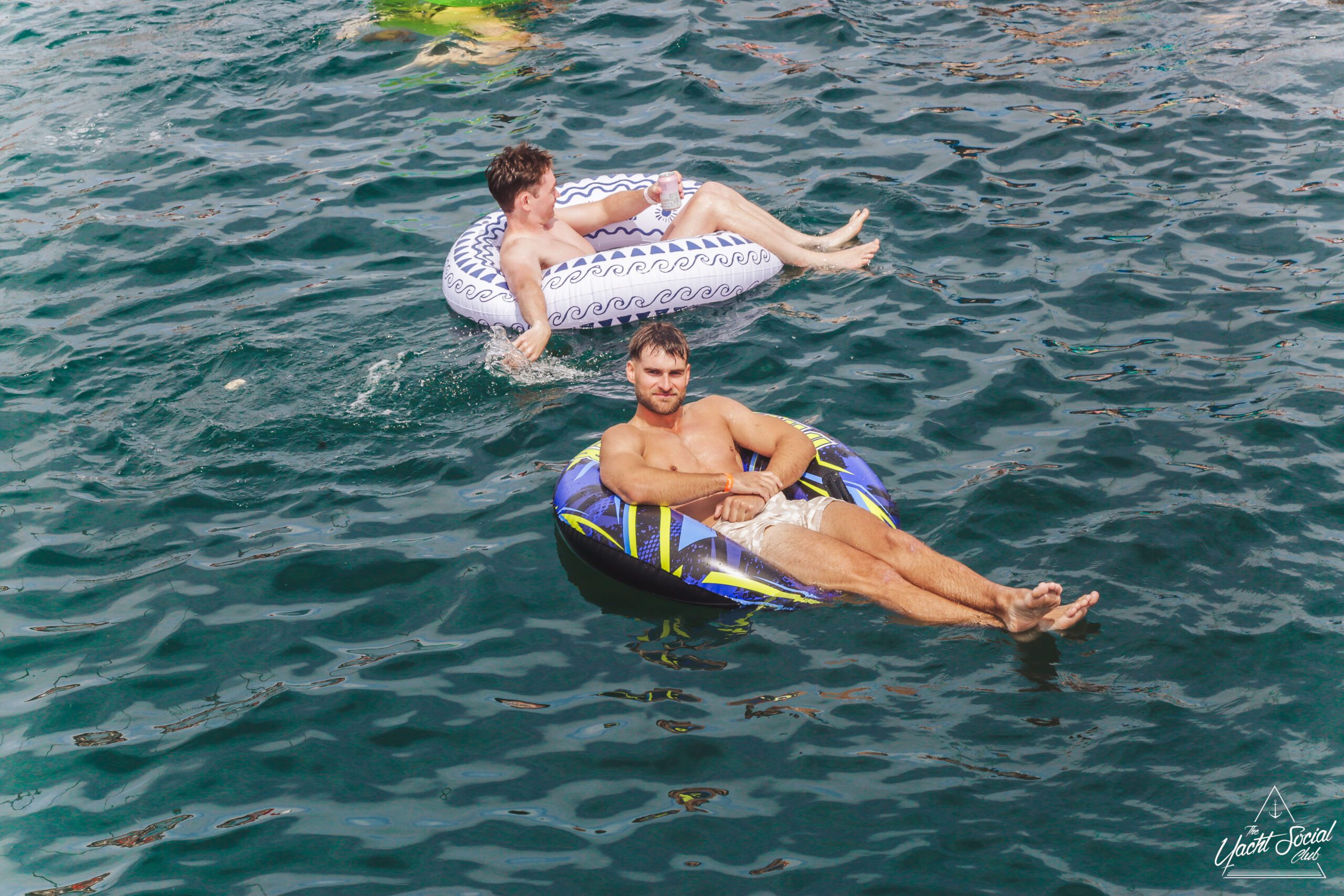A man in sunglasses lounges on a red inflatable in the water, smiling at the camera. Around him are other people on colorful floaties, boats, and a party atmosphere under a partly cloudy sky.