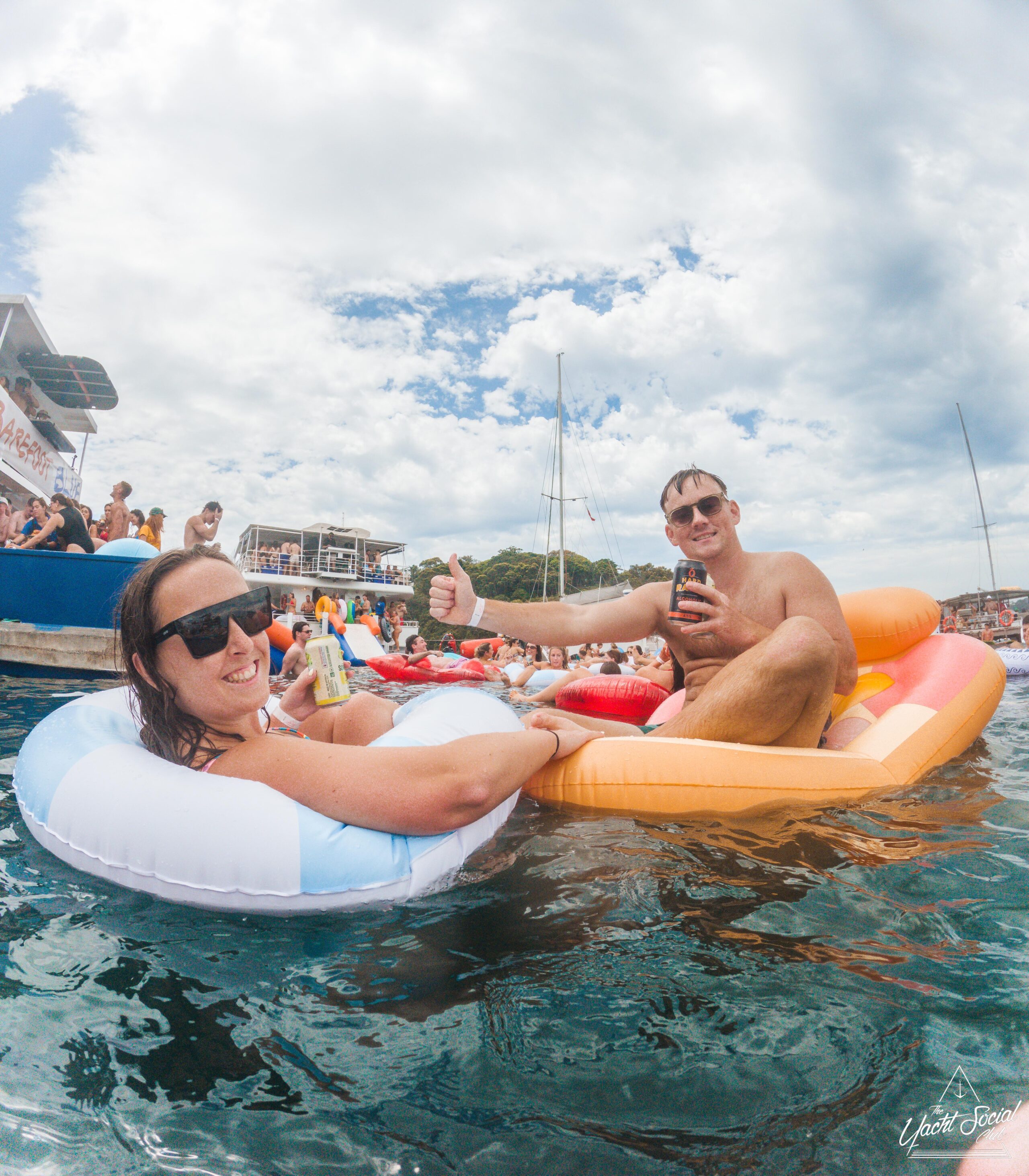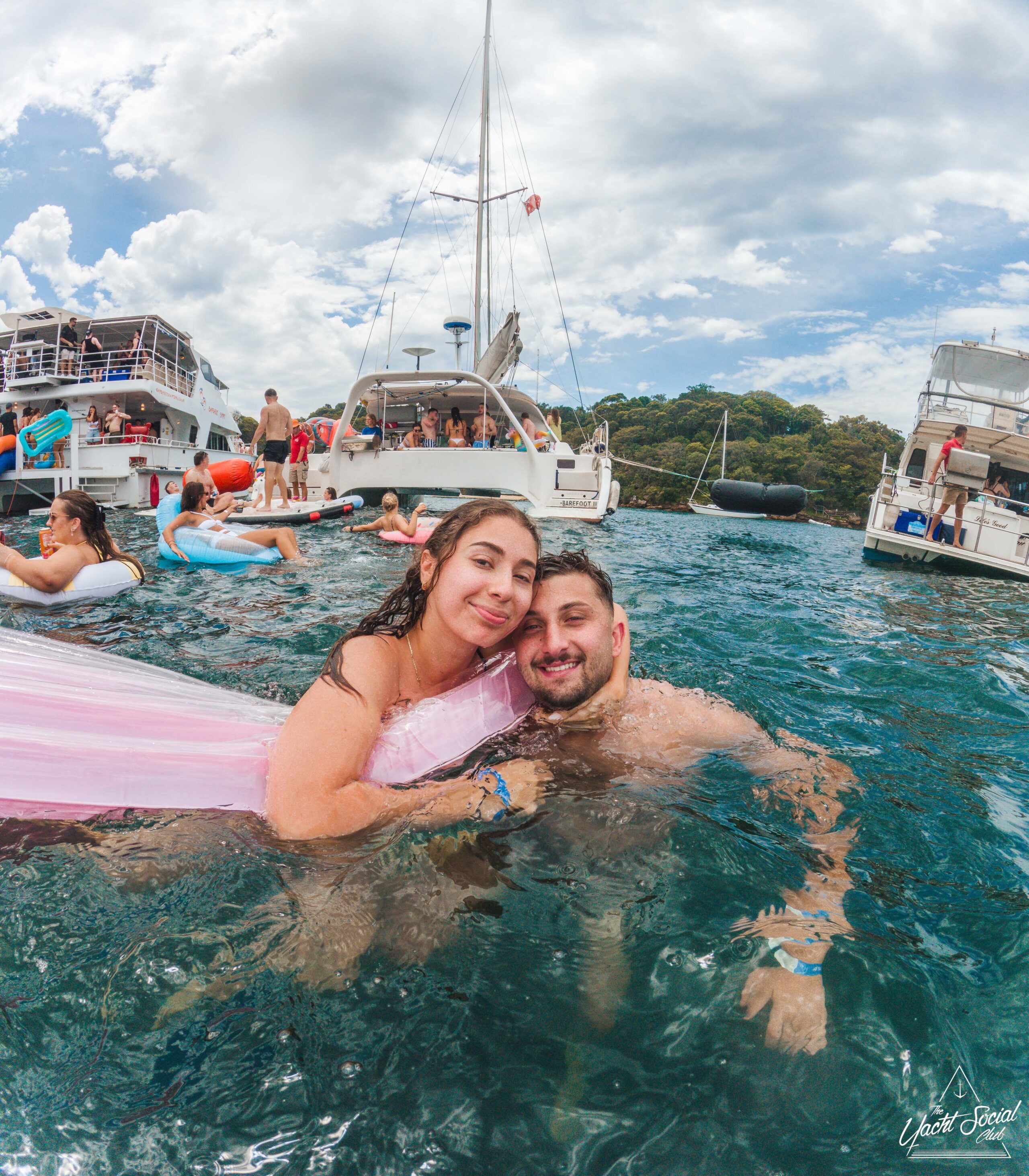 A couple smiles while relaxing on a pink float in the ocean, surrounded by other people swimming and lounging near anchored yachts on a partly cloudy day.