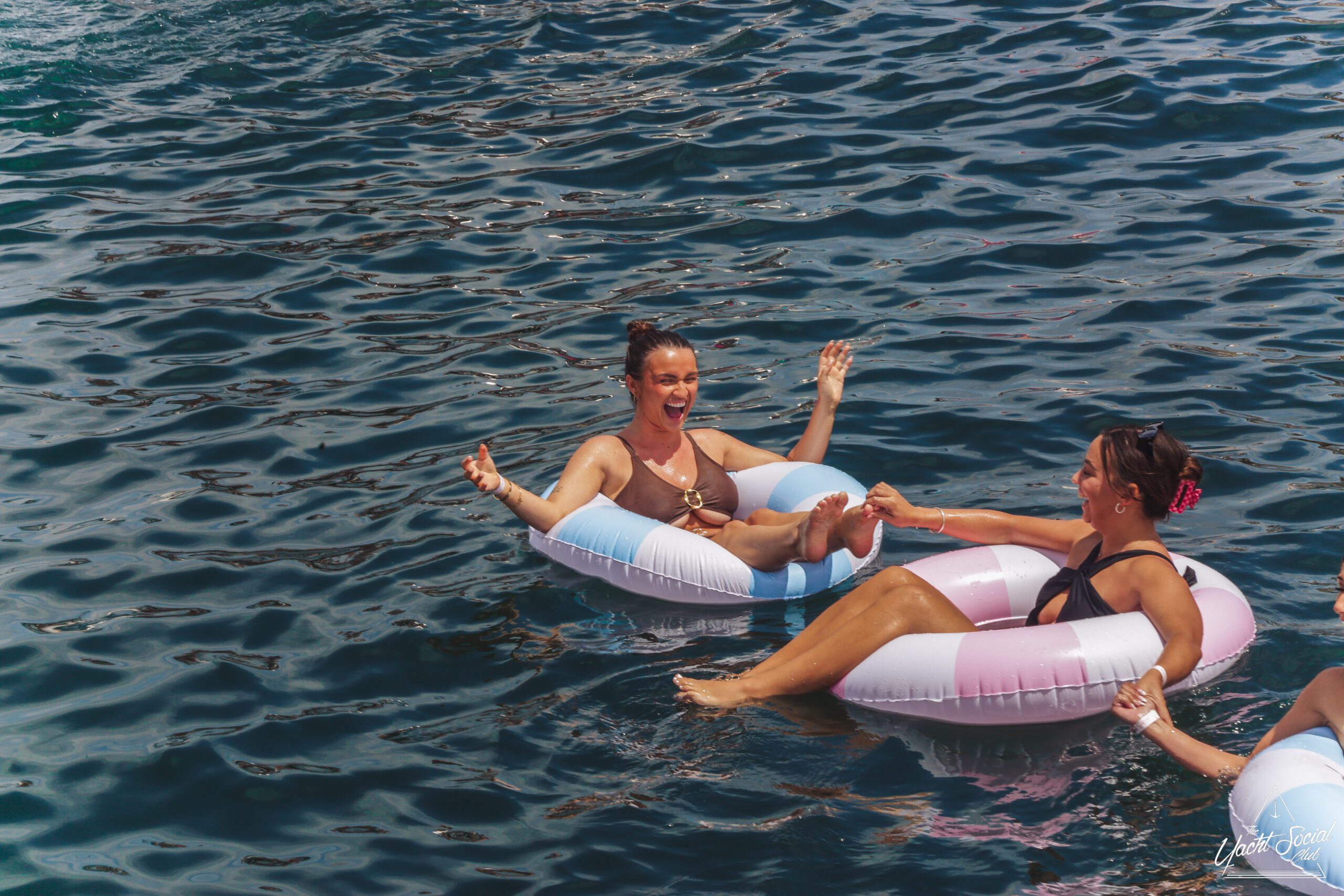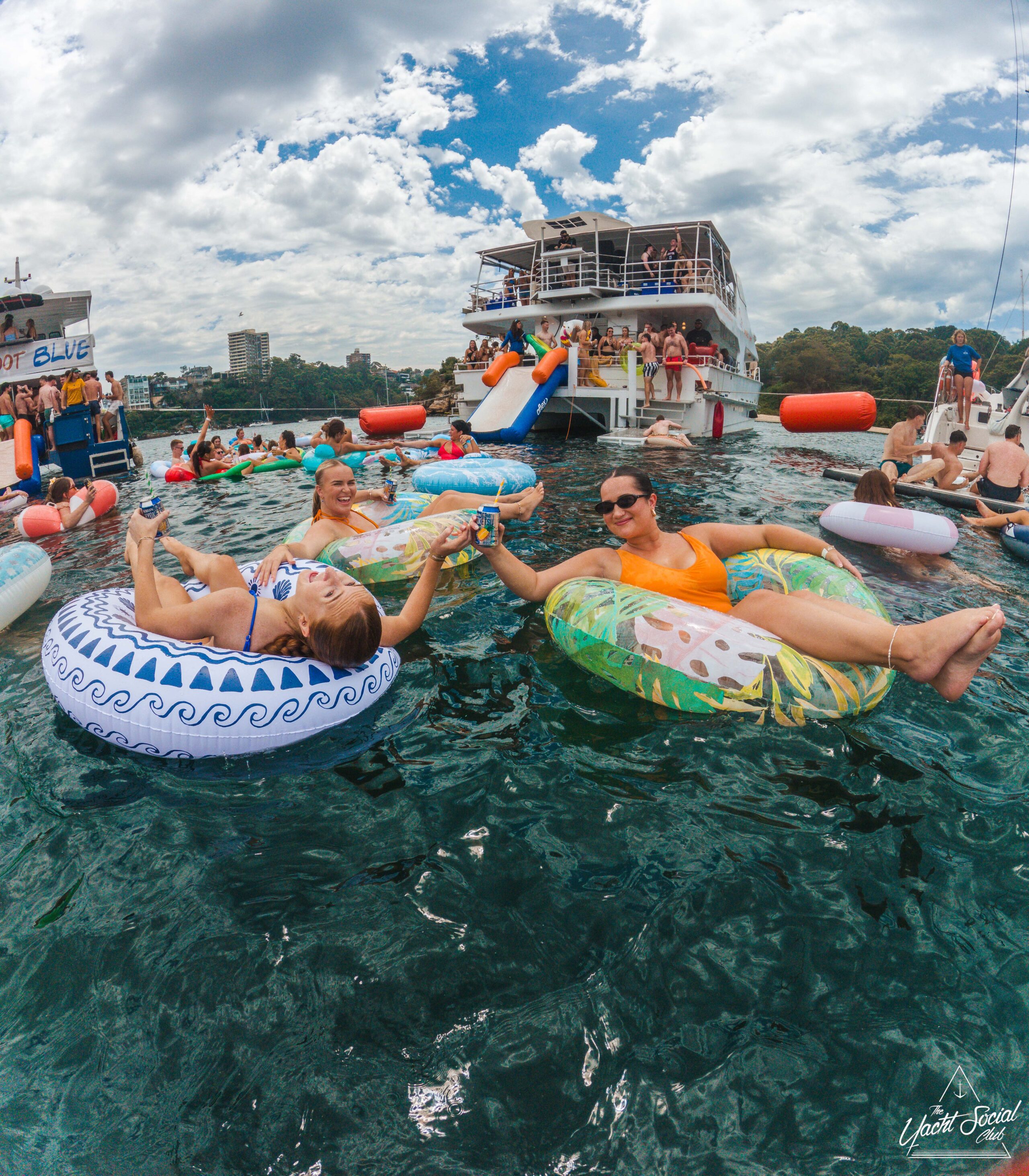 Two women in colorful inflatable tubes relax on the water, clinking drinks, surrounded by others enjoying a lively party near a large boat under a partly cloudy sky.