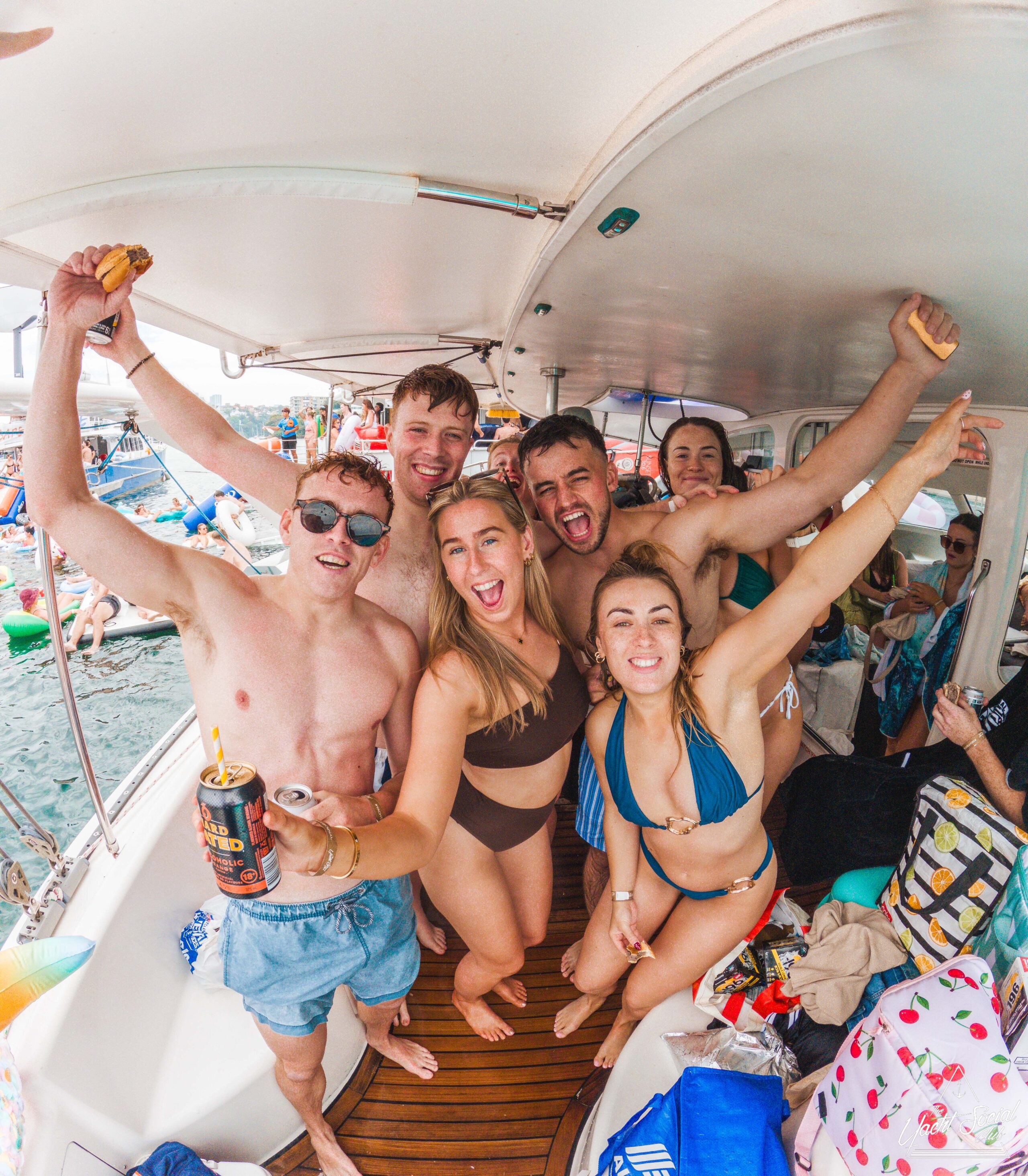 Six smiling people in swimsuits stand on a boat, raising their arms and drinks in celebration. The water and a city skyline are visible in the background under a partly cloudy sky.