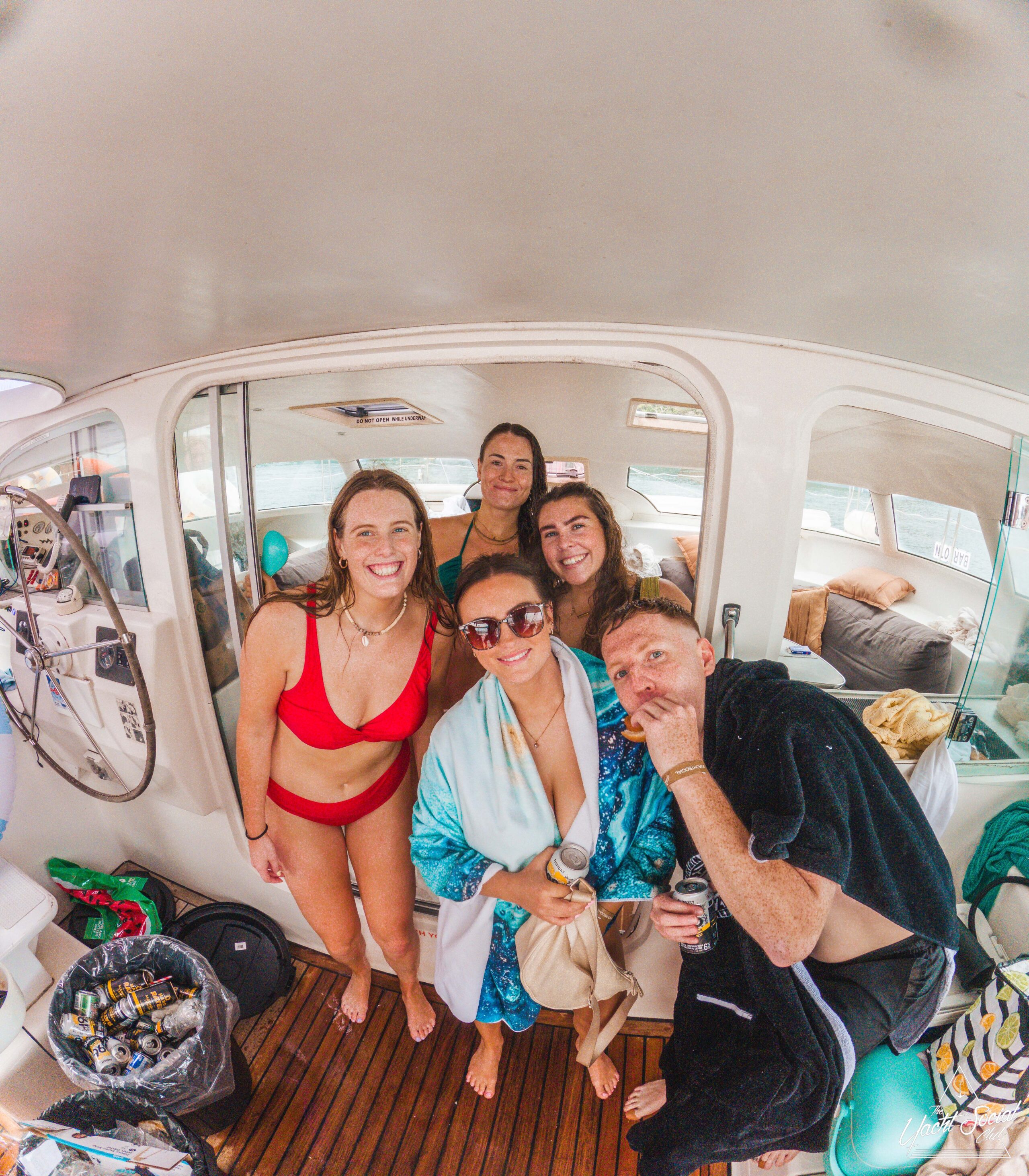 Five people in swimwear and towels stand smiling together on a boat, appearing happy and relaxed. The boat's interior, some seats, and scattered cans are visible in the background.