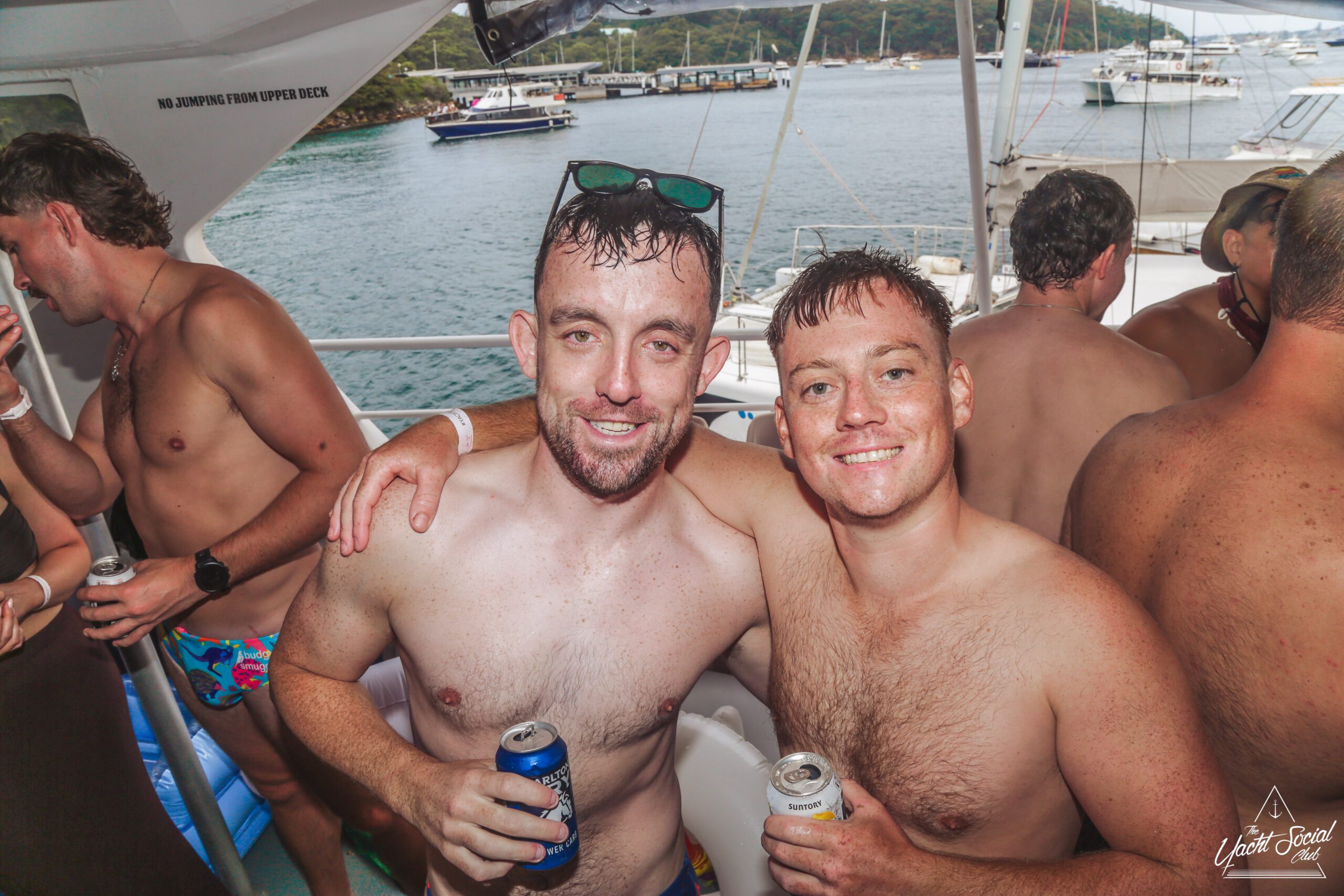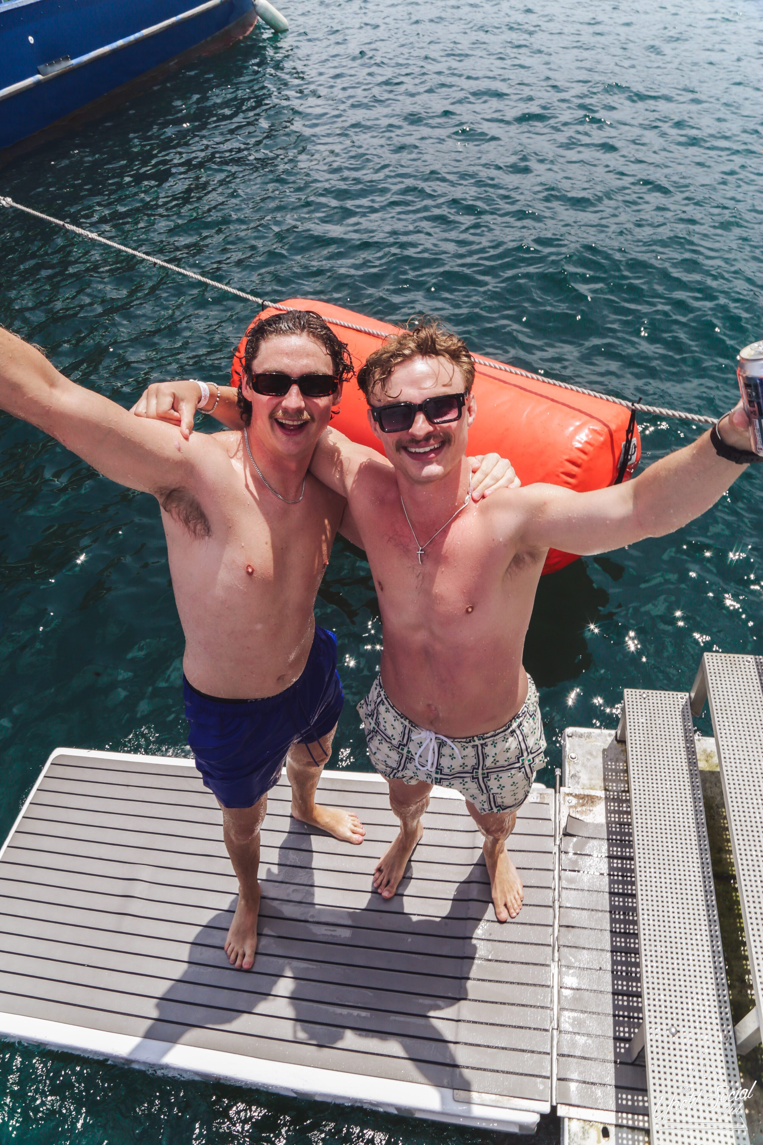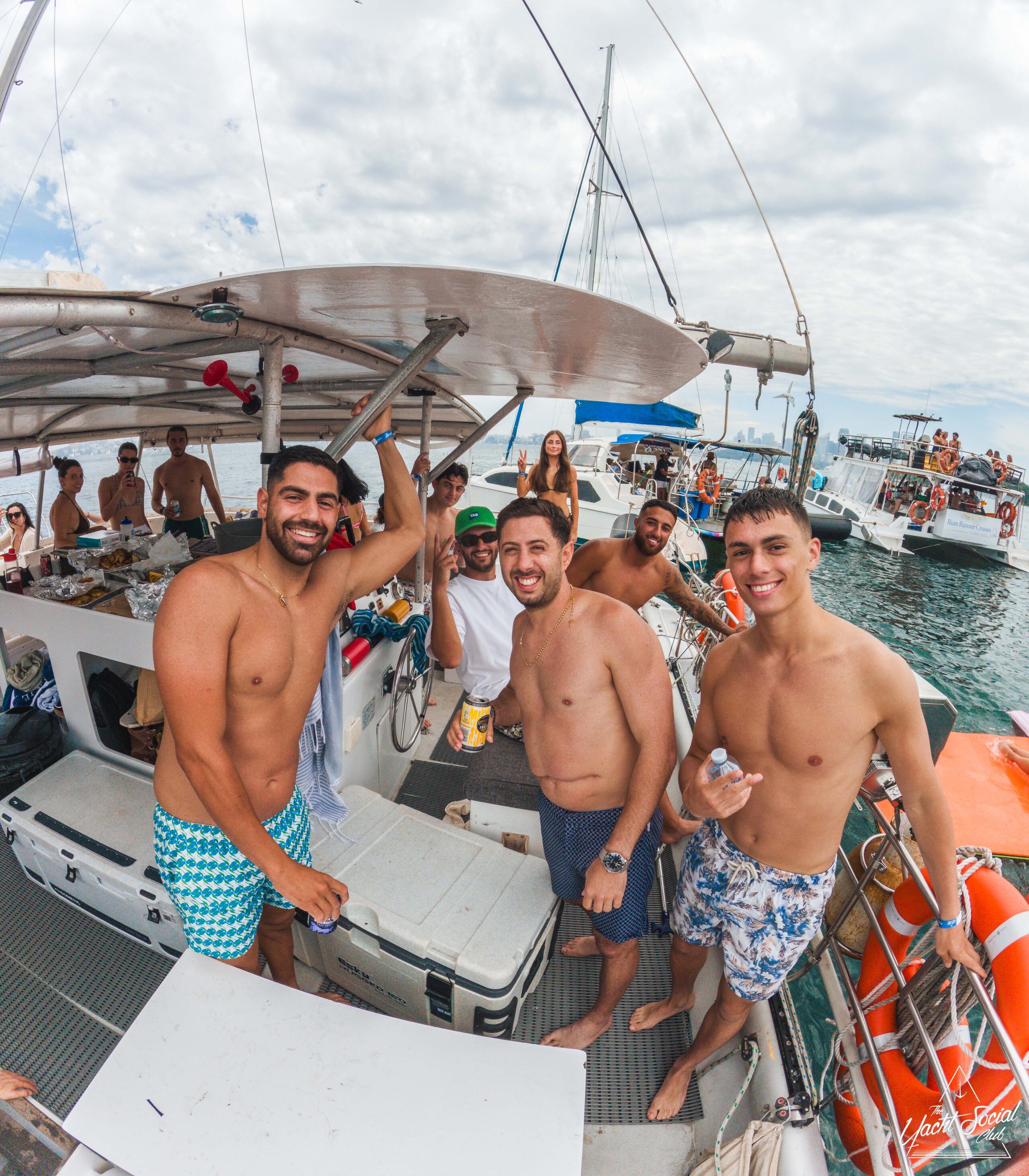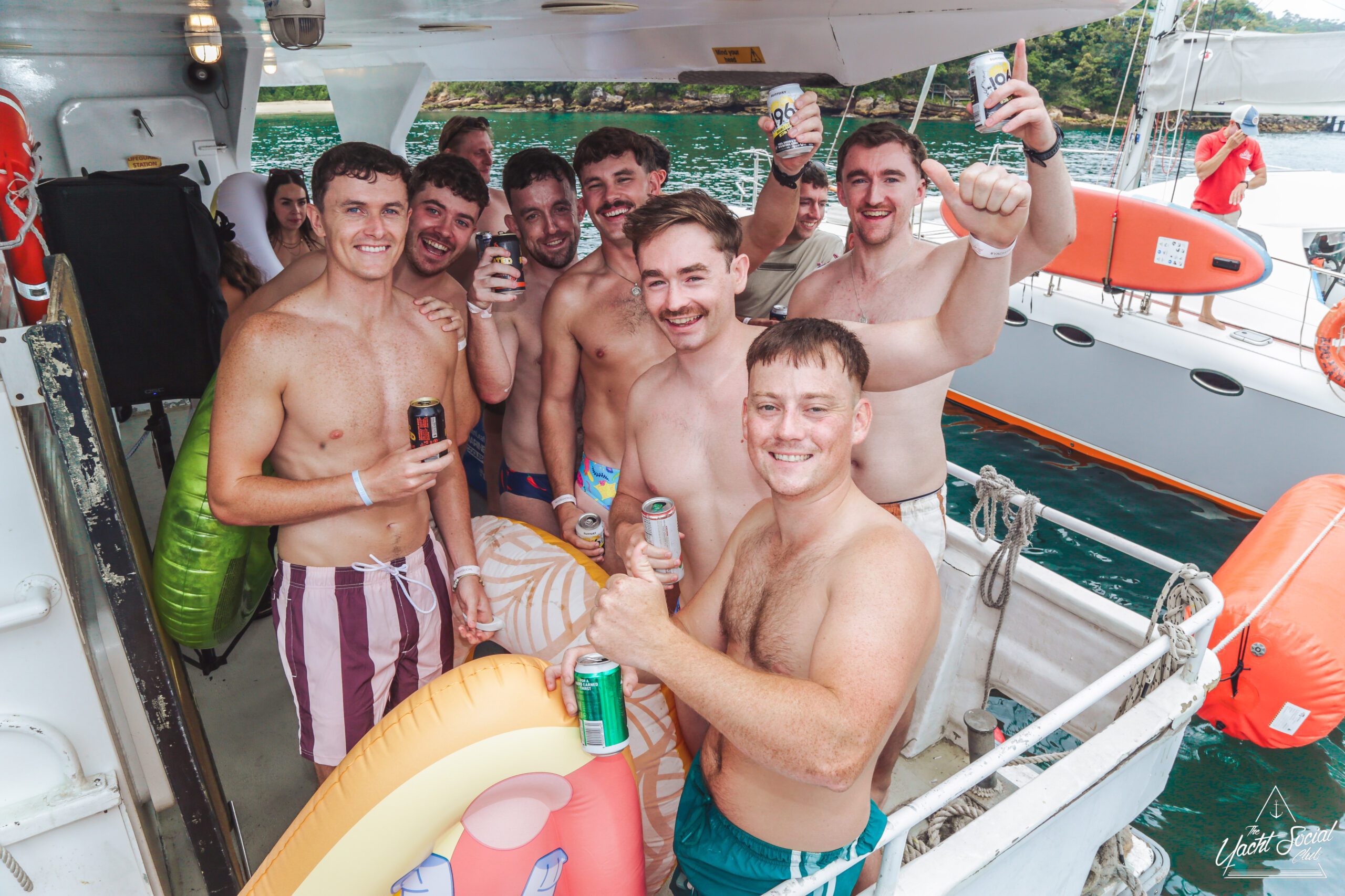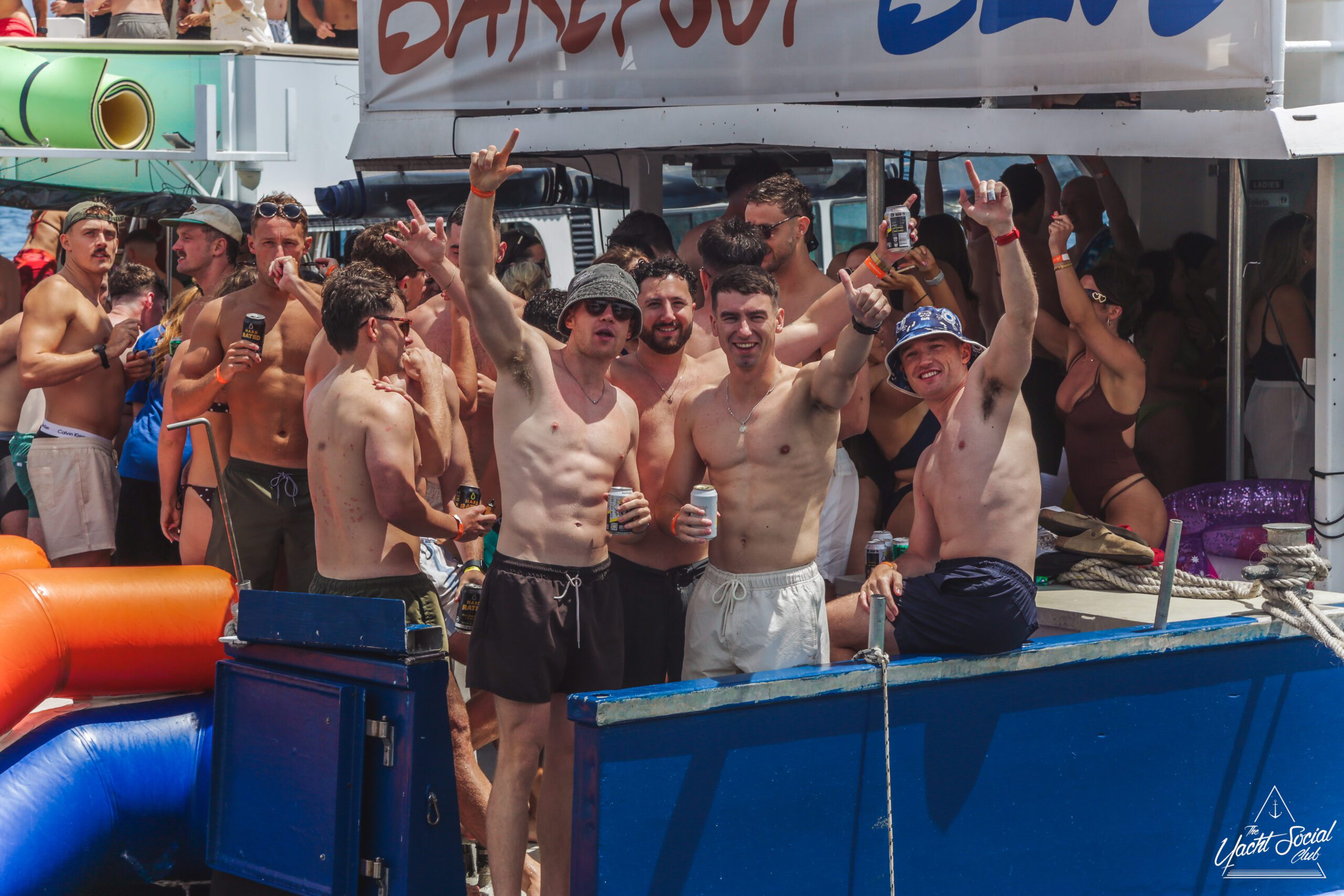 A group of smiling shirtless men holding drinks and inflatables pose together on a boat, with water and another boat visible in the background. The atmosphere appears relaxed and festive.
