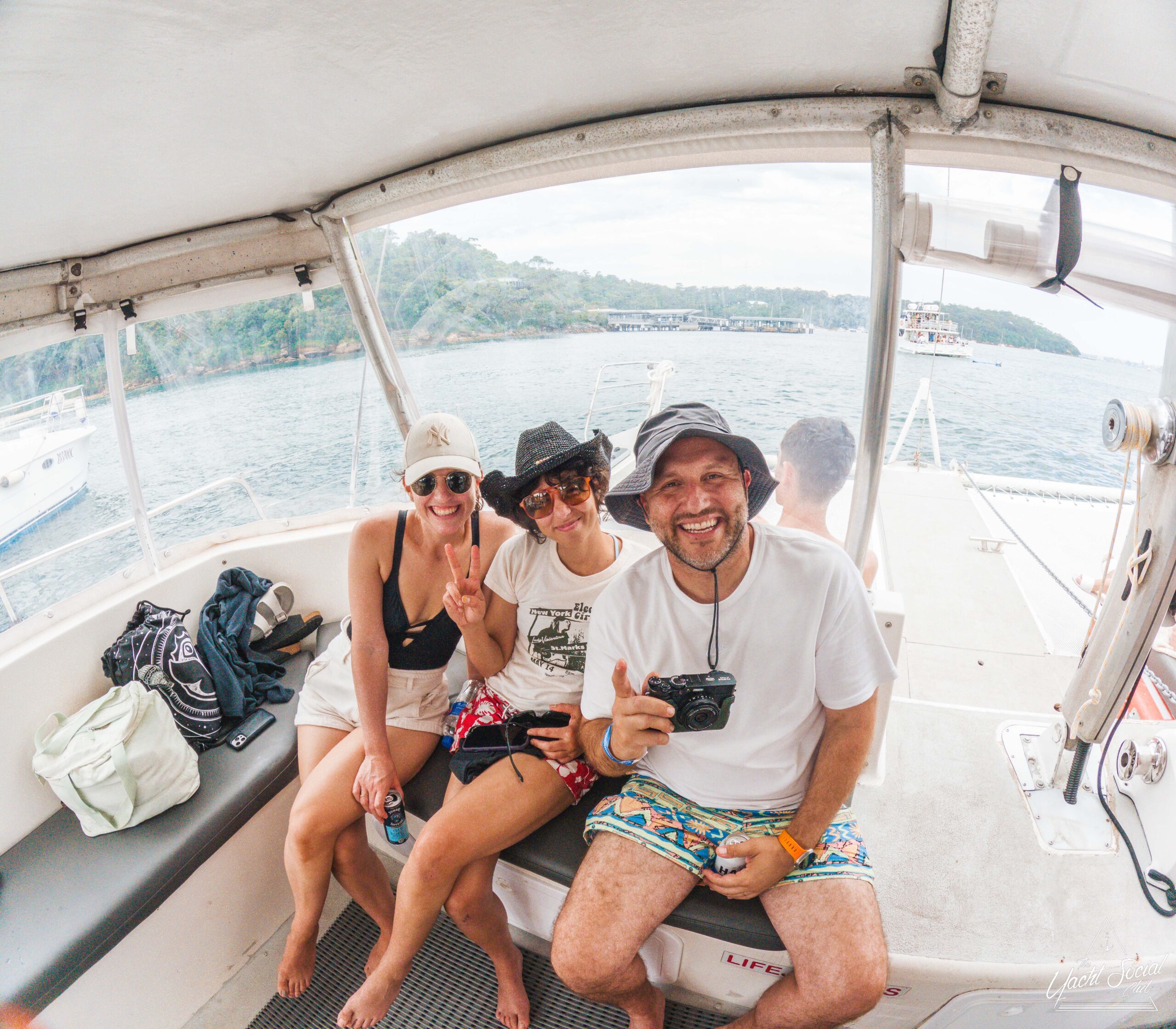 Three smiling people in casual summer clothes and hats sit on a boat, with water and a forested coast visible in the background. One person holds a camera, and another flashes a peace sign.