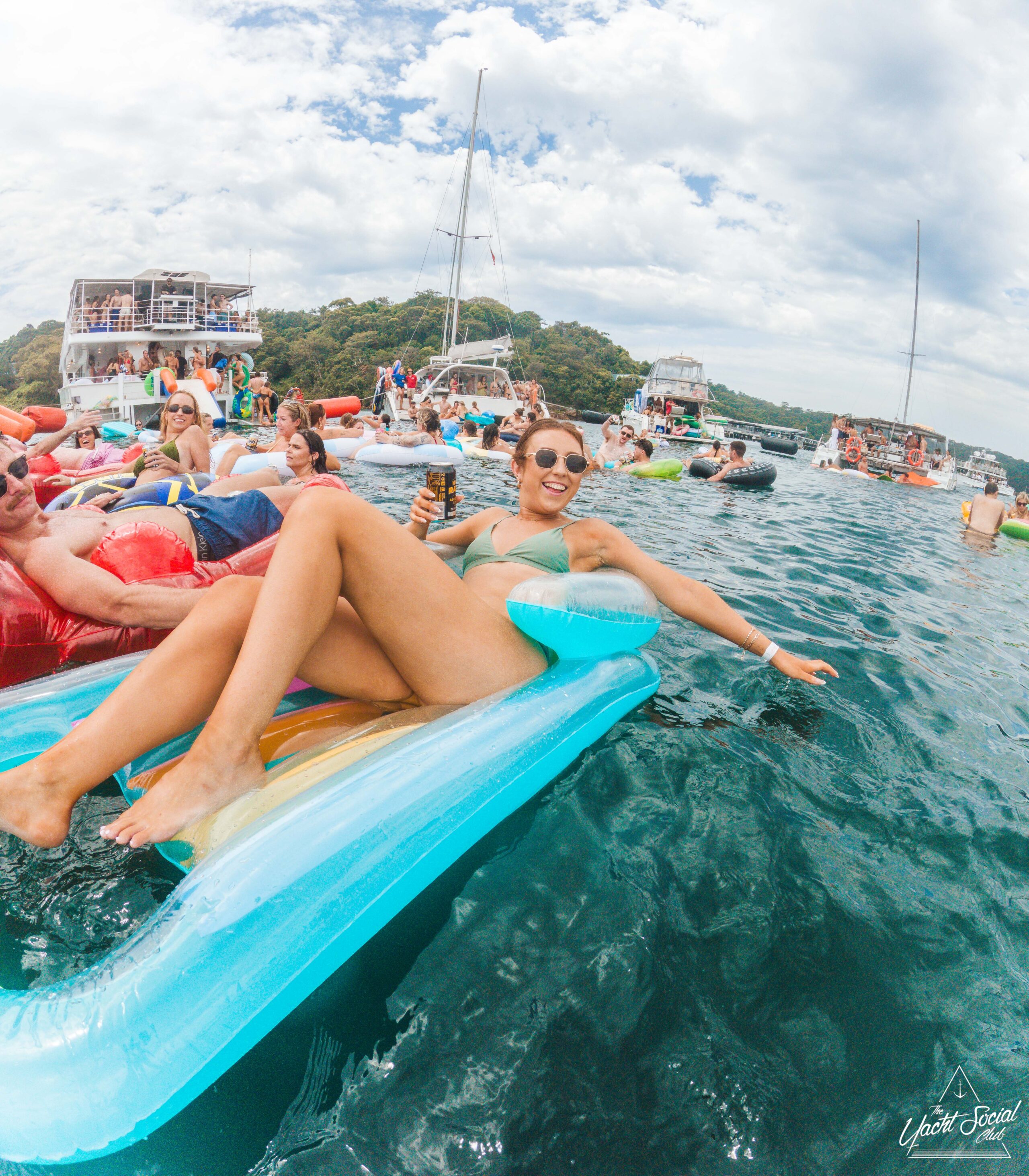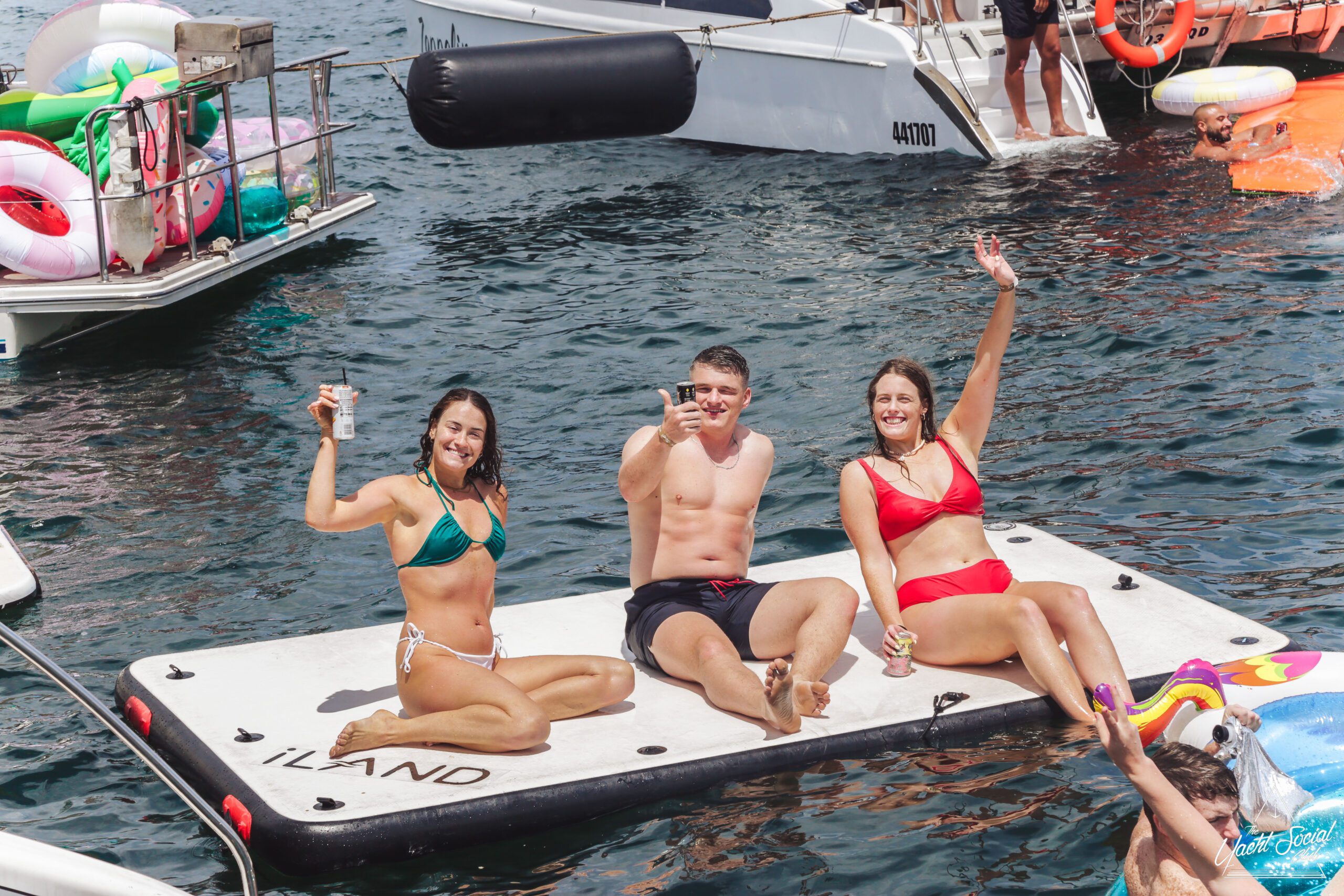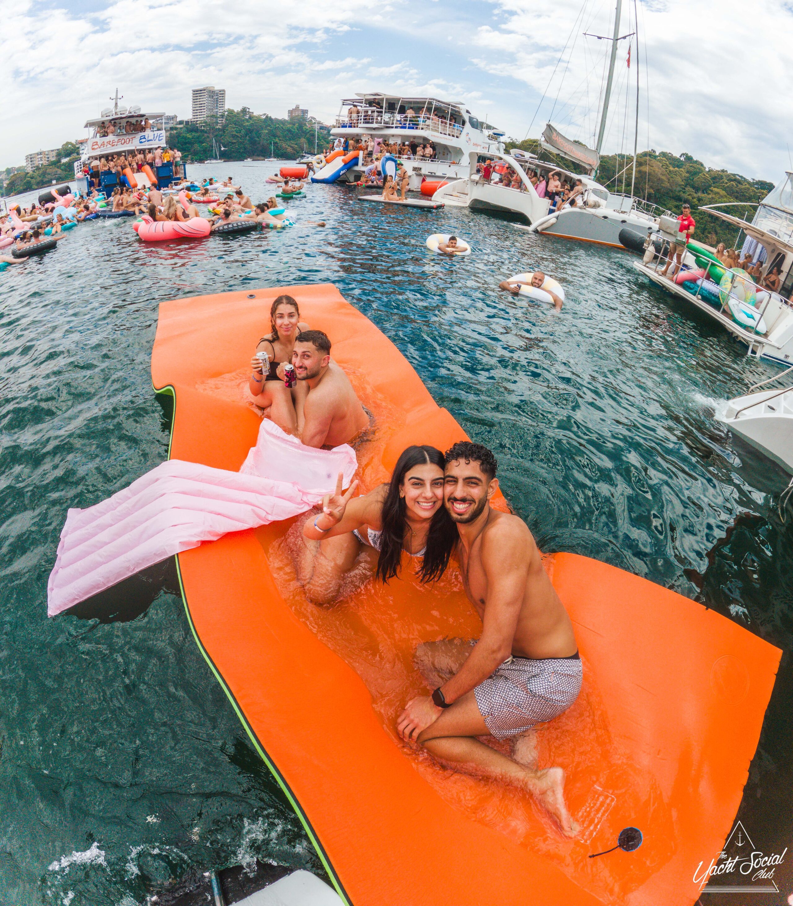 A group of young adults sits and smiles on an orange floating mat in the water, surrounded by boats and people enjoying a lively outdoor party. The sky is partly cloudy and the atmosphere is festive.