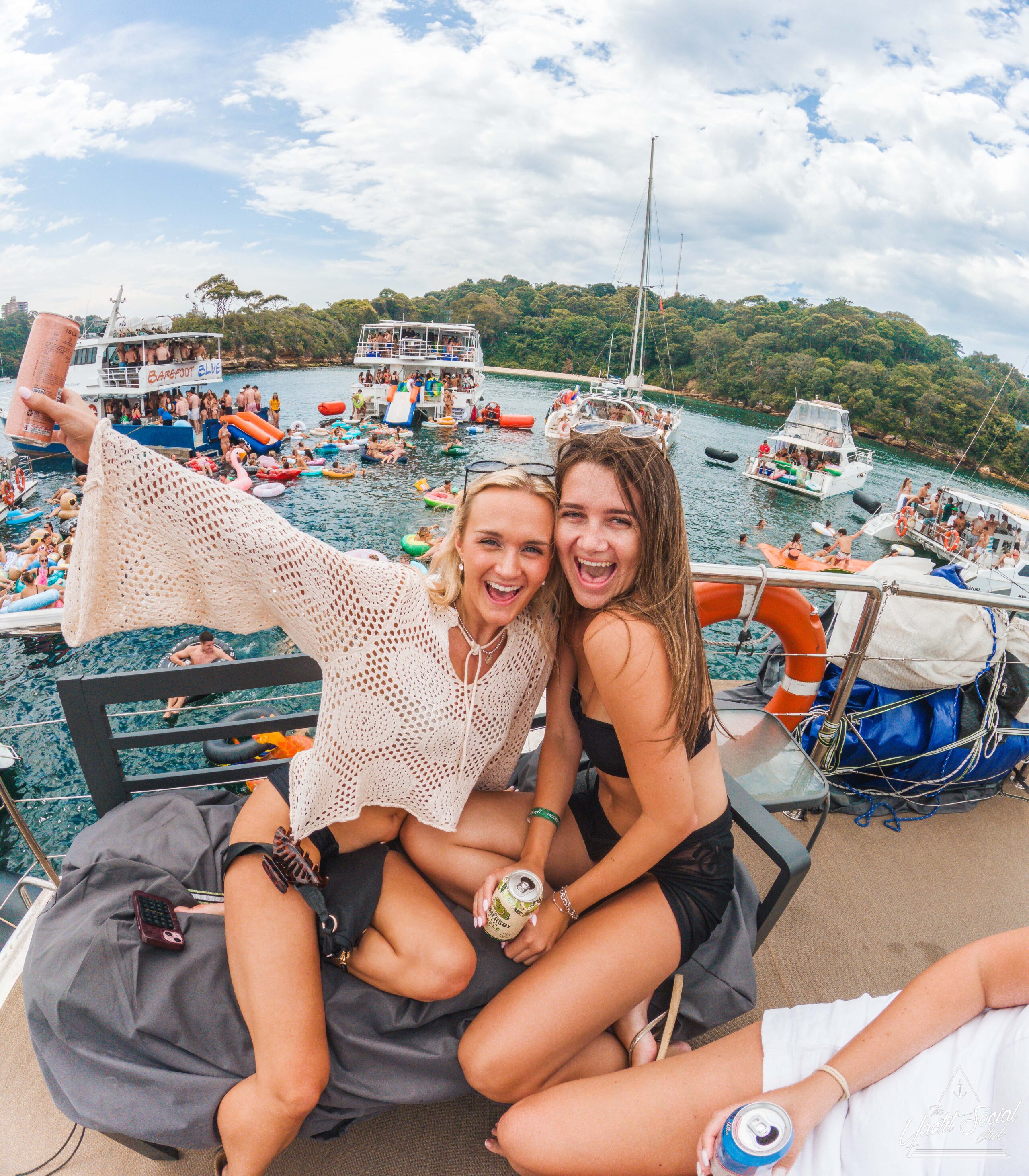 Two young women sit on a boat, smiling and holding drinks, with a lively crowd swimming and relaxing on nearby boats in the background. The scene is festive, with clear water and green trees visible.