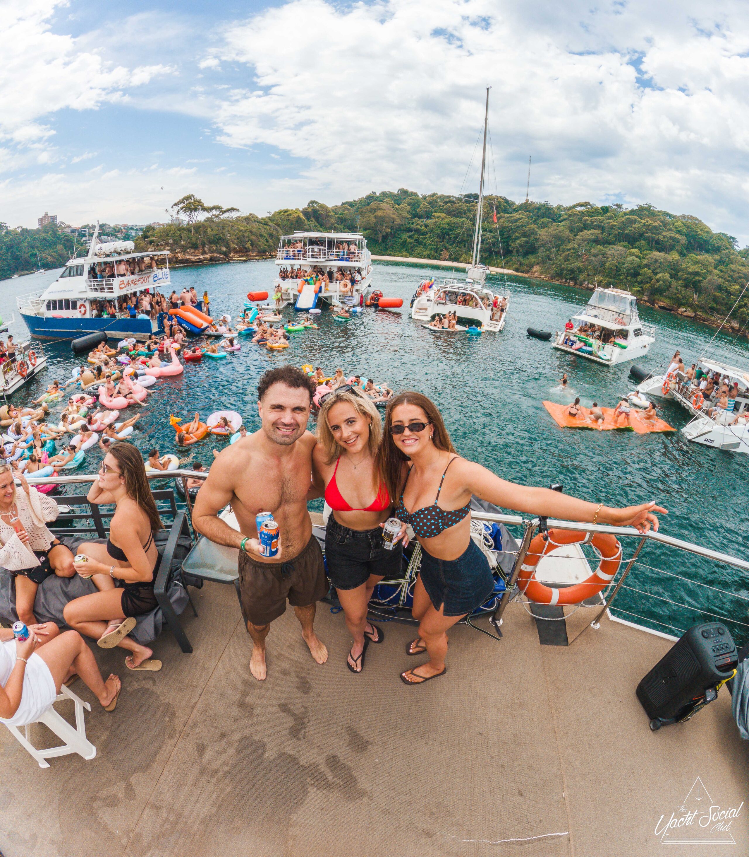 Three friends in swimsuits pose and smile on a boat with drinks in hand, surrounded by other boats and people on inflatables enjoying a lively party on the water under a partly cloudy sky.