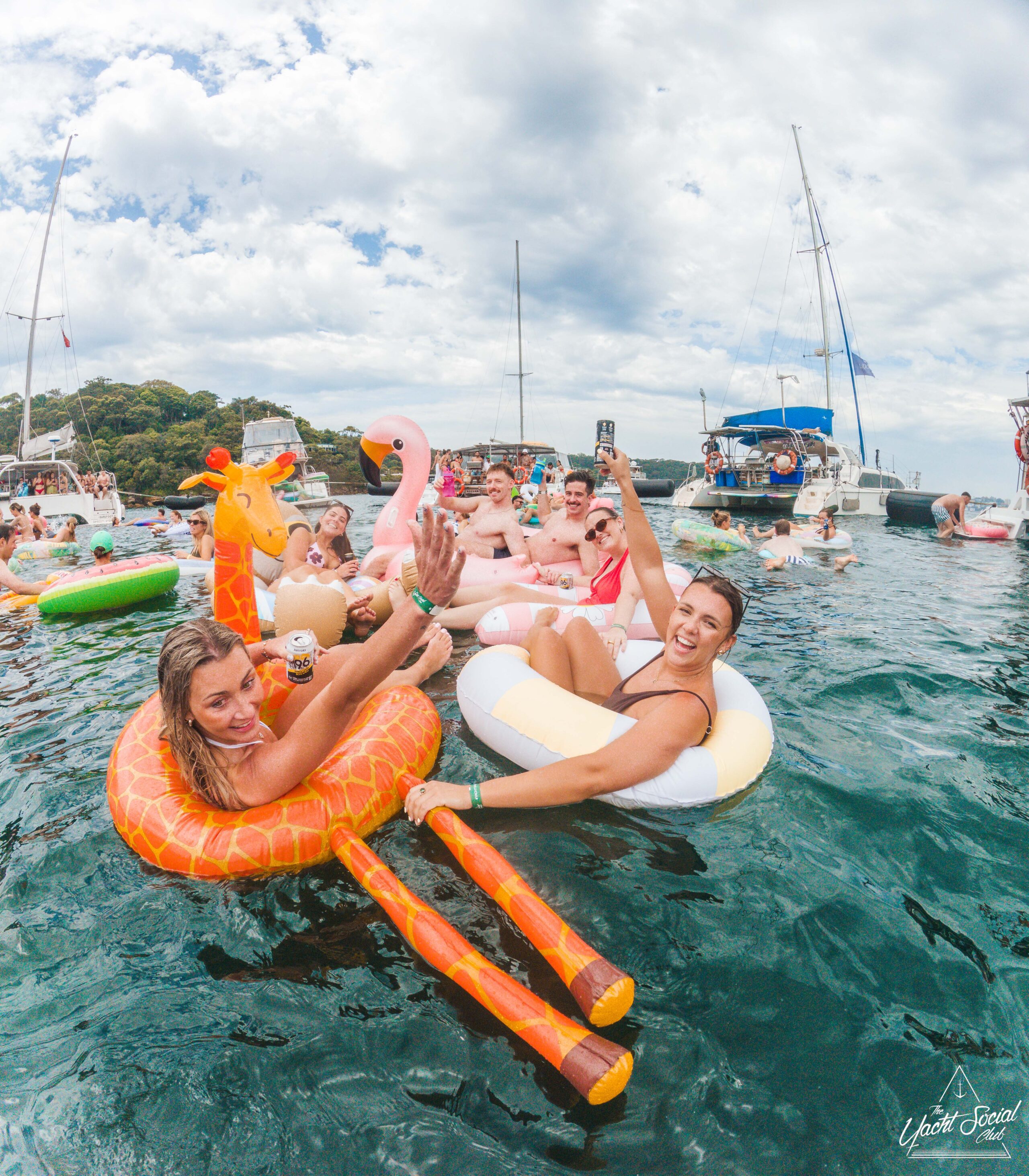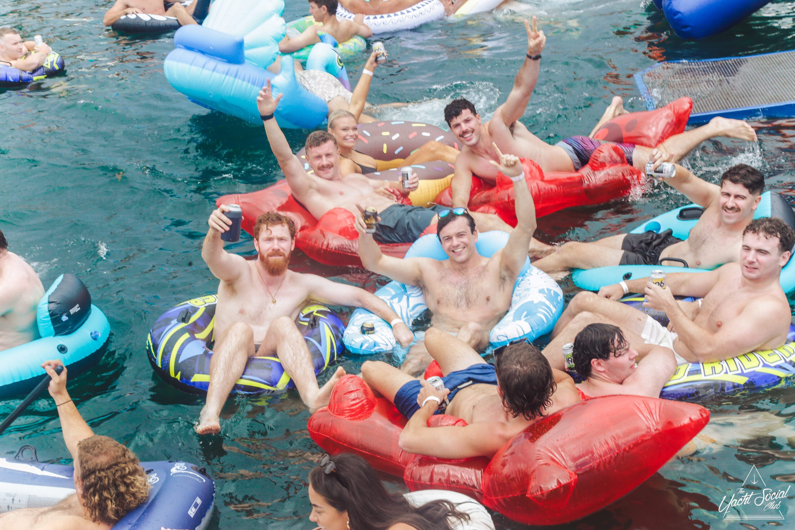 A group of people enjoying a party on colorful inflatable floats in the water, raising drinks and smiling, with boats and a cloudy sky in the background.