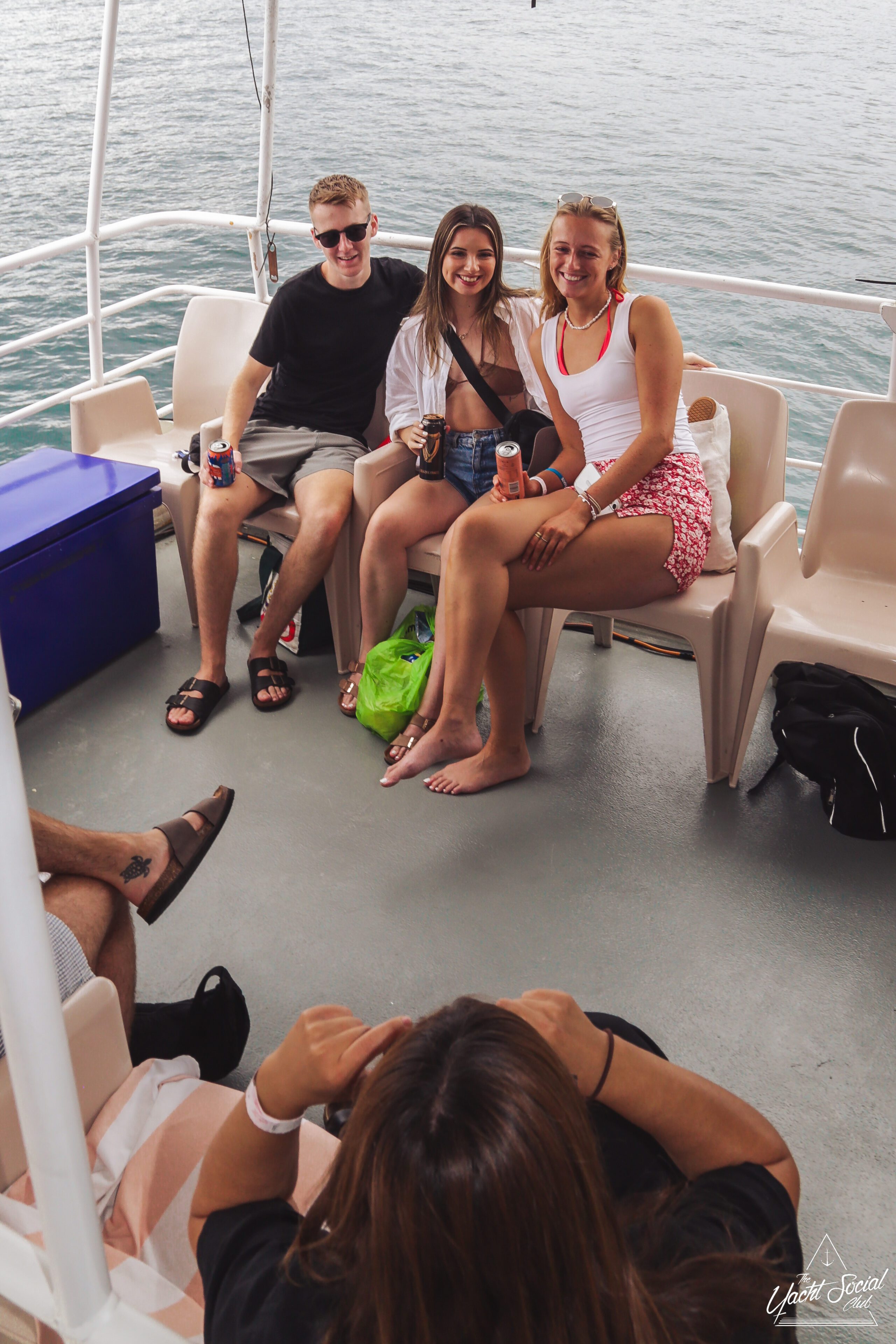 Three young adults enjoying a boat party; a man in a white shirt and a woman in a white bikini top and colorful skirt are smiling, while another woman in sunglasses drinks from a can in the foreground.