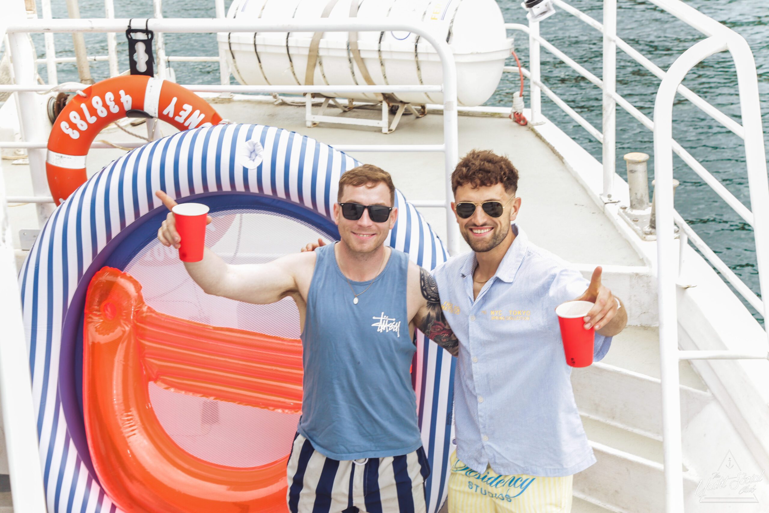 Two men smiling and holding red cups pose on a boat next to a striped inflatable pool float, with life preservers and water in the background. Both wear sunglasses and summer clothes.