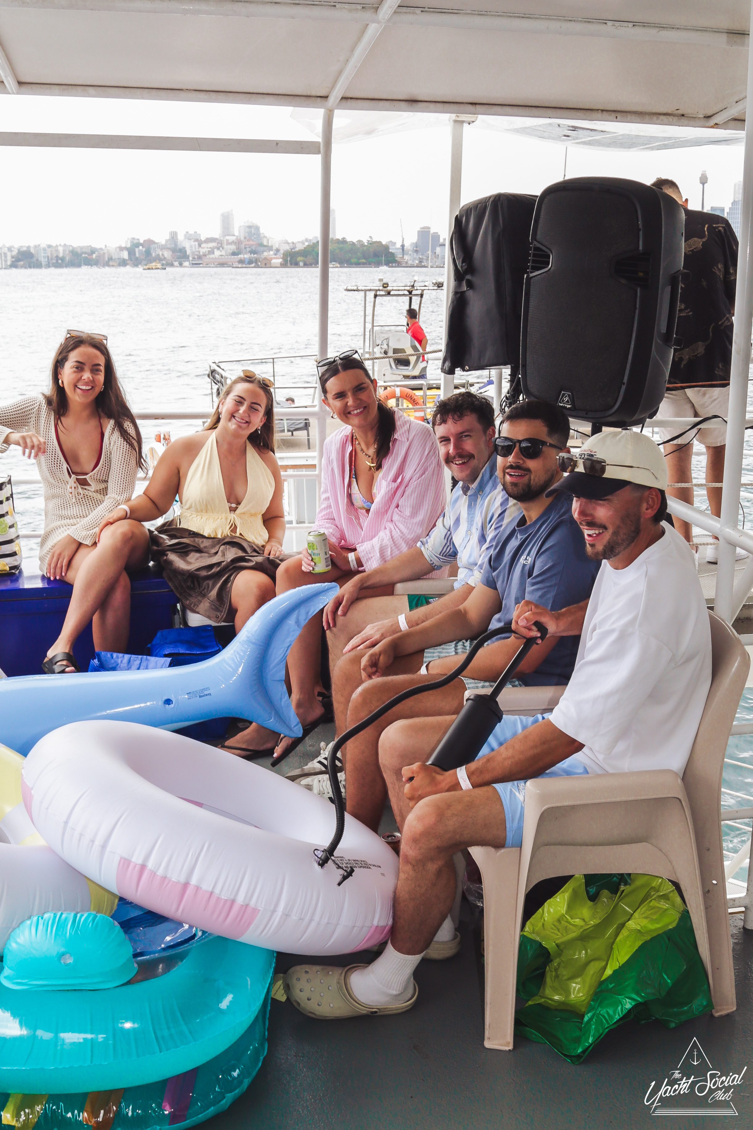 Six people sit and smile together on a boat, surrounded by inflatable pool toys and a speaker. The city skyline and water are visible in the background, creating a relaxed, cheerful atmosphere.