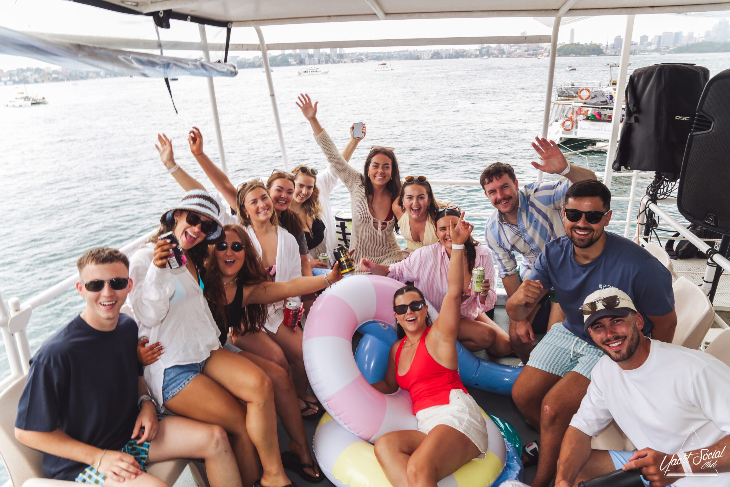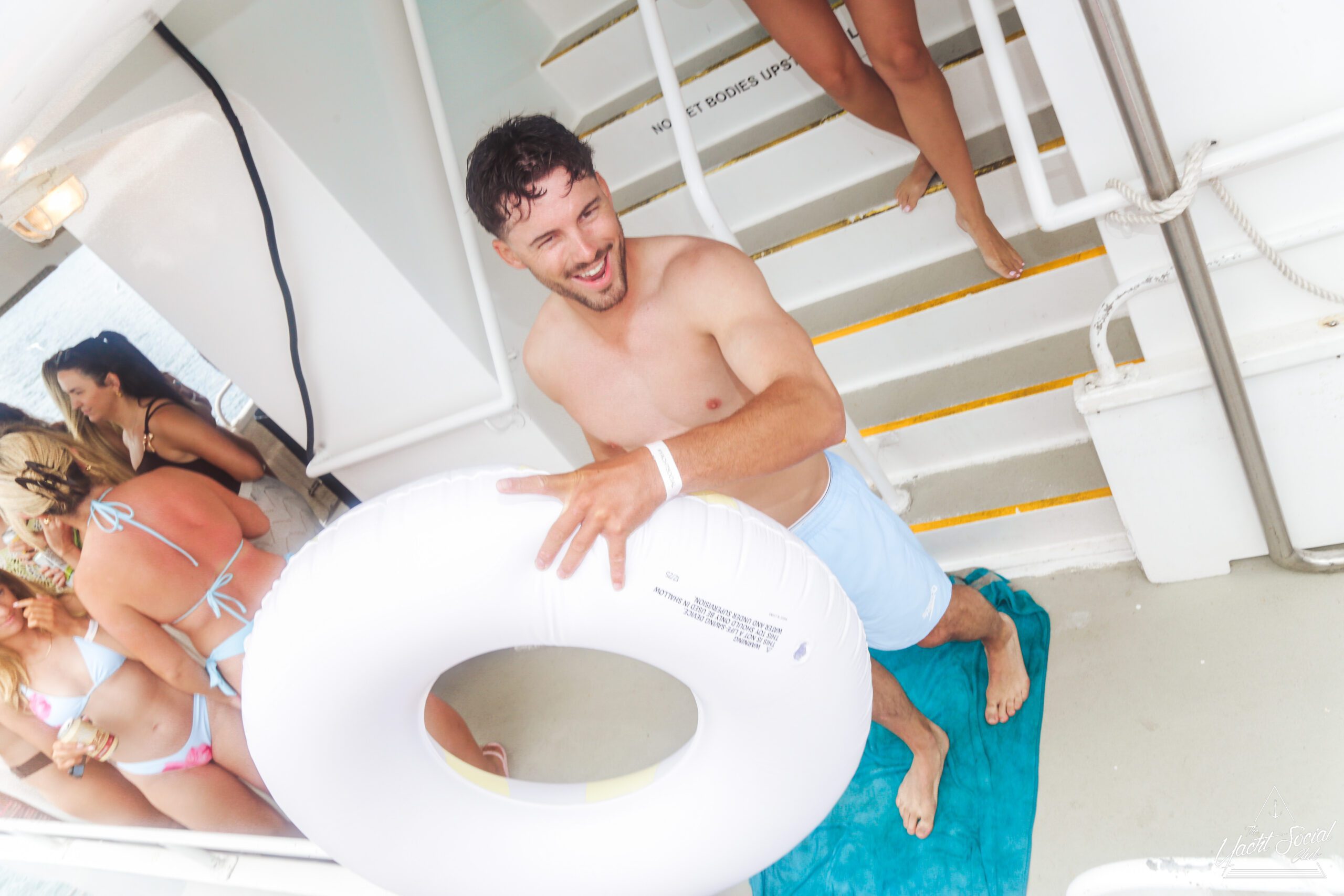 A group of young adults enjoy a boat party, holding drinks and smiling. Inflatable pool floats are stacked in the background, and the boat is surrounded by water. The mood is lively and festive.