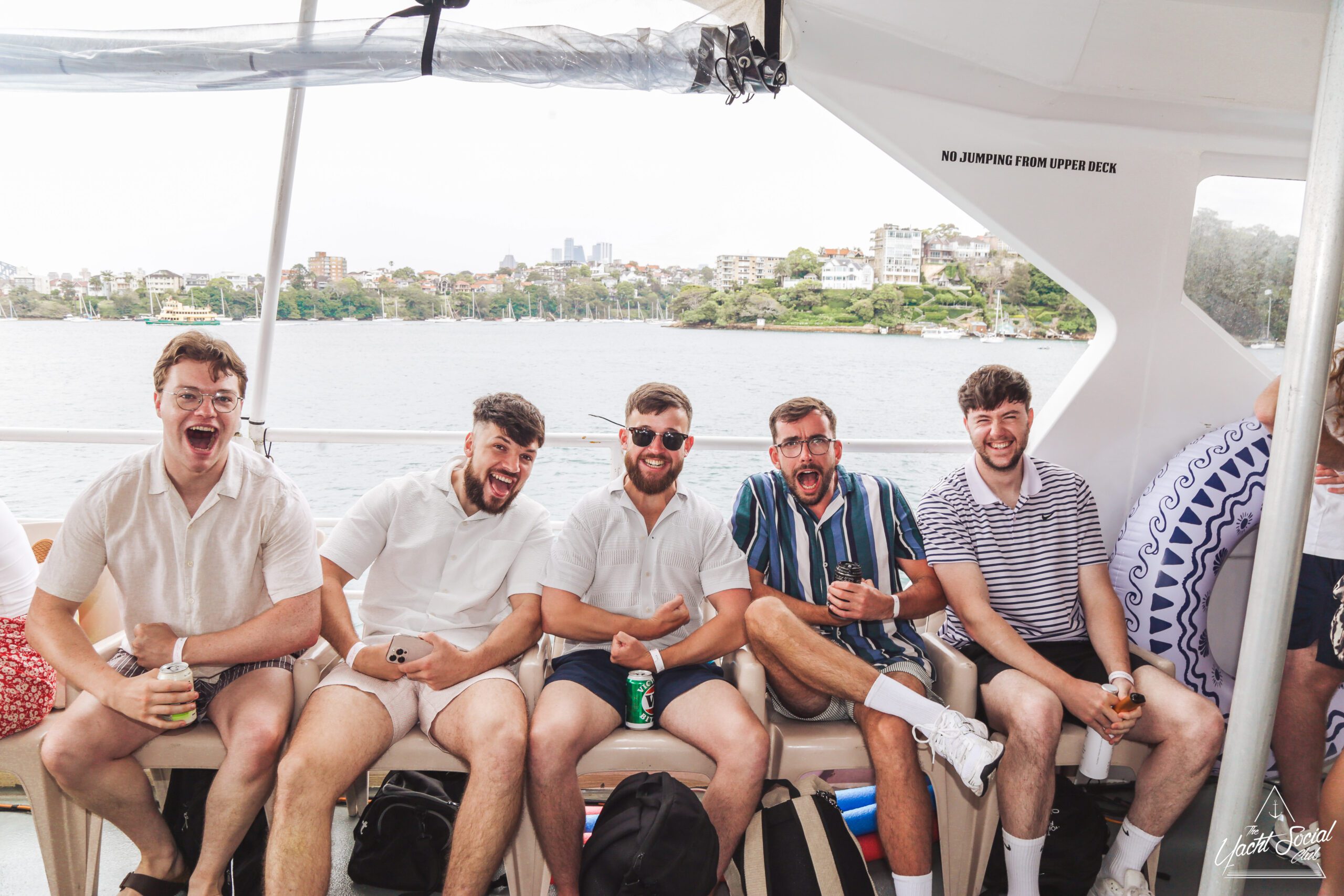 Five young men sit on a boat bench, smiling and laughing together. They are casually dressed in shorts and shirts, holding drinks, with water and city buildings visible in the background.